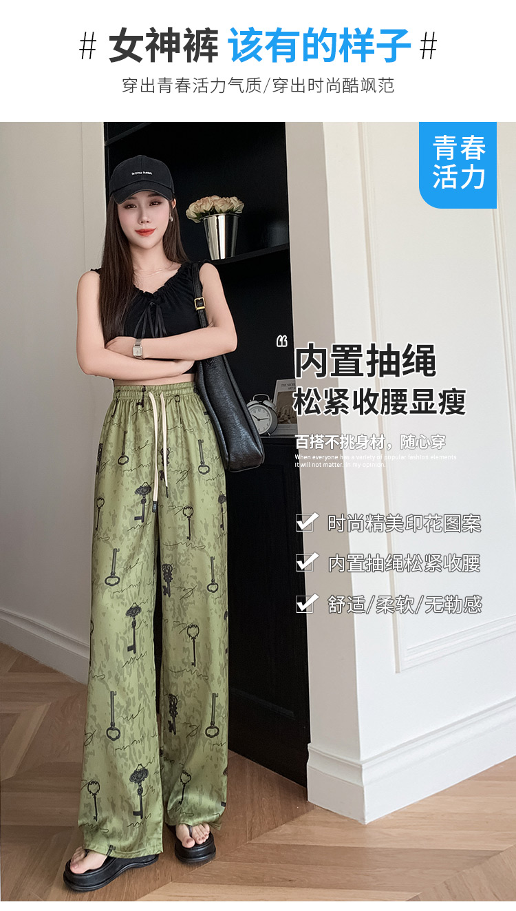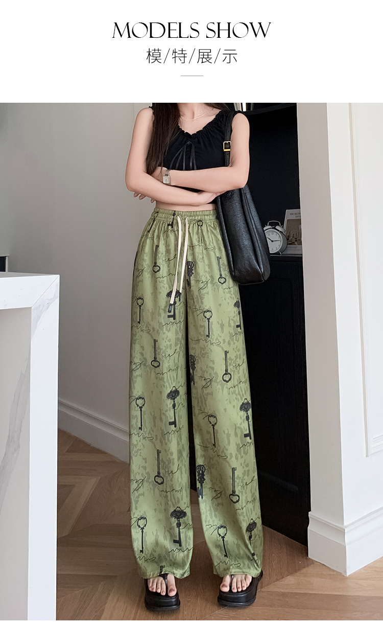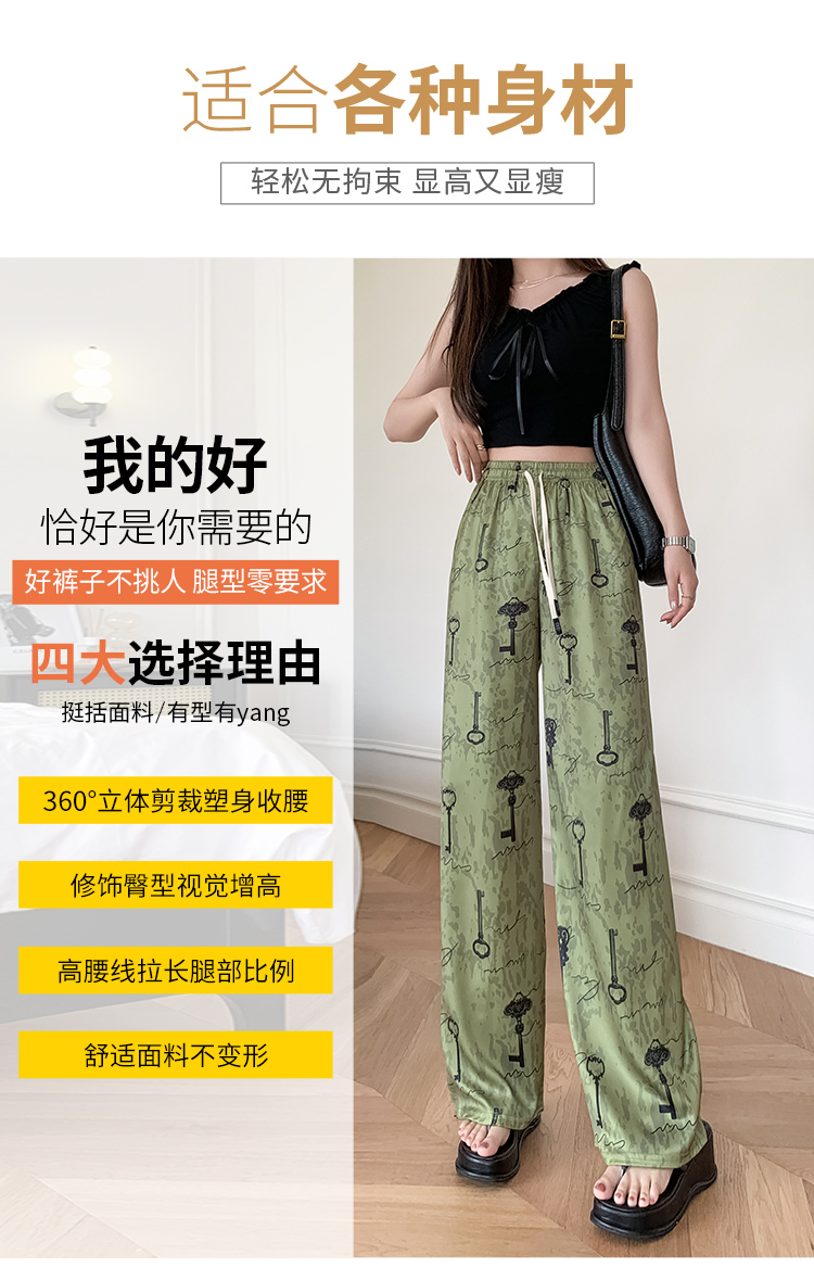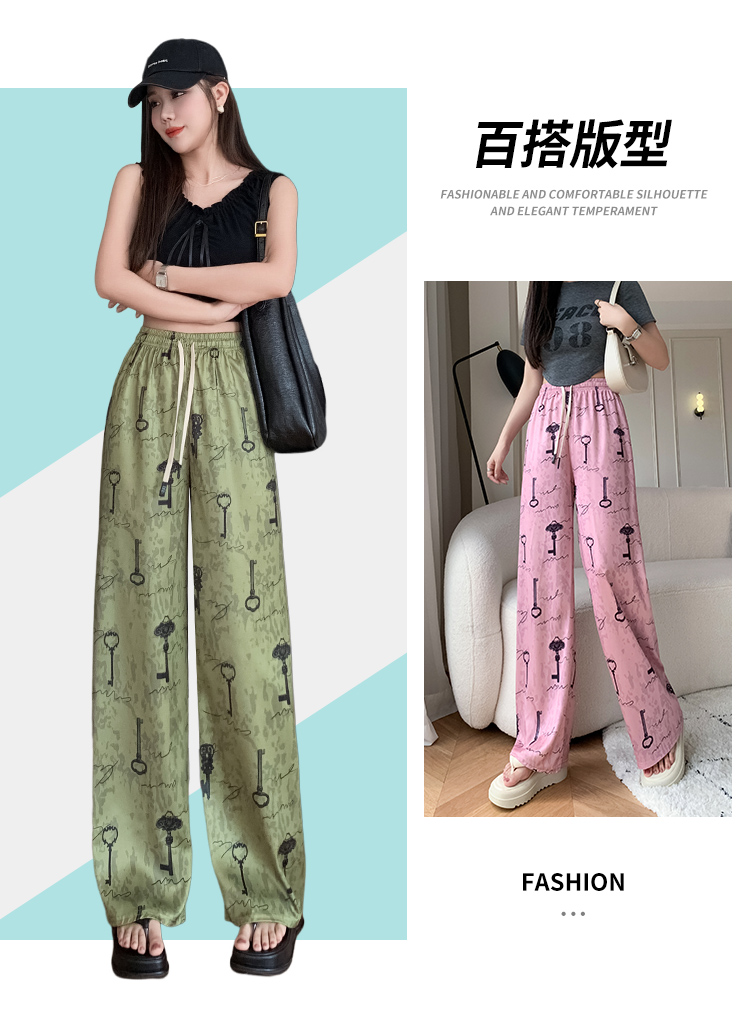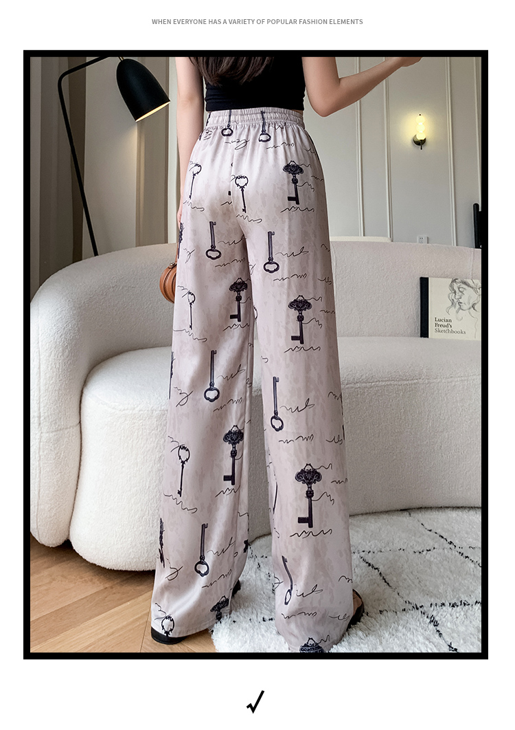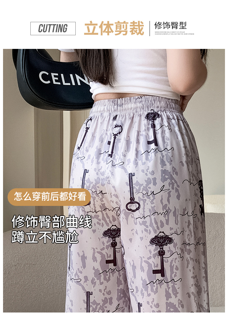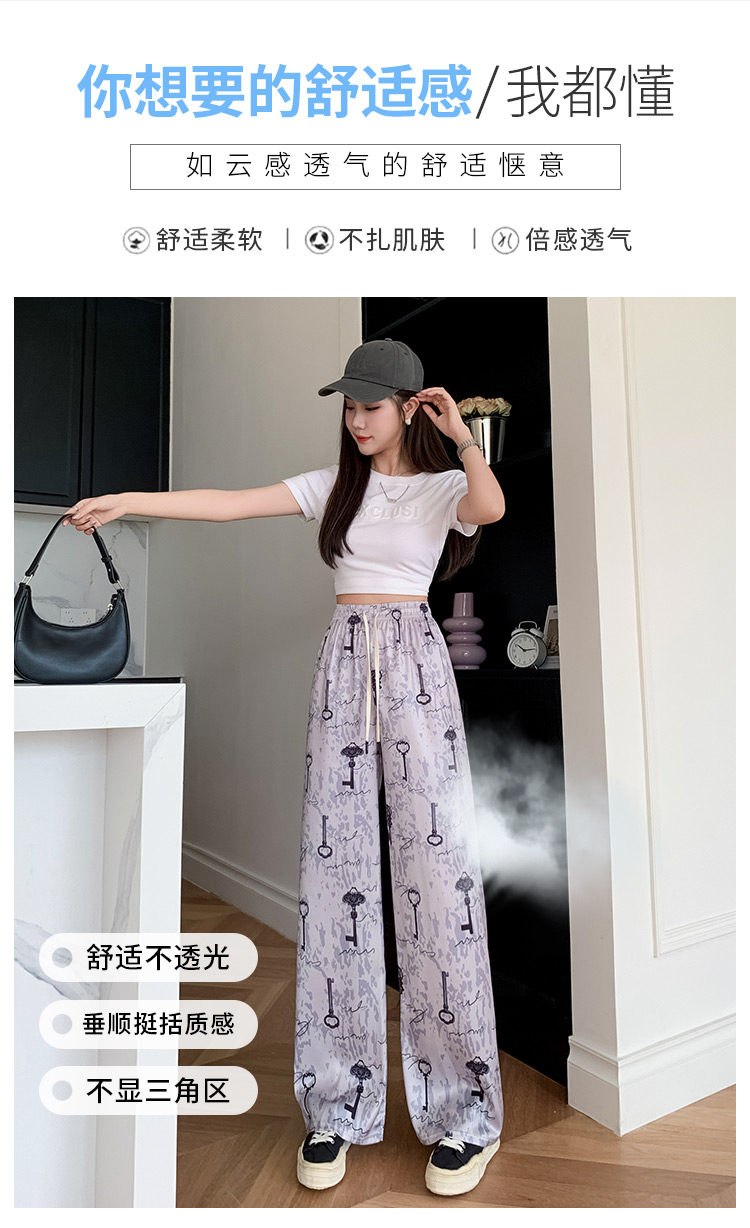 RM9708#阔腿裤女夏季薄款宽松直筒显瘦高腰垂感印花缎面休闲拖地裤子