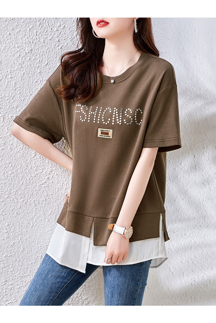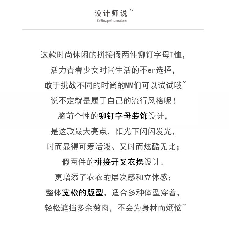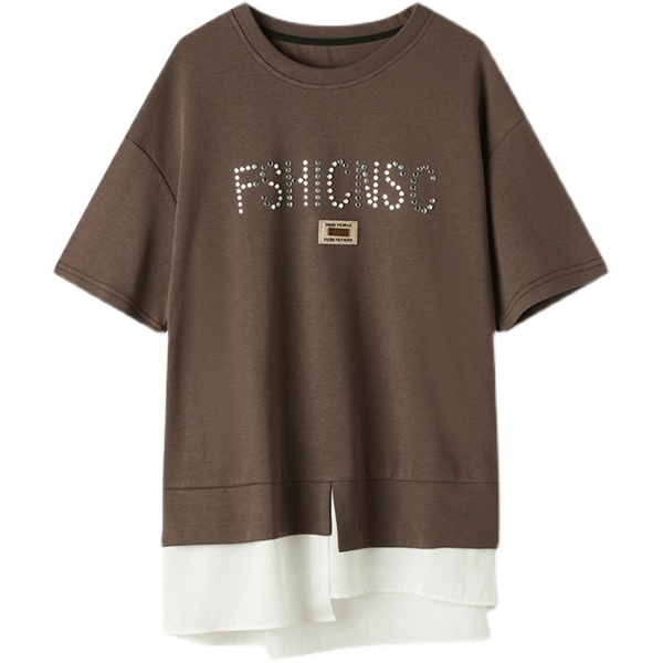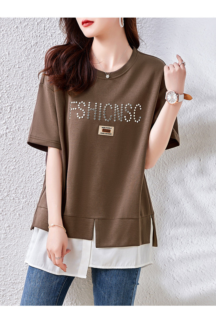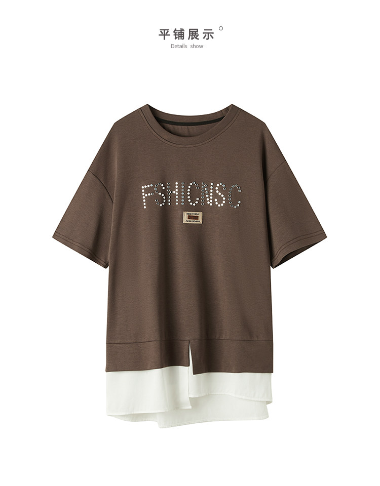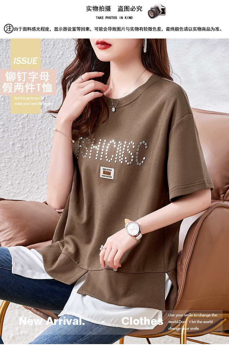 RM9819#欧洲站大码新款假两件铆钉字母短袖T恤上衣宽松胖妹妹女装