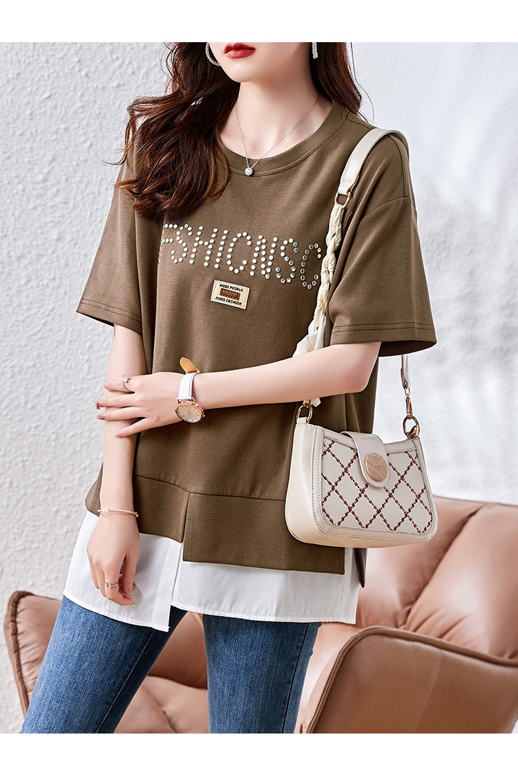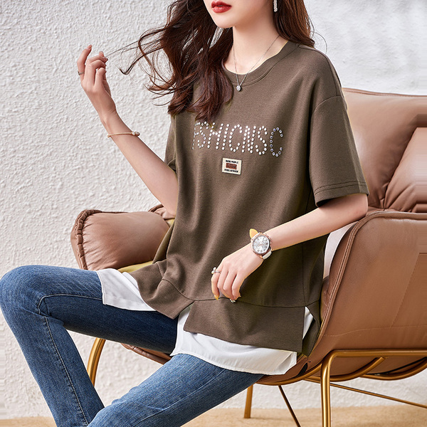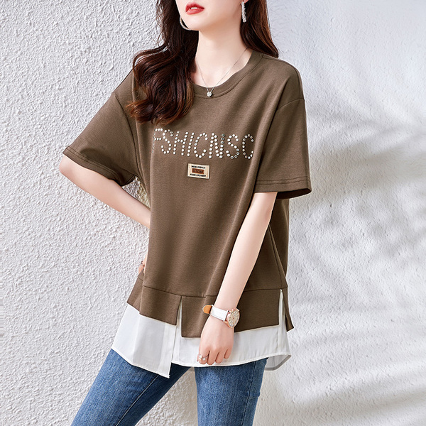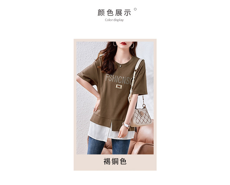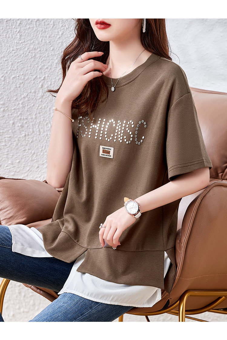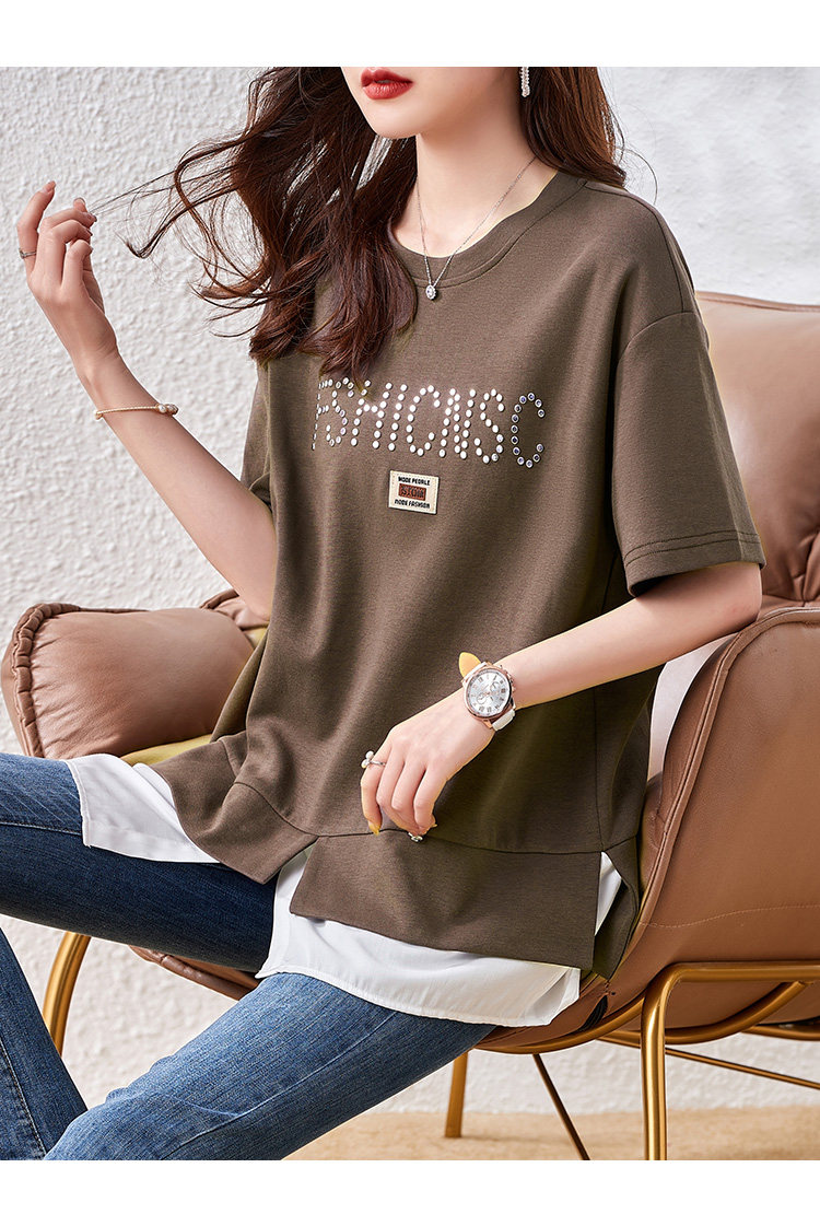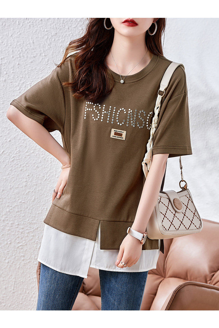 RM9819#欧洲站大码新款假两件铆钉字母短袖T恤上衣宽松胖妹妹女装