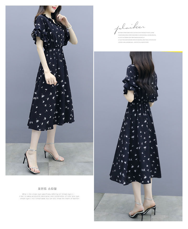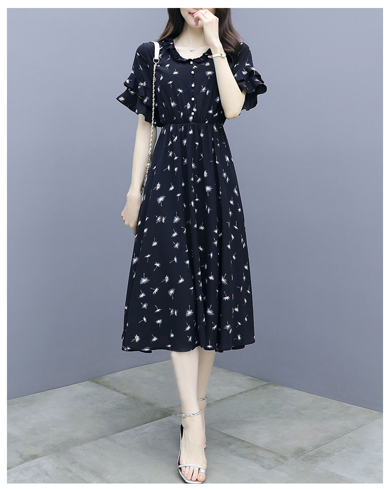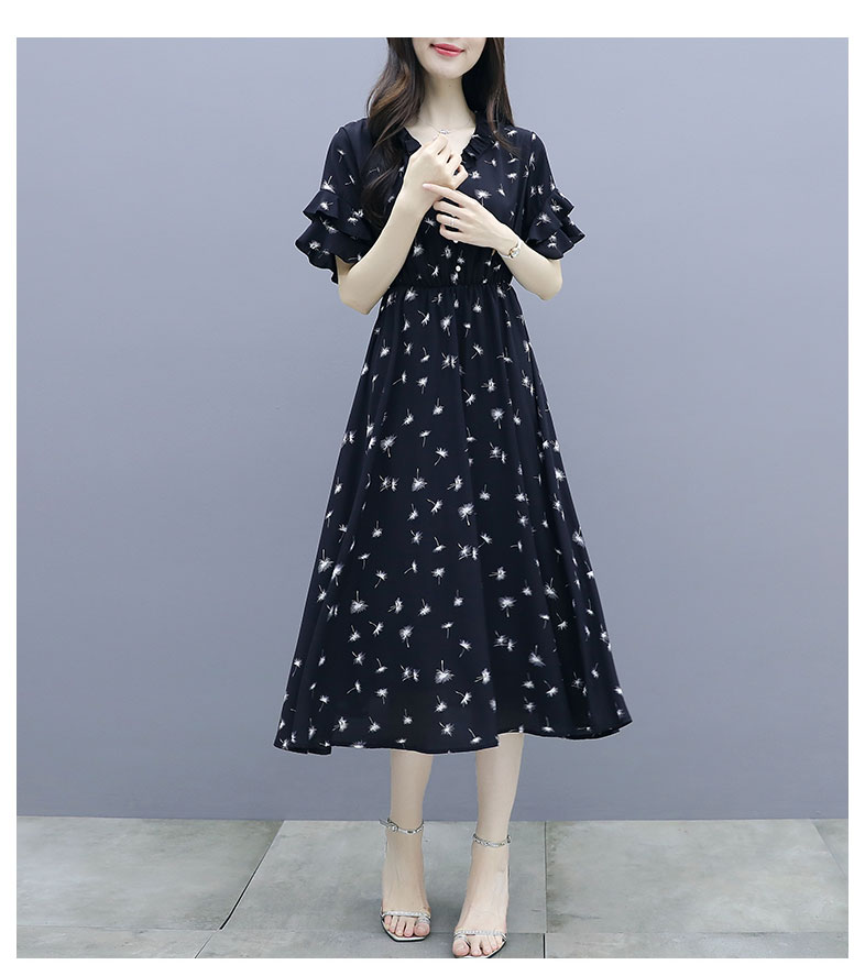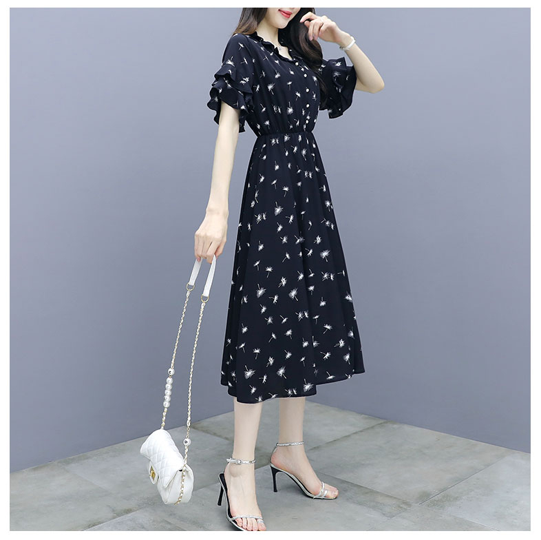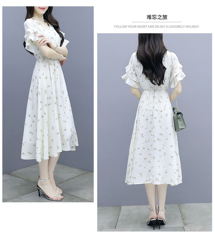 RM9910#碎花连衣裙女中长款2022年夏季复古收腰长裙短袖雪纺裙子气质