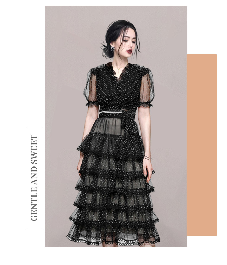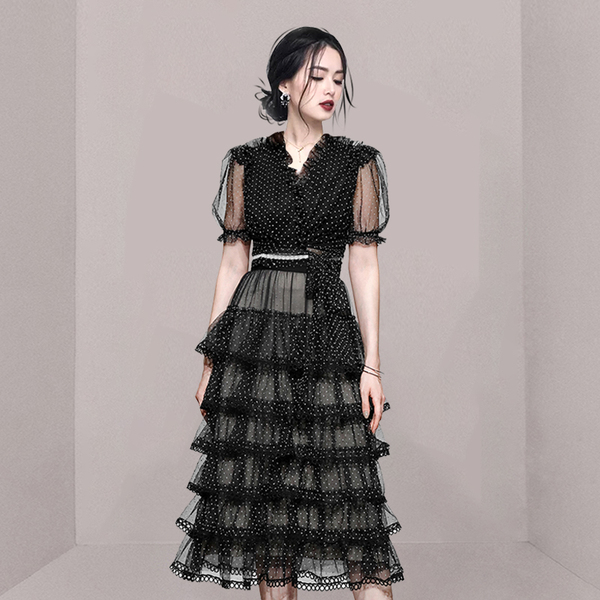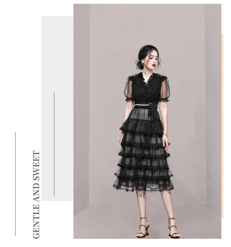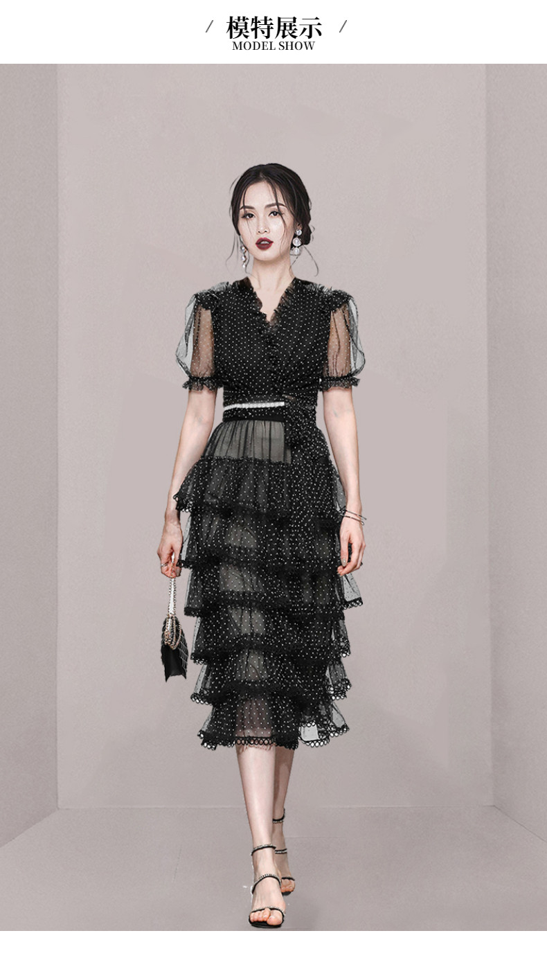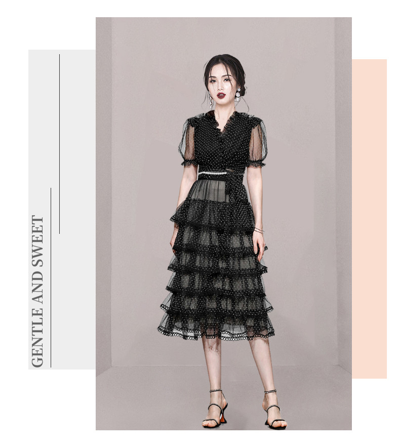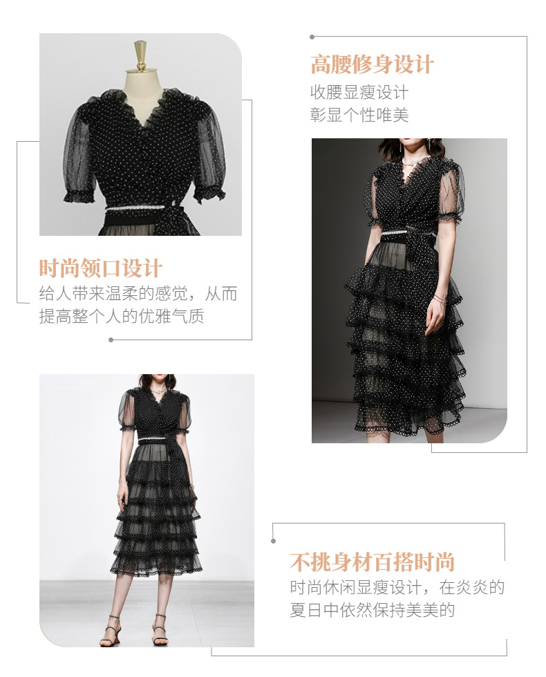RM9923#夏季新款时尚V领泡泡袖网纱波点黑色上衣+蛋糕半身裙套