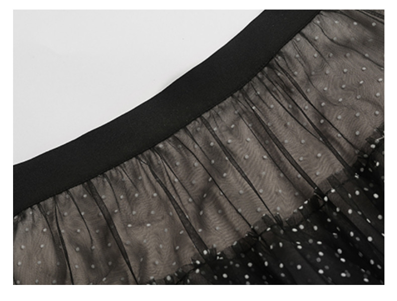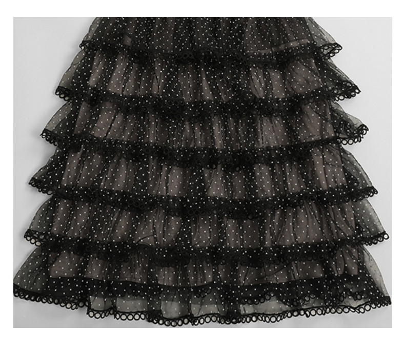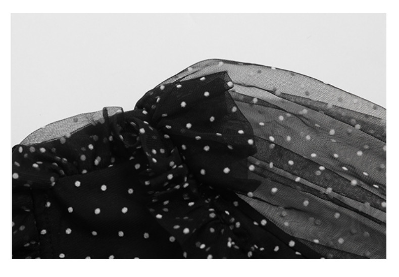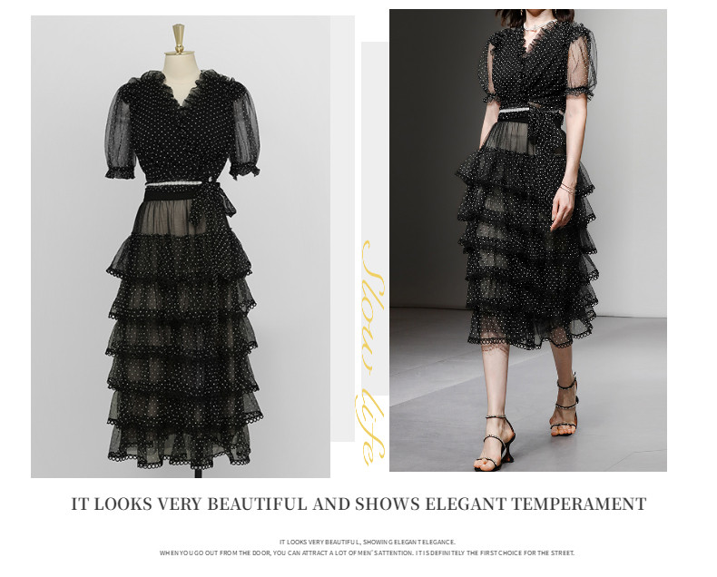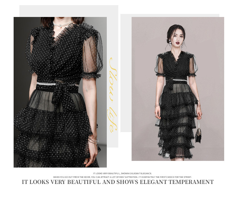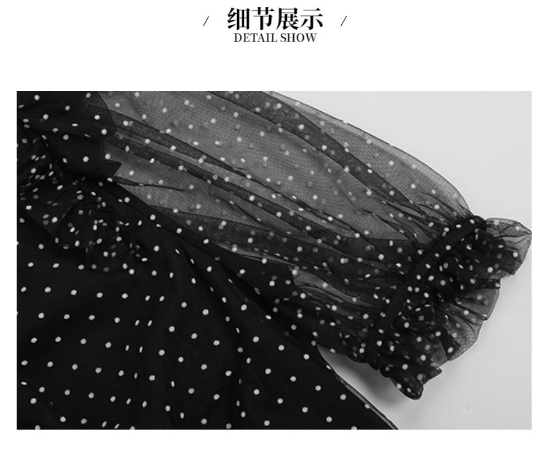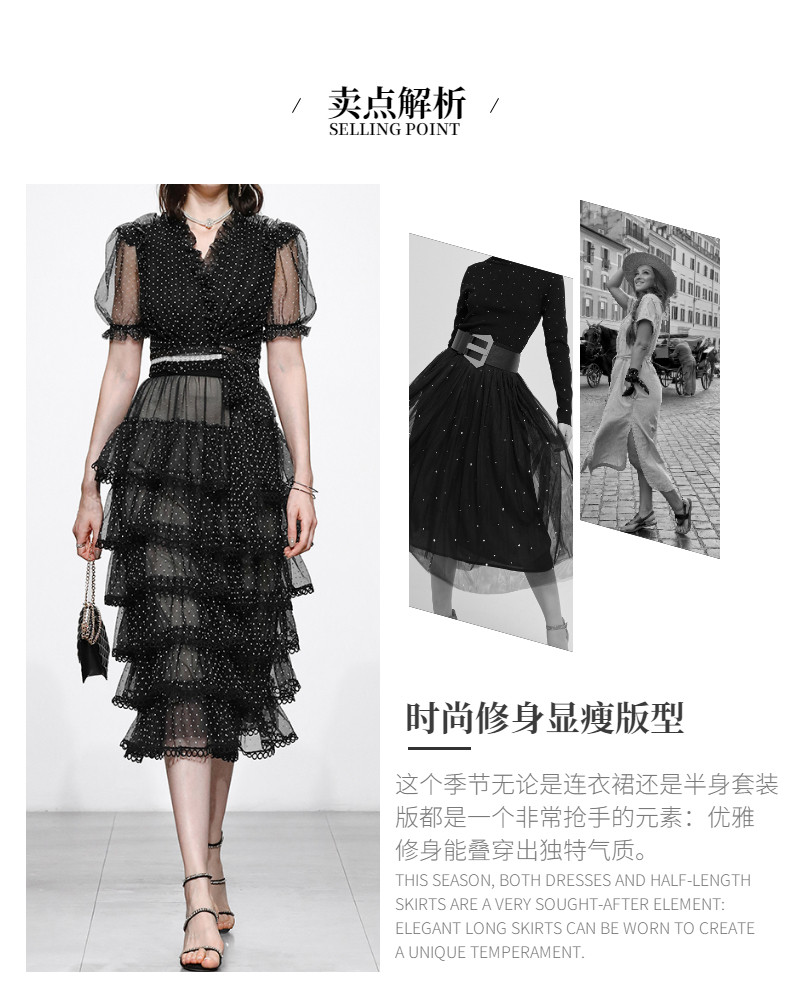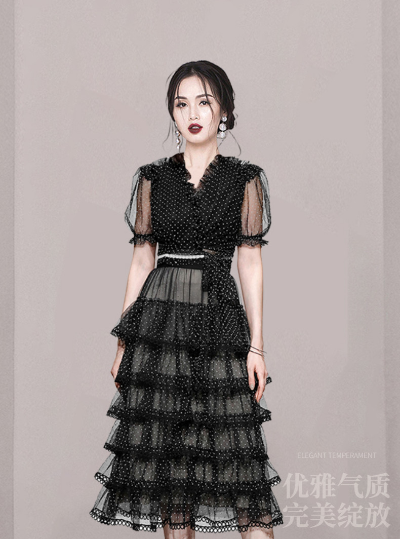 RM9923#夏季新款时尚V领泡泡袖网纱波点黑色上衣+蛋糕半身裙套