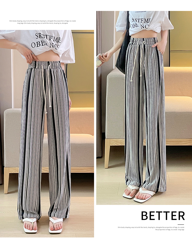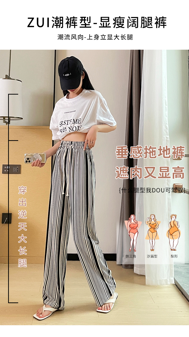 RM9991#高品质窄版冰丝竖条纹阔腿裤高腰垂感宽松休闲直筒裤