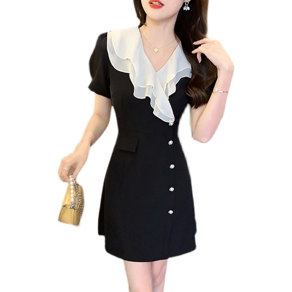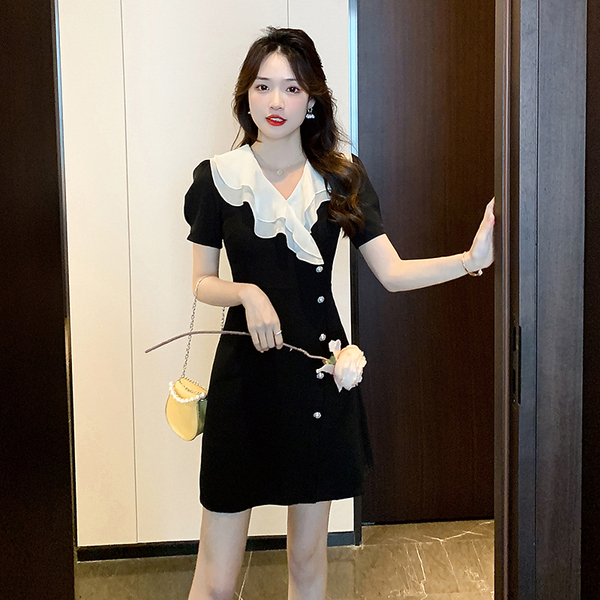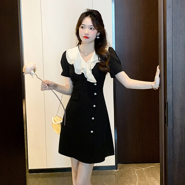RM10015#短袖法式气质连衣裙2023夏季新款收腰显瘦韩版中长款小个子小黑裙
