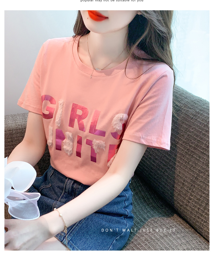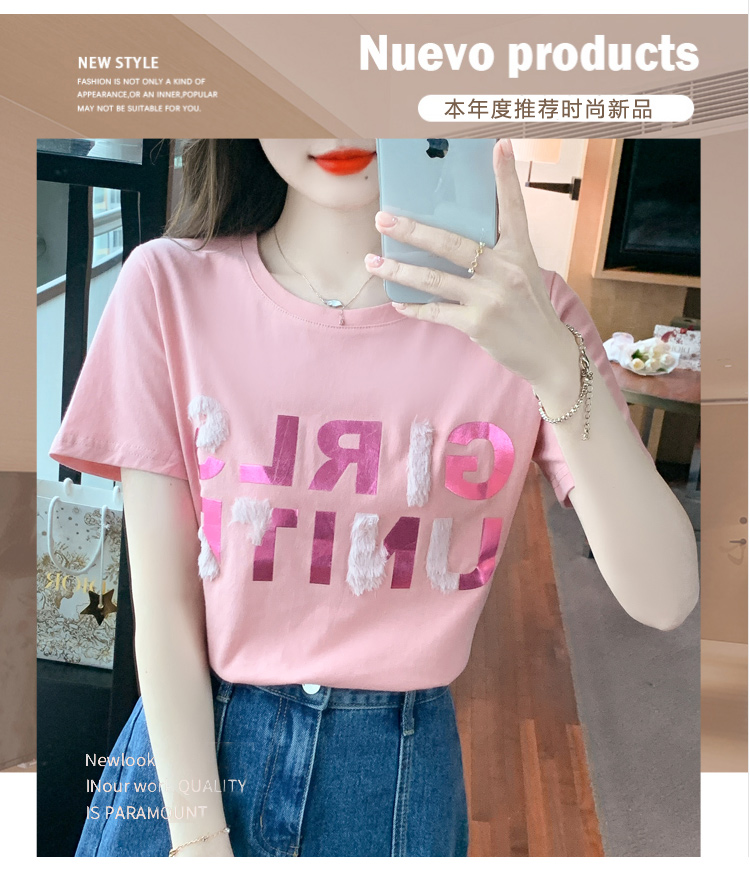 RM10571#夏季新款圆领套头纯棉T恤粉色甜美减龄短袖字母上衣女