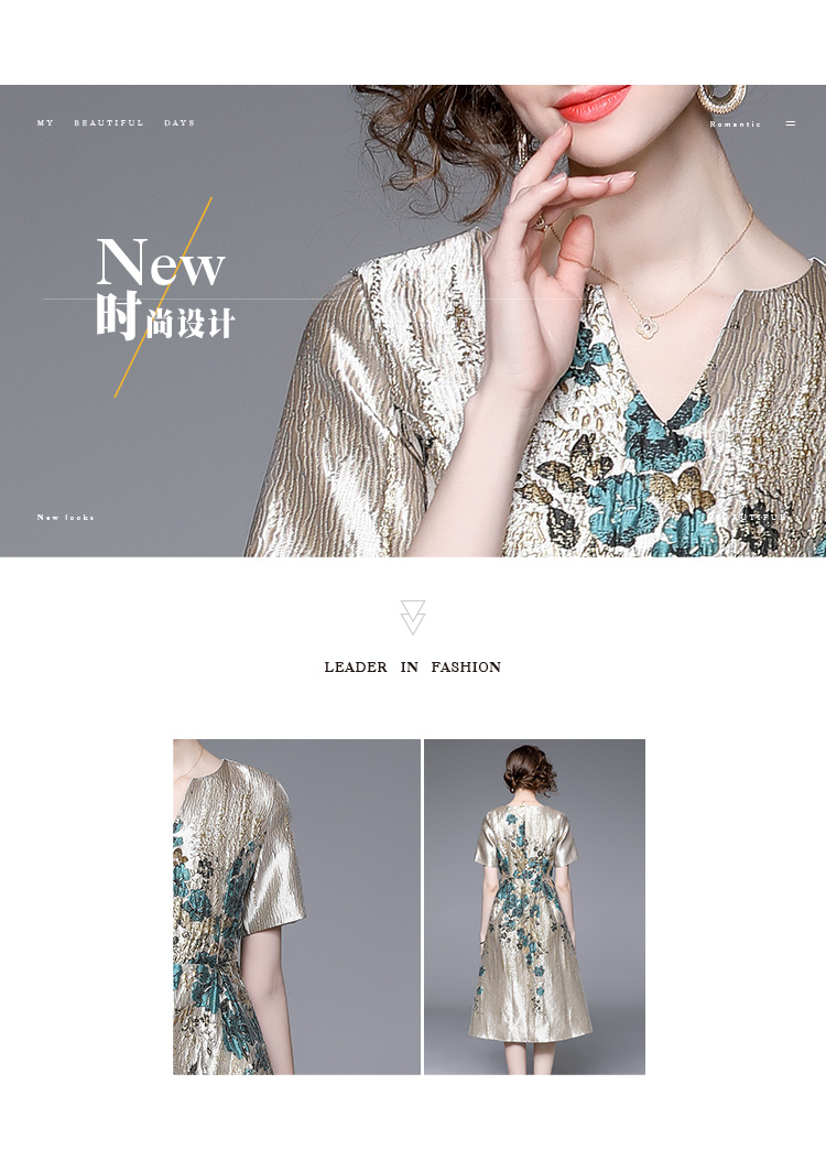 RM10583#新款高腰大摆名媛气质重工提花v领短袖连衣裙