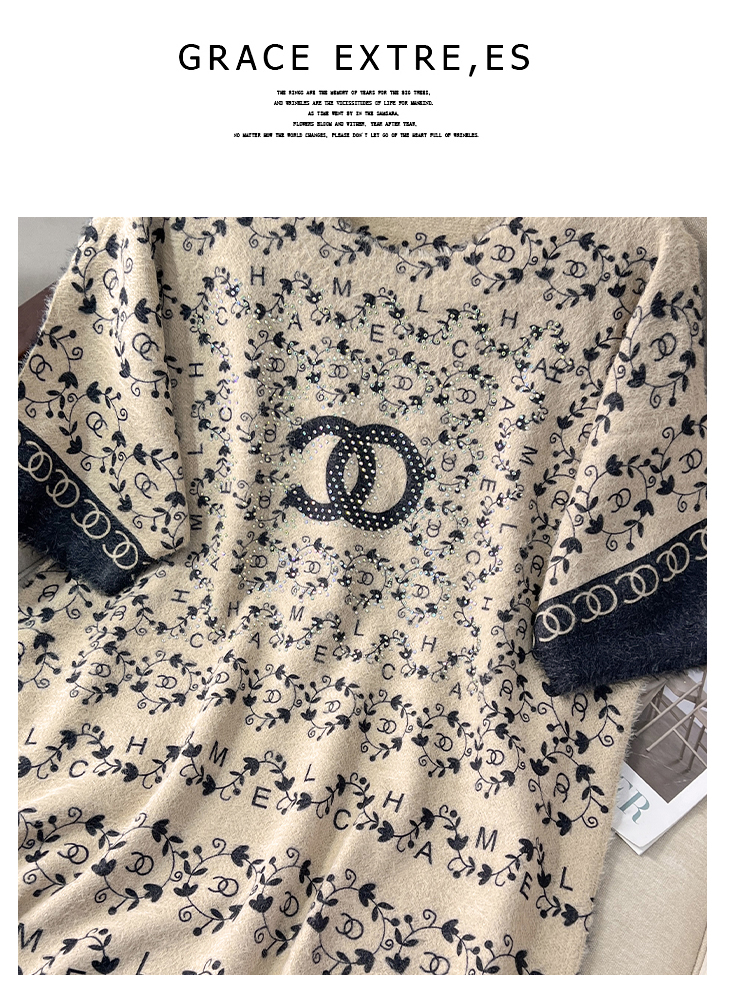 RM10665#重工镶钻字母印花连衣裙短袖貂毛针织连衣裙百搭中长裙
