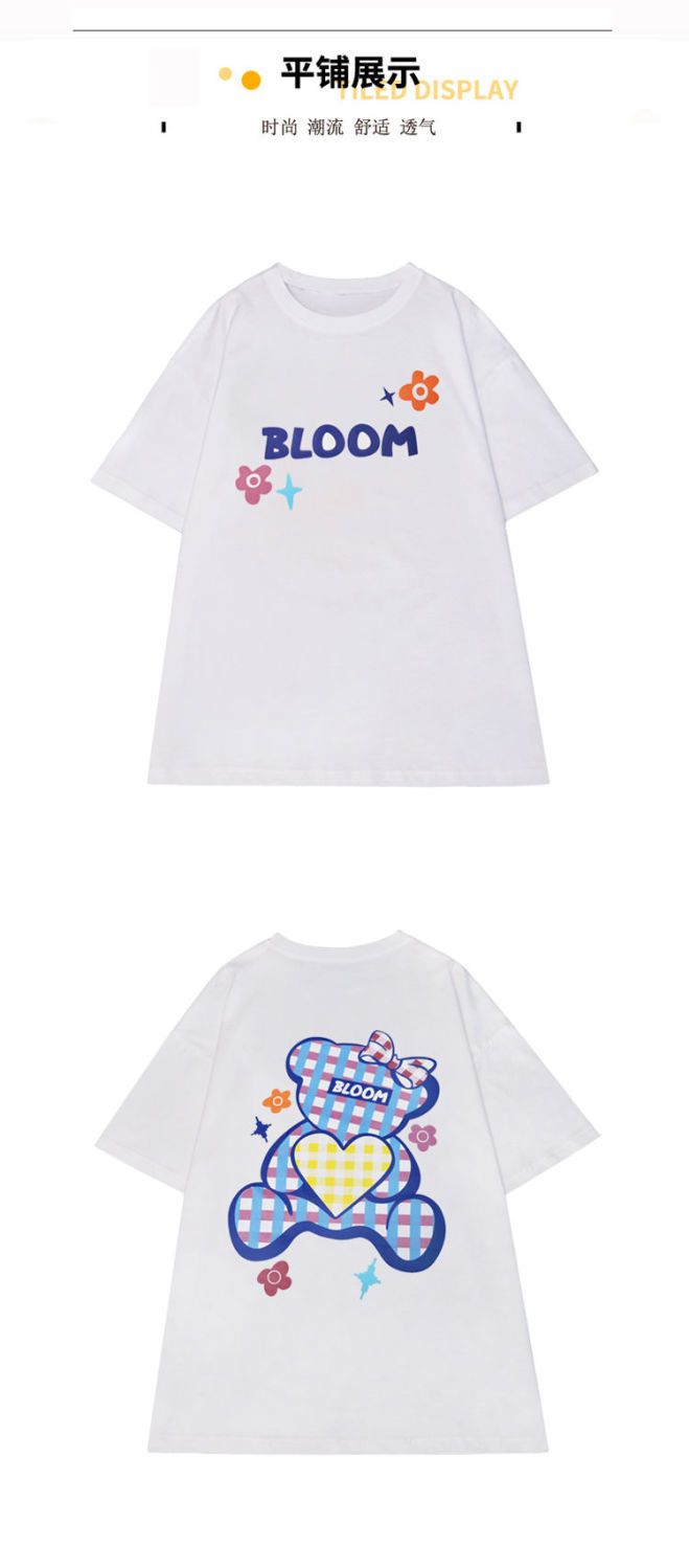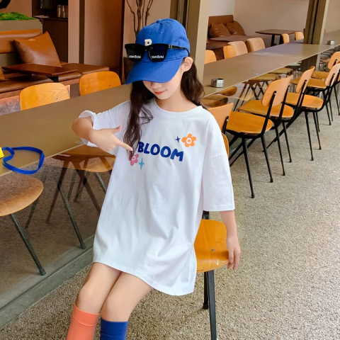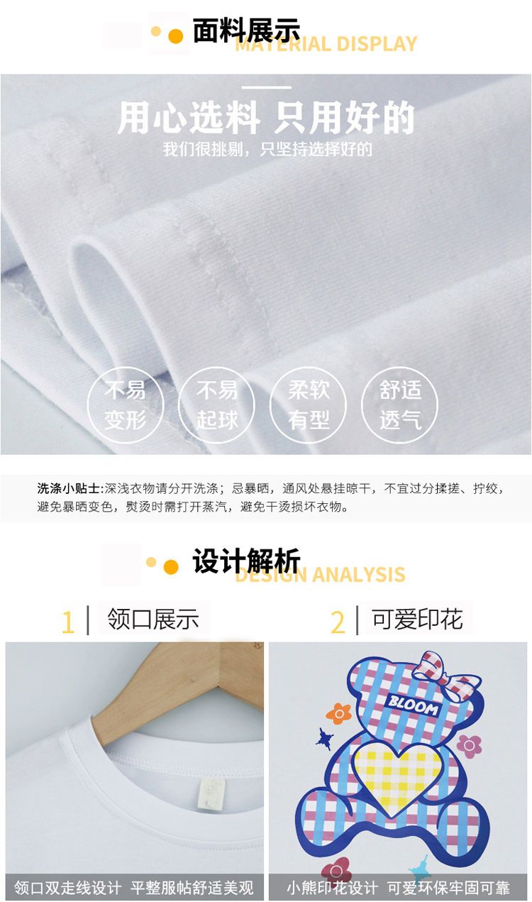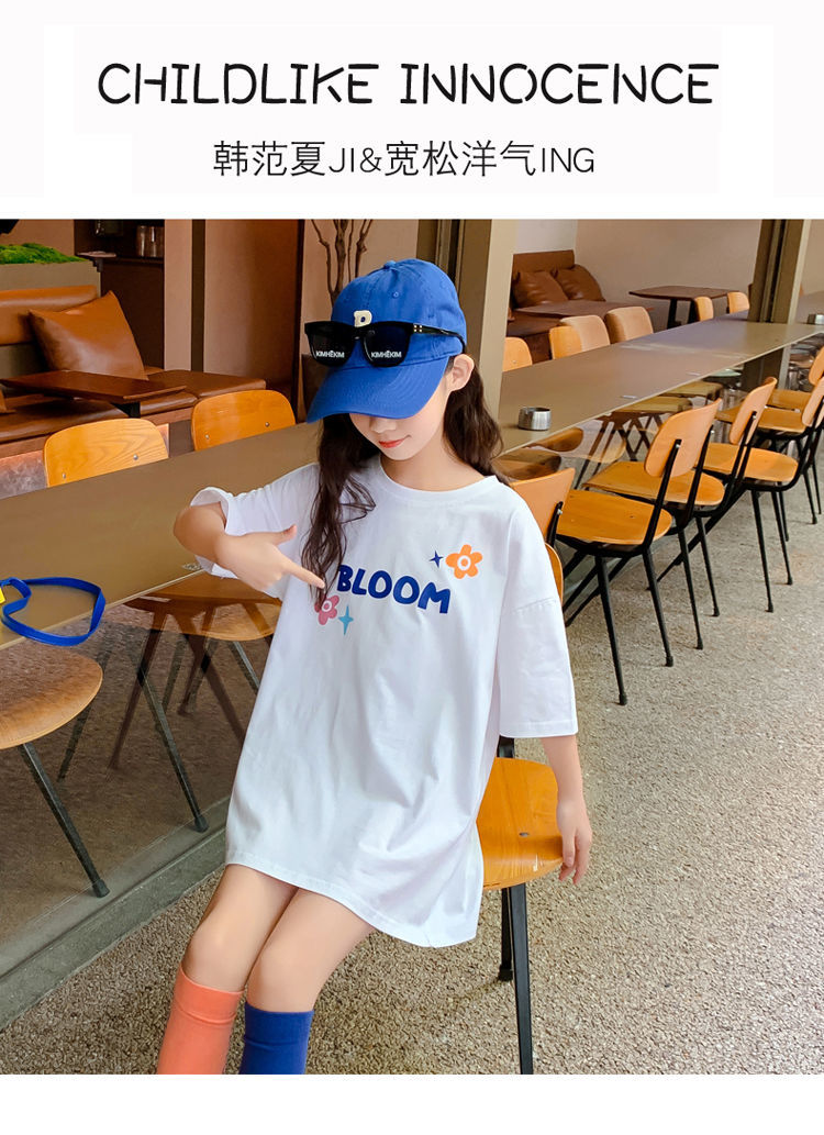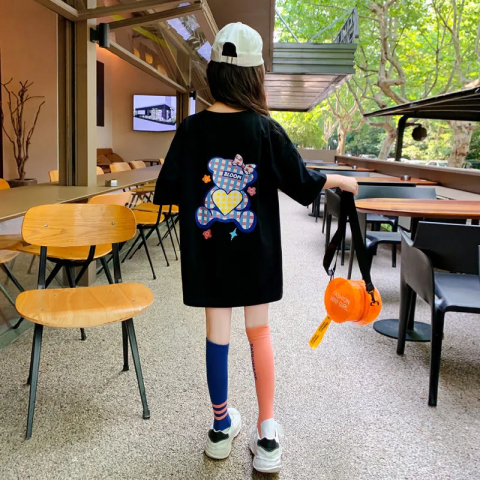 RM25541#26支100%棉女童短袖t恤夏2023新款休闲中大童夏装小熊中长款上衣