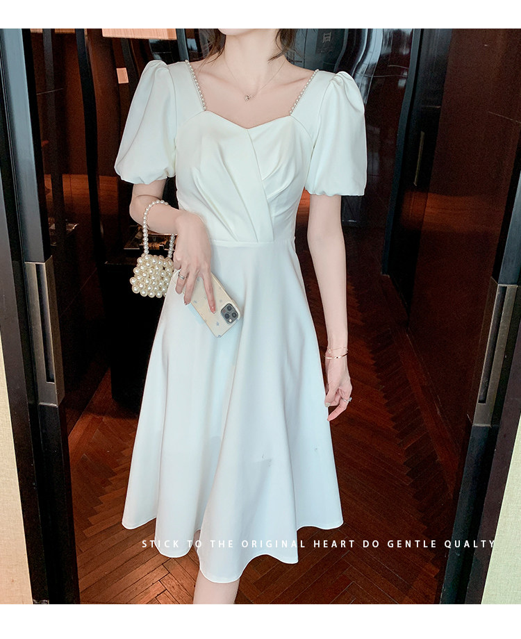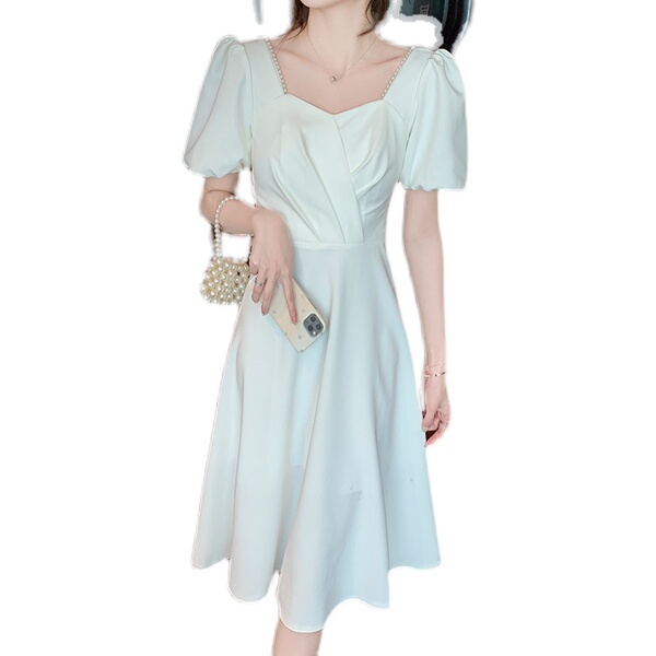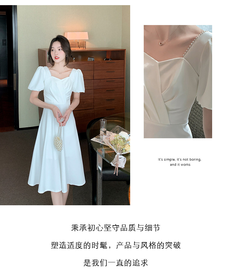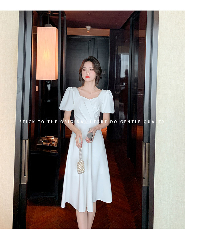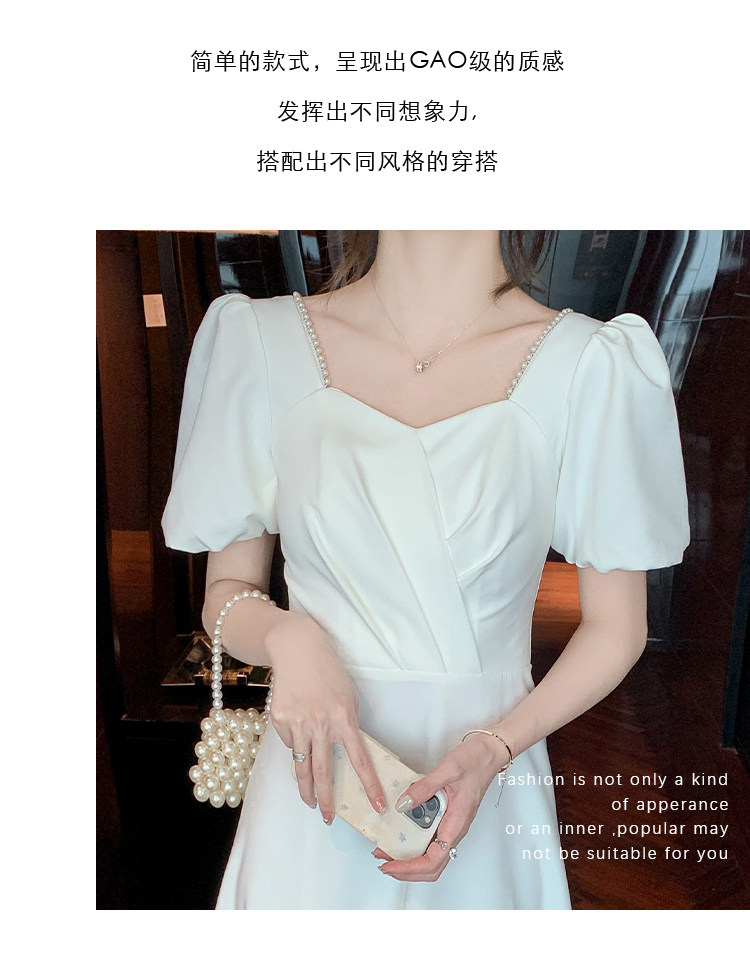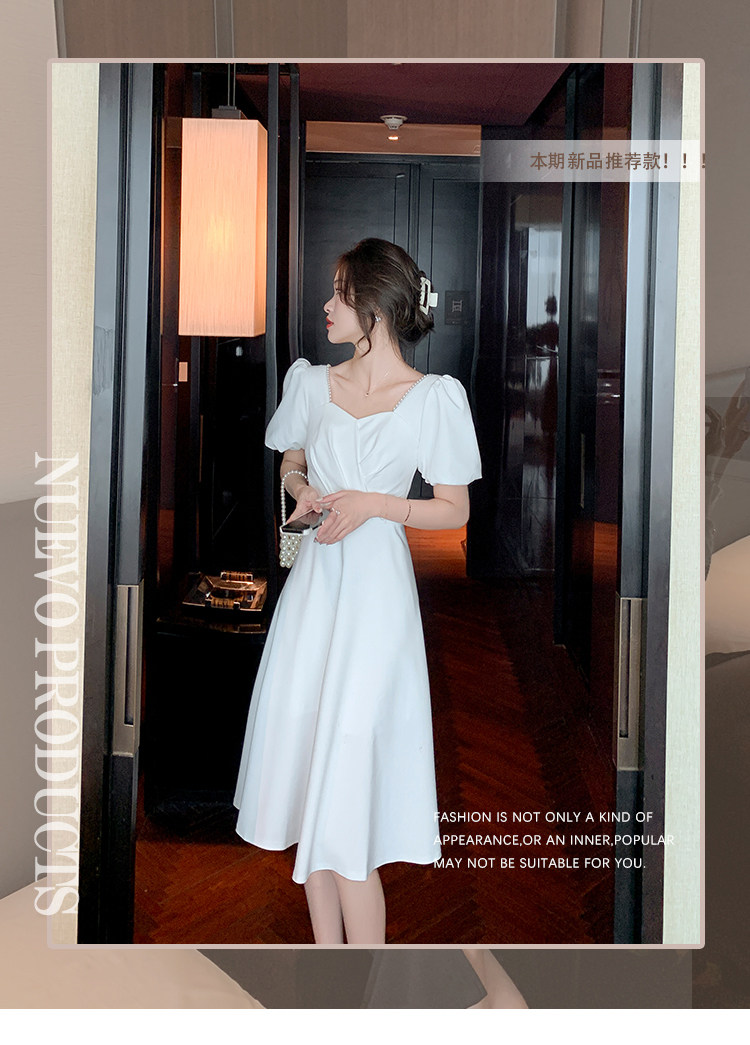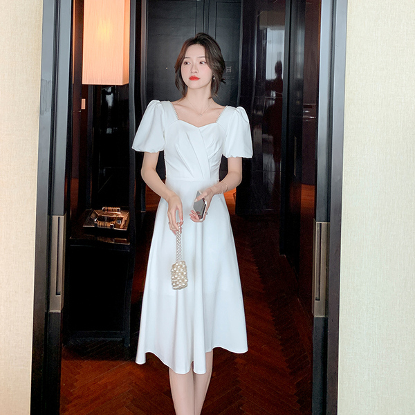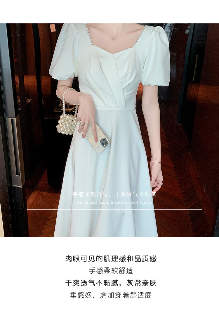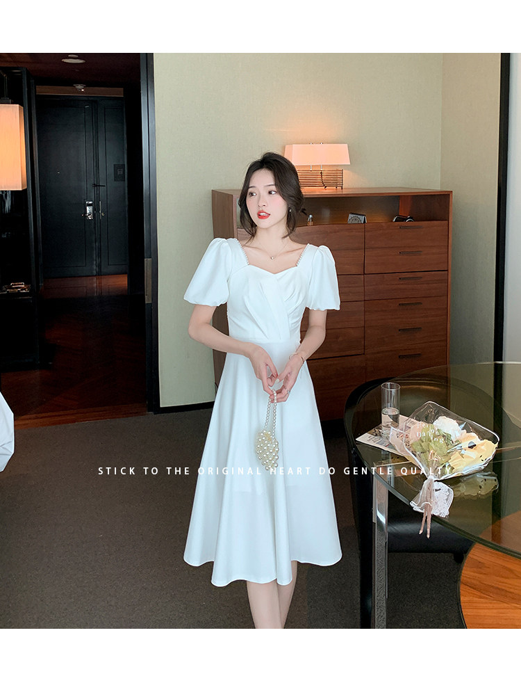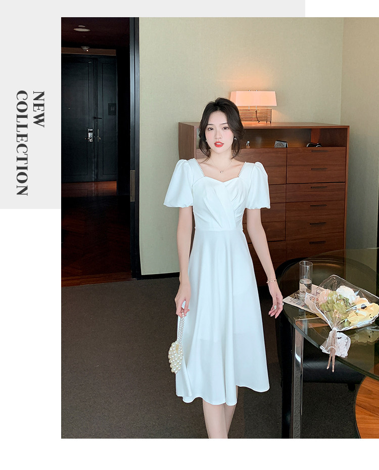 RM11558#白色礼服女宴会小个子法式轻奢中长款连衣裙方领泡泡袖可穿