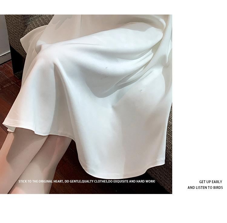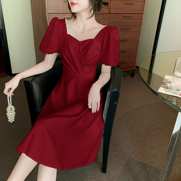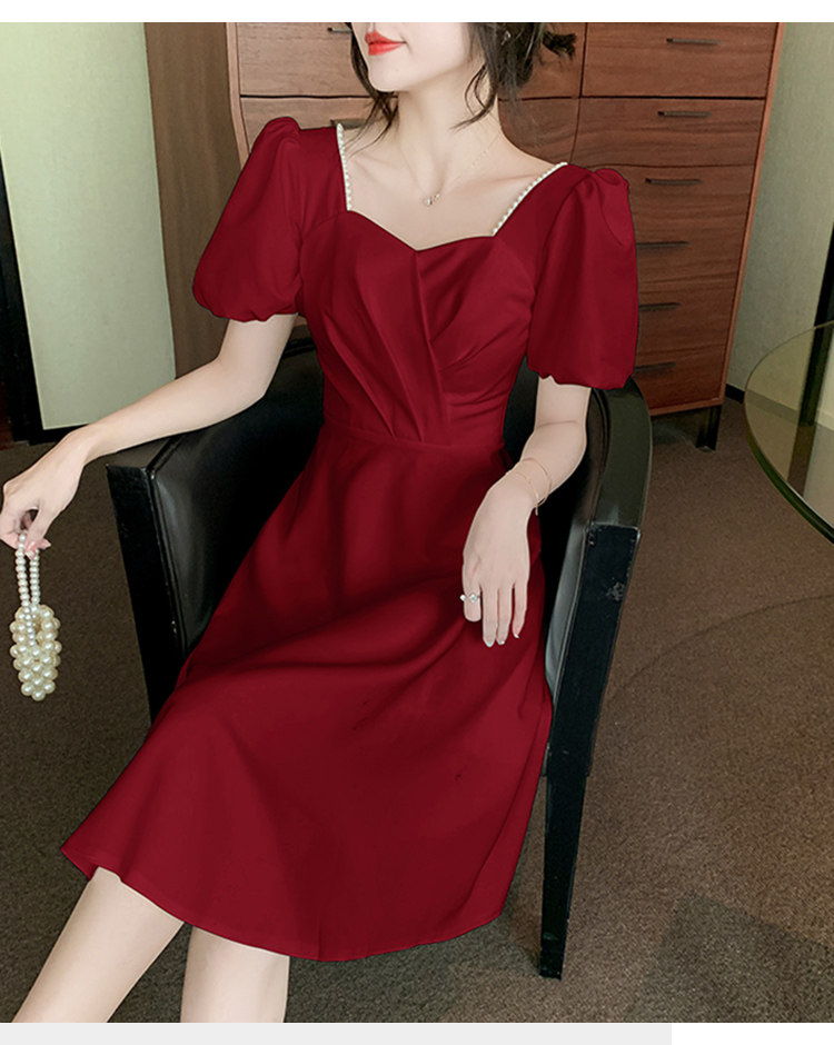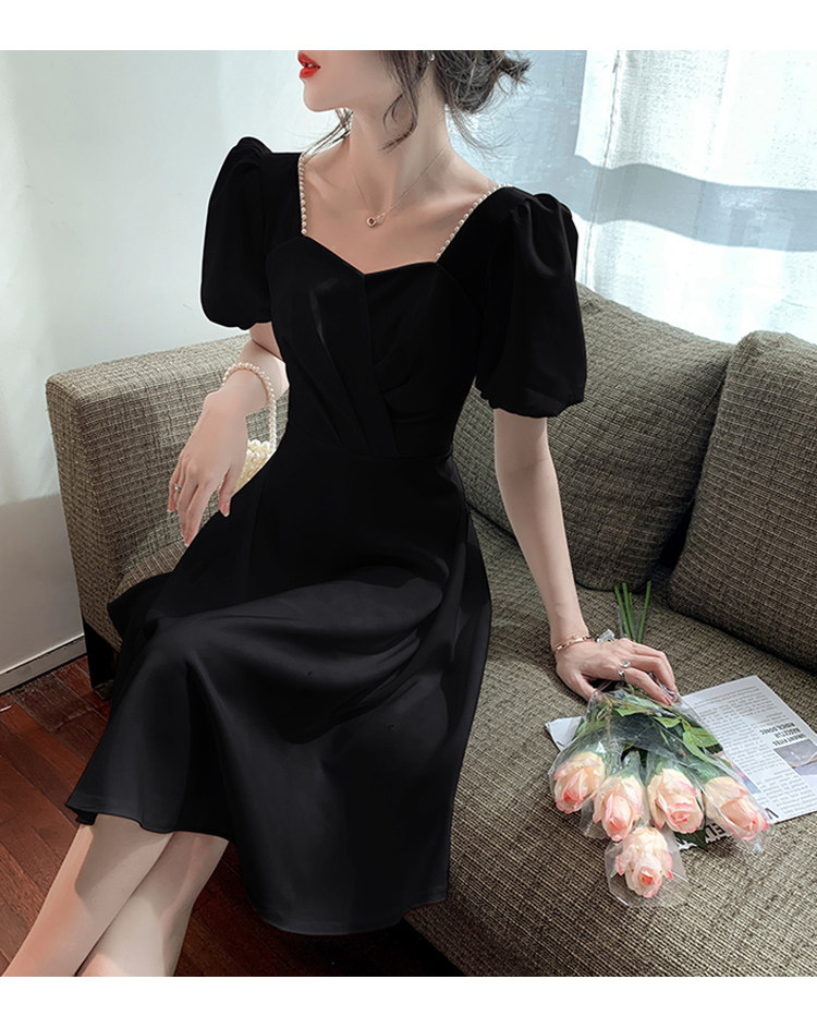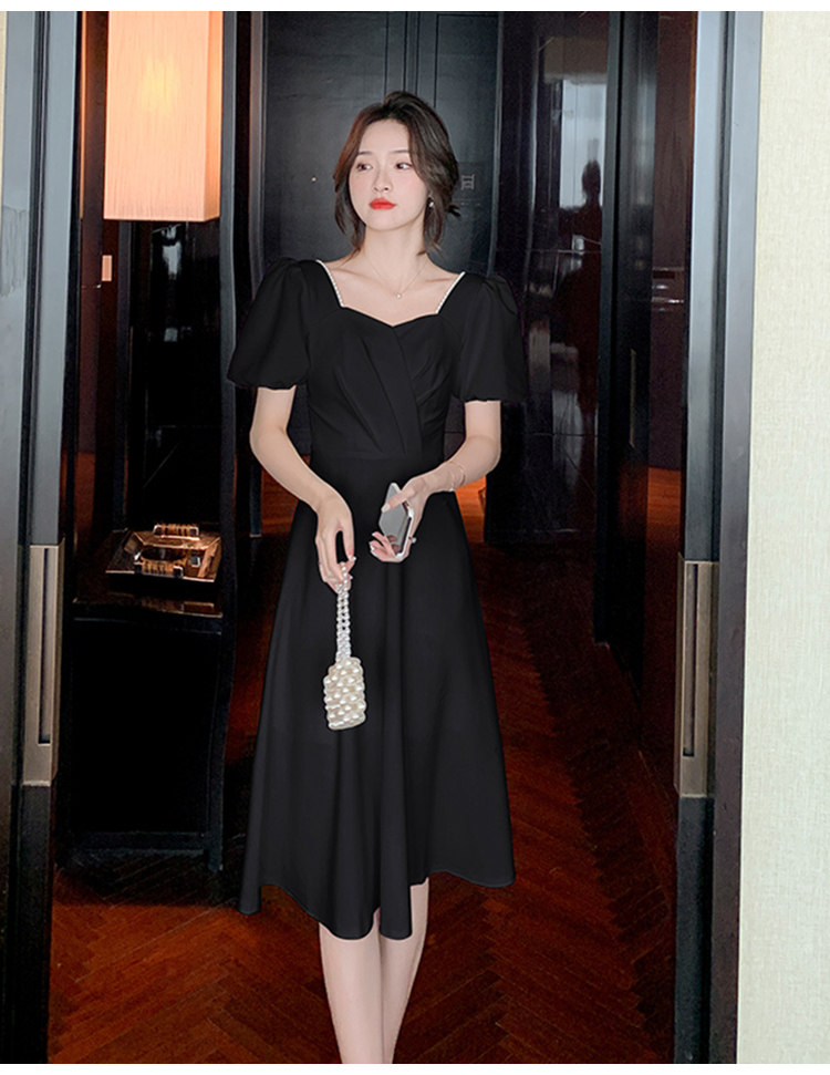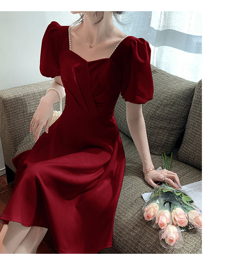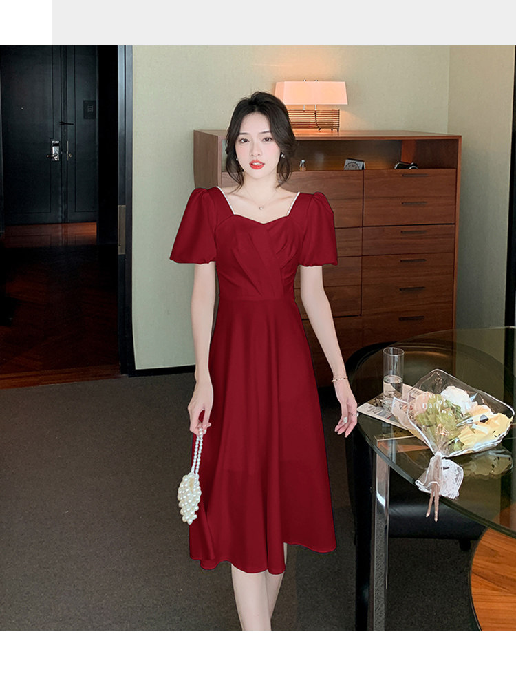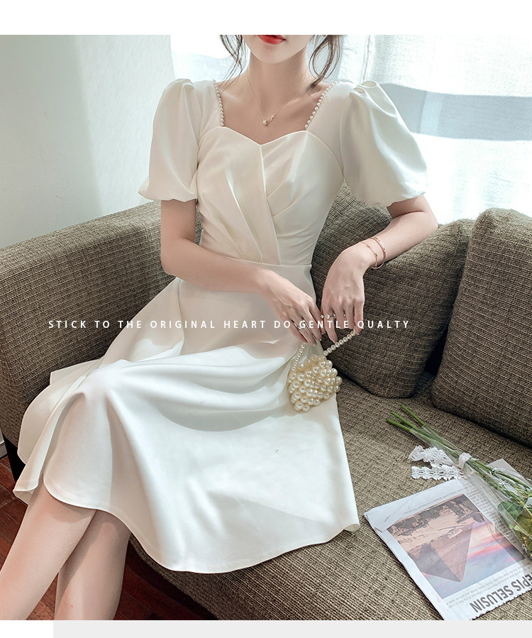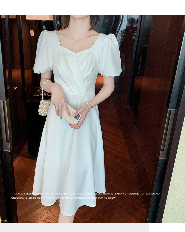 RM11558#白色礼服女宴会小个子法式轻奢中长款连衣裙方领泡泡袖可穿