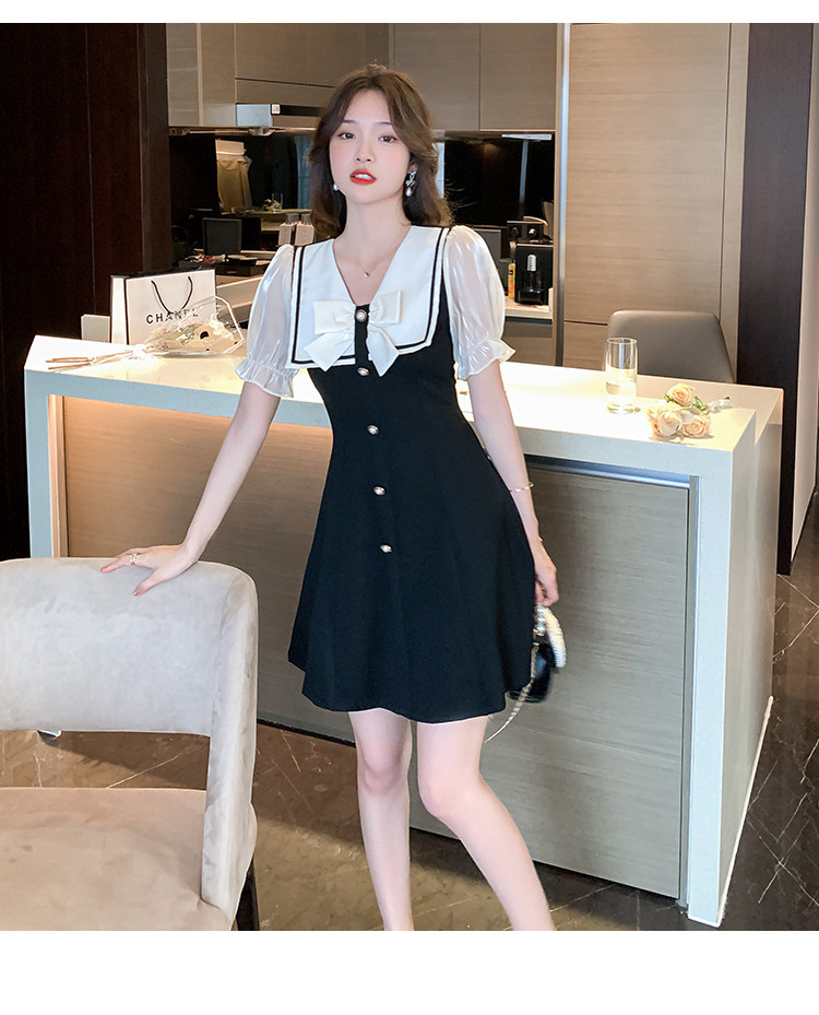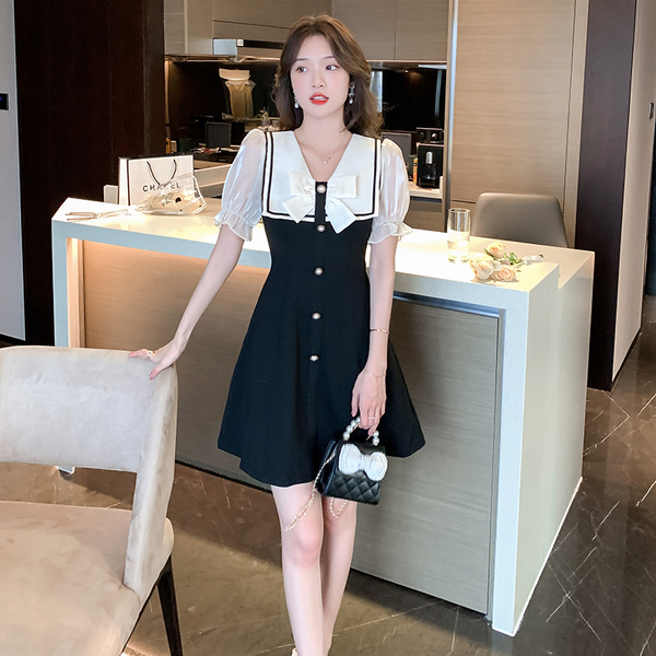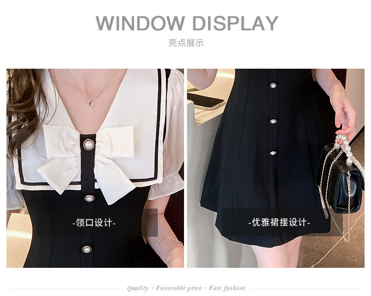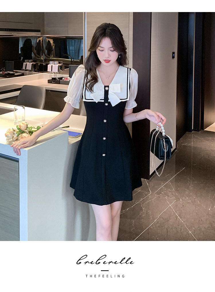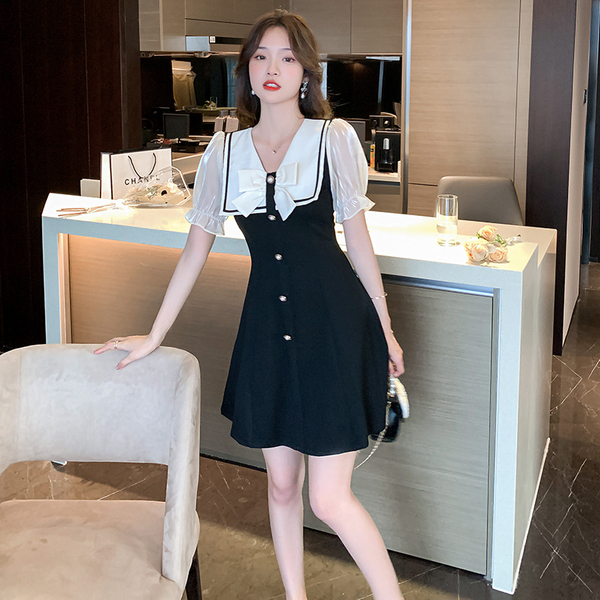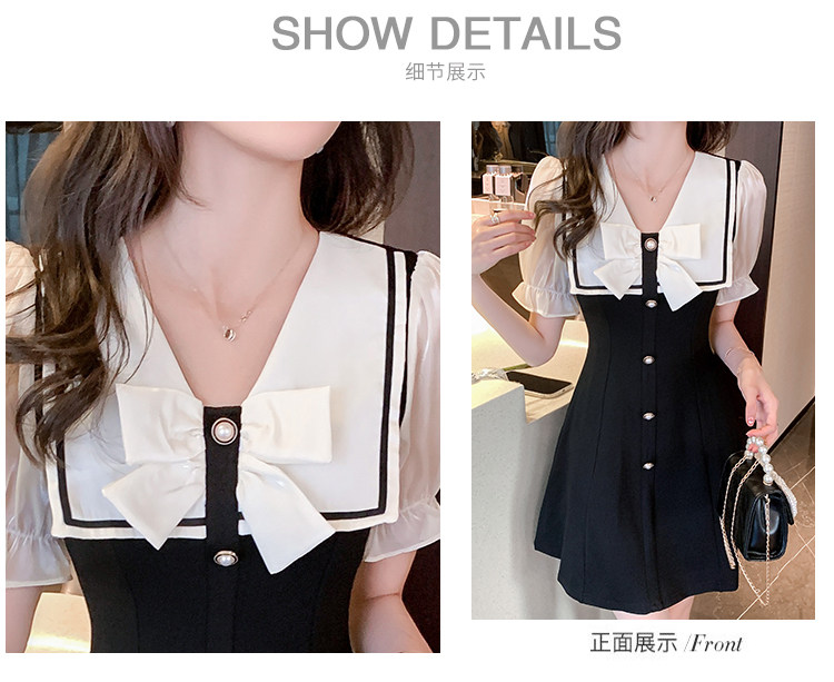 RM11634#夏季新款撞色蝴蝶结气质显瘦连衣裙