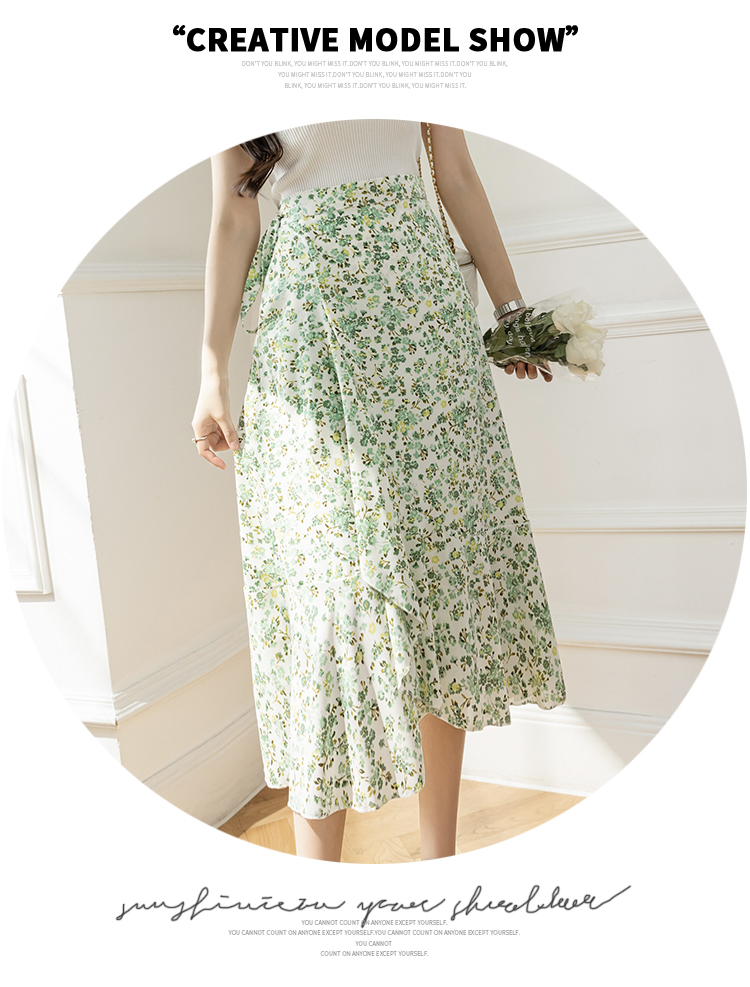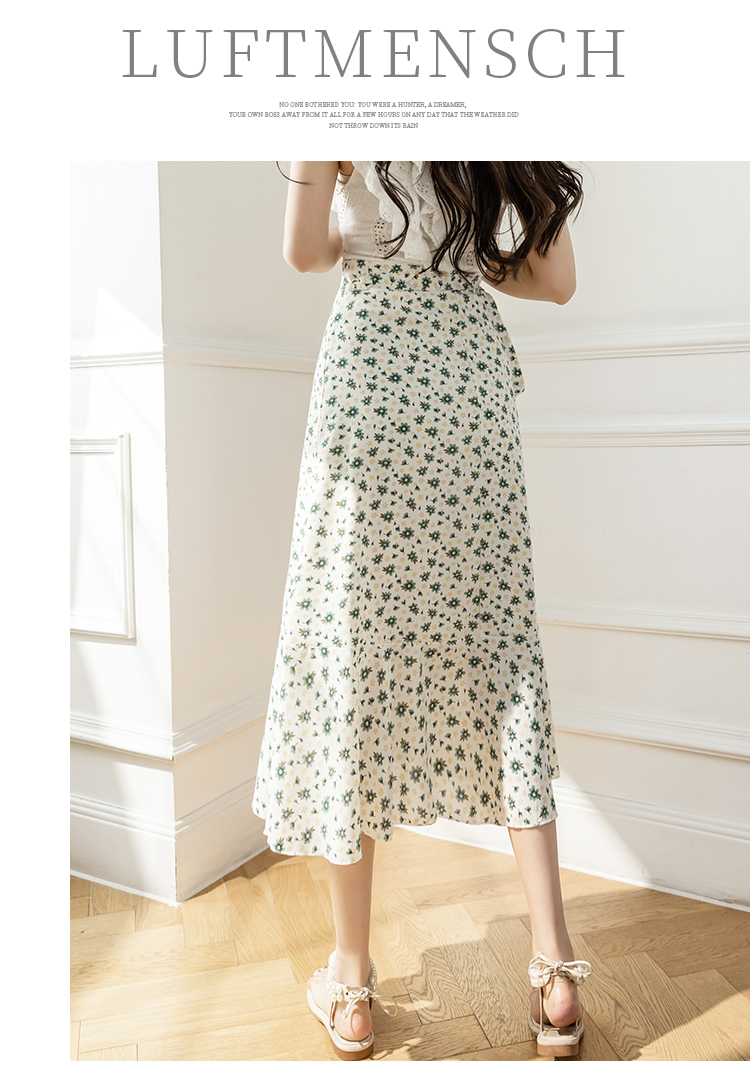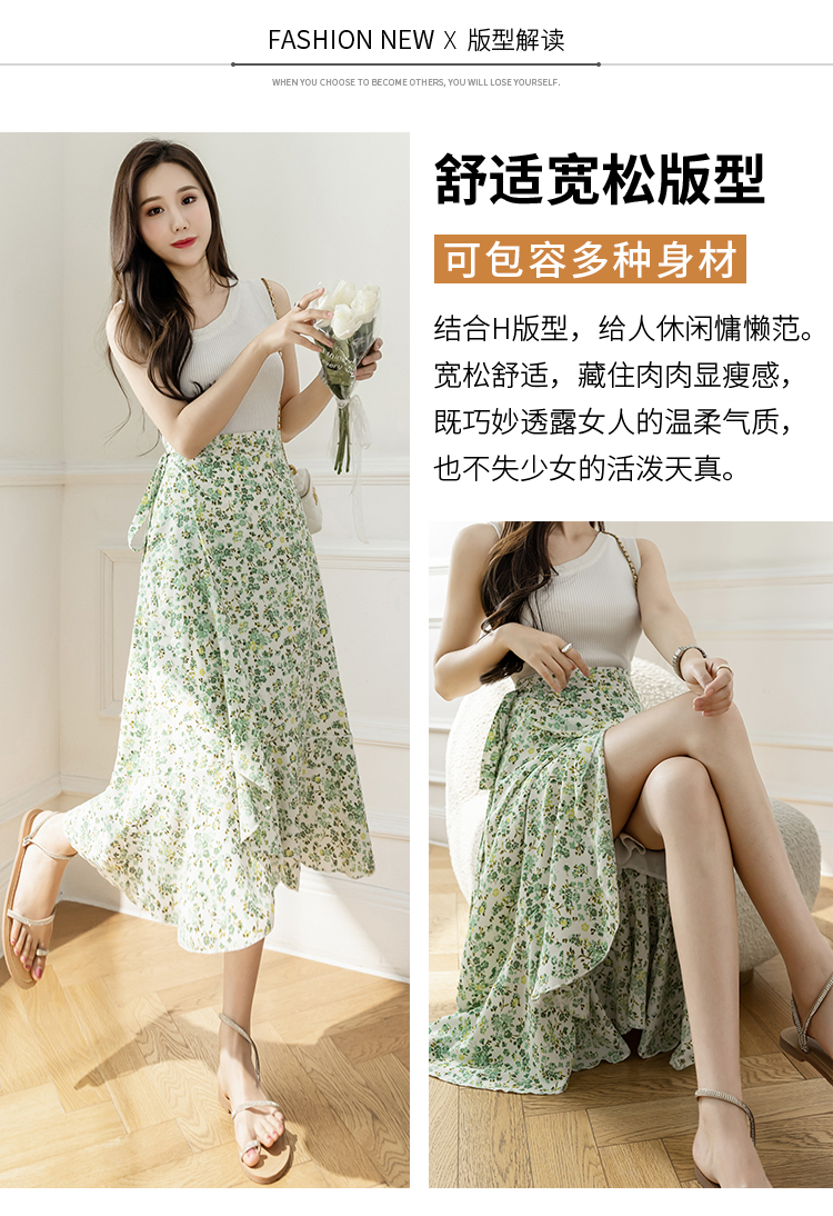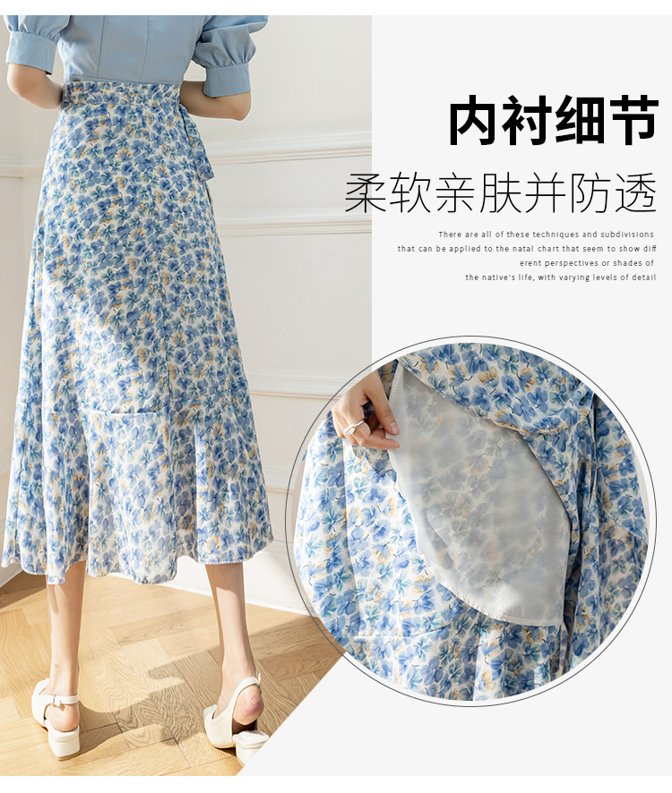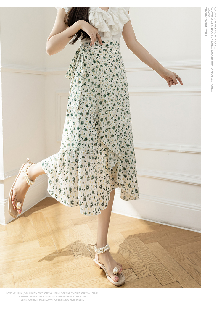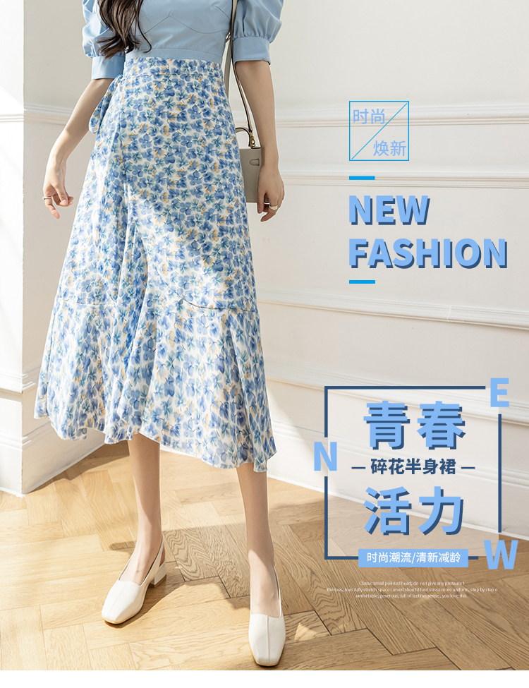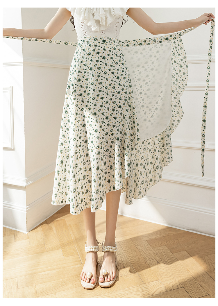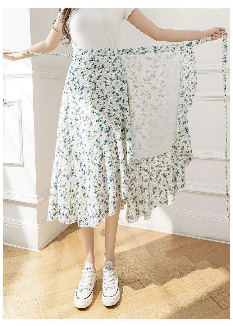 RM11813#荷叶边不规则雪纺半身裙一片式系带鱼尾长裙复古碎花裙