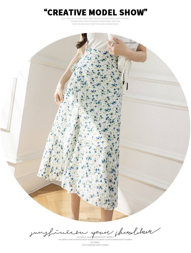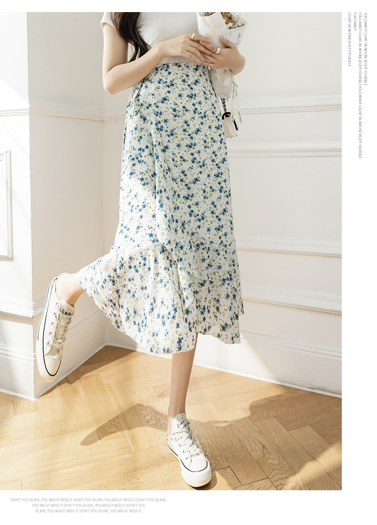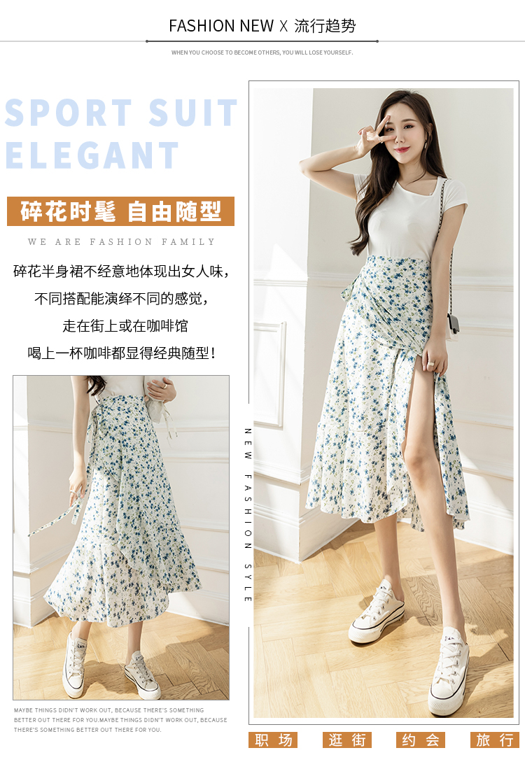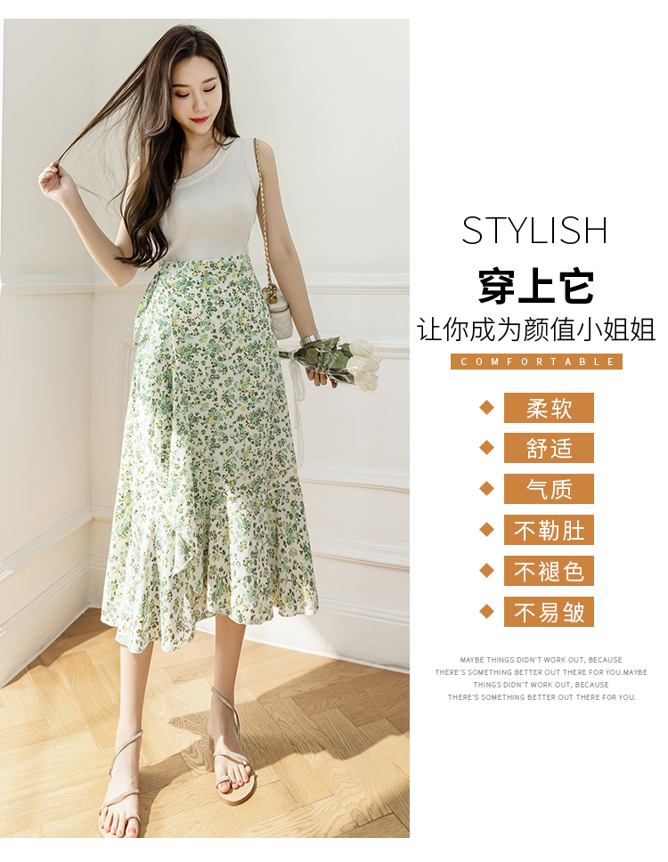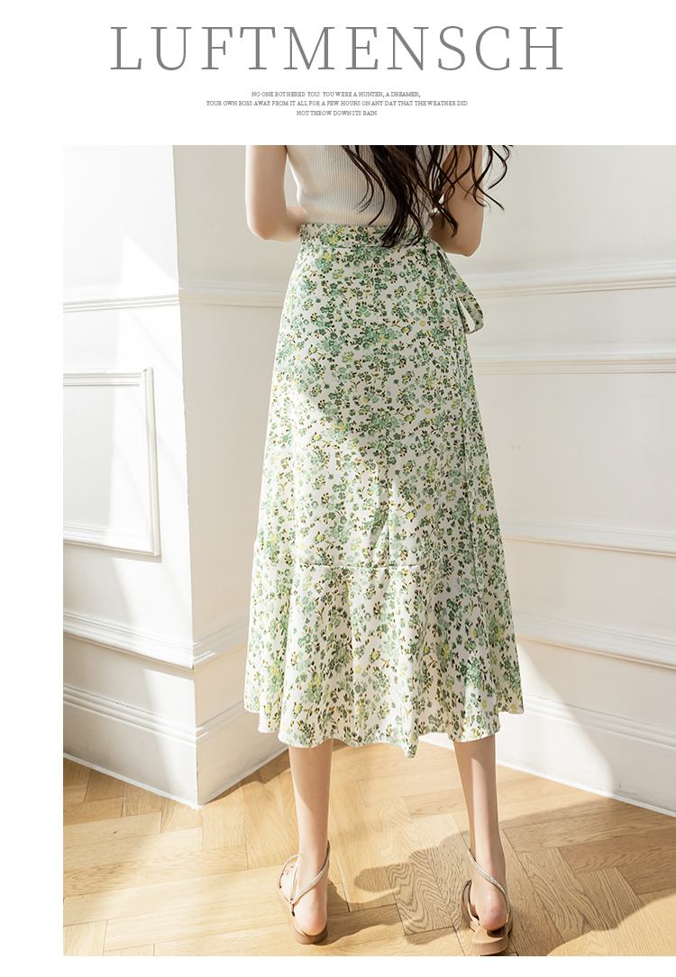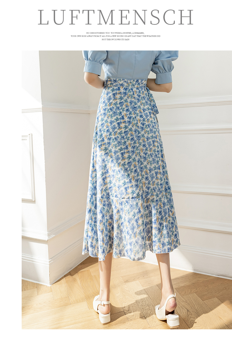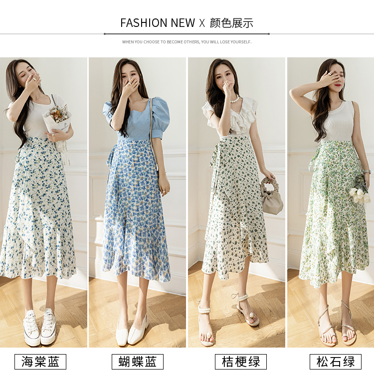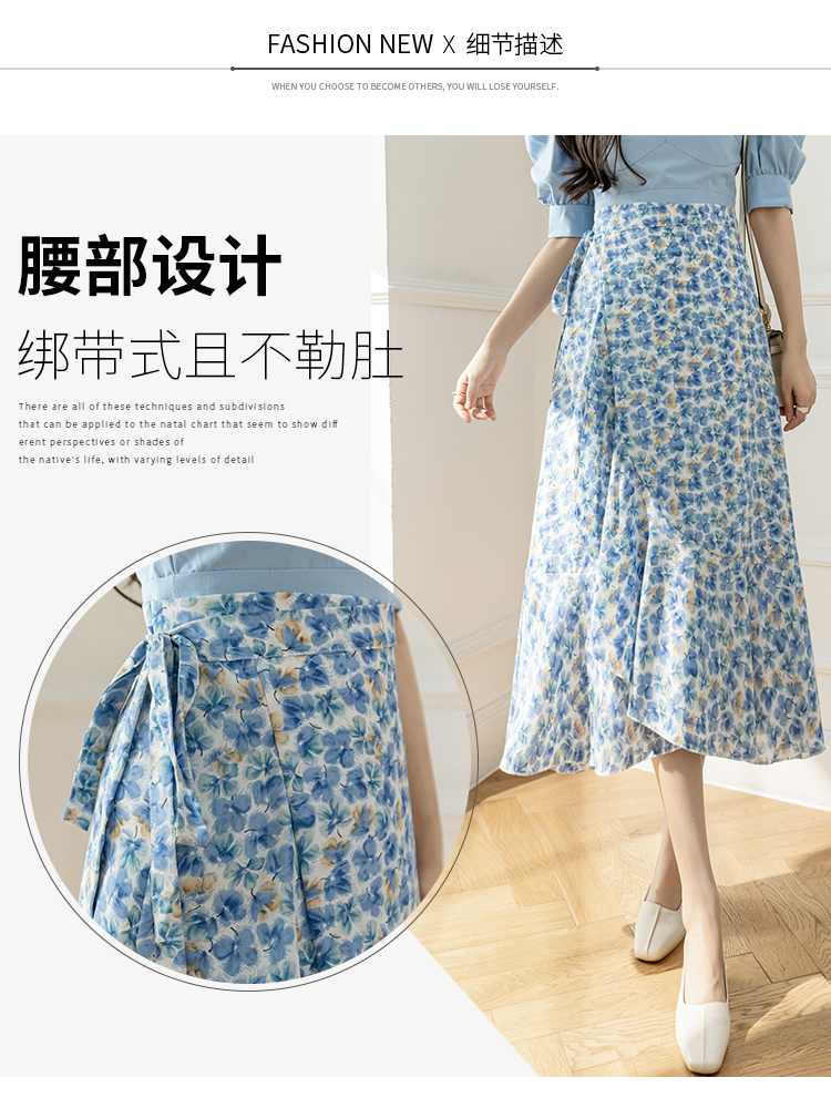 RM11813#荷叶边不规则雪纺半身裙一片式系带鱼尾长裙复古碎花裙