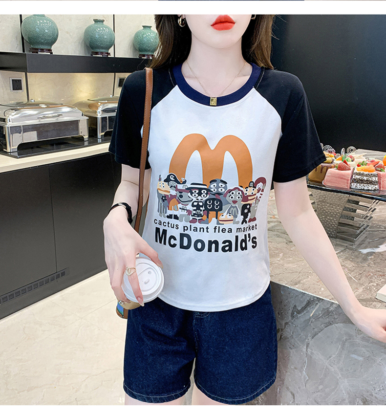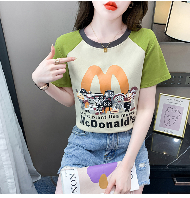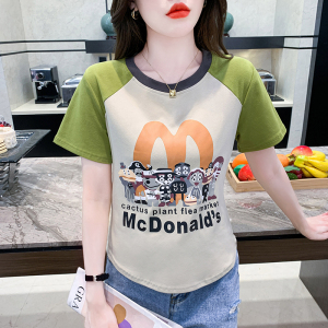 RM12090#短袖T恤女圆领插肩袖夏季拼色短款套头别致洋气上衣女