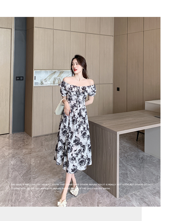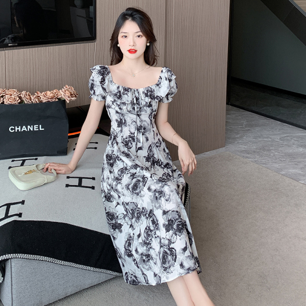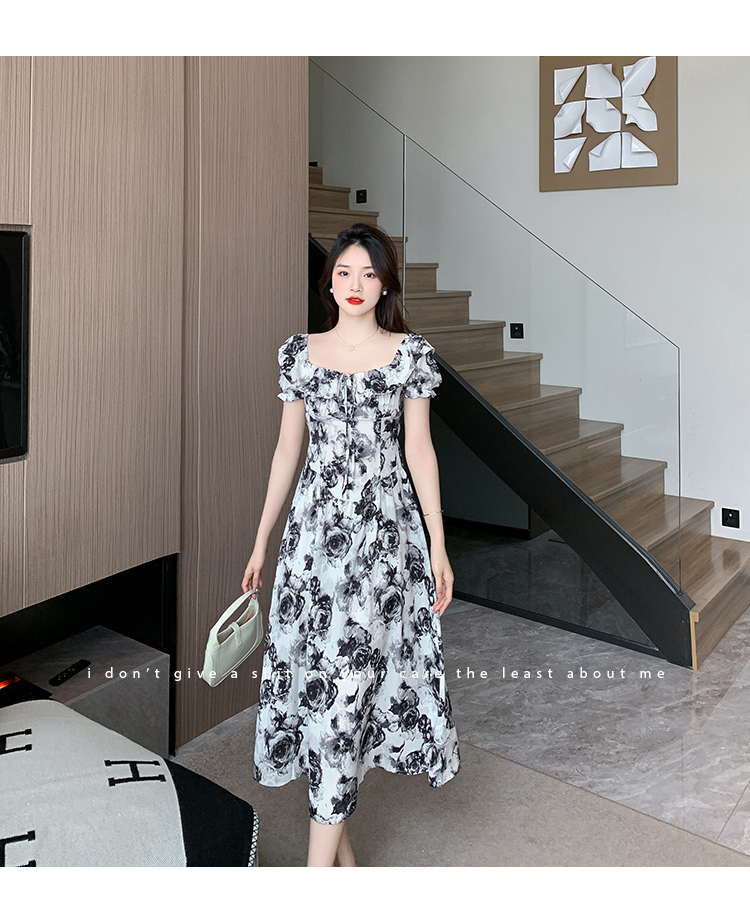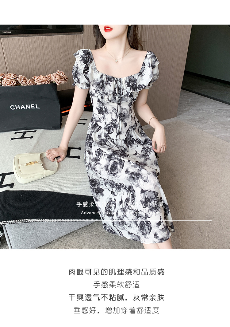 RM12286#新款夏季水墨画印花名媛淑女修身中长款连衣裙