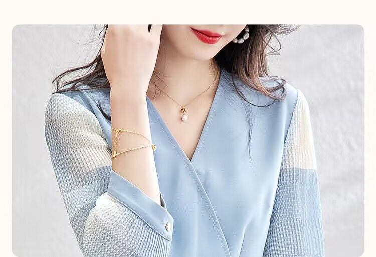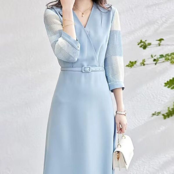 RM12310#印花压皱雪纺拼接2023春新V领收腰七分袖连衣裙女长款