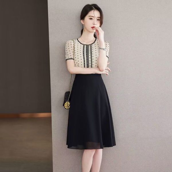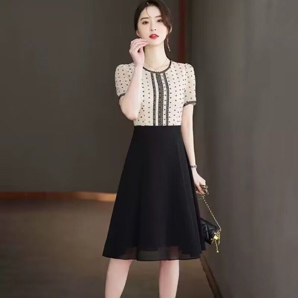 RM12311#波点蕾丝连衣裙女夏季2023年新款中长款修身短袖高端气质裙子