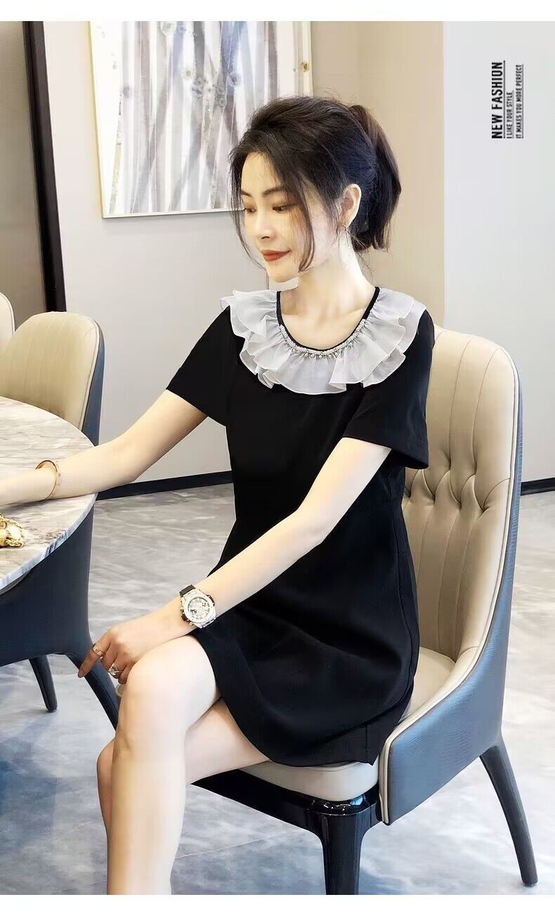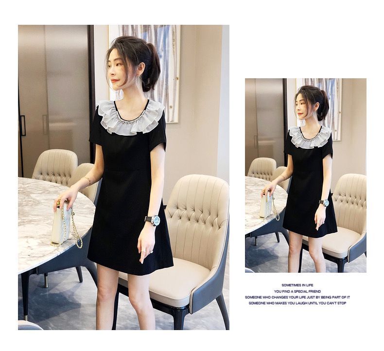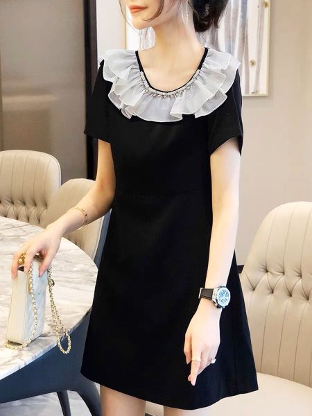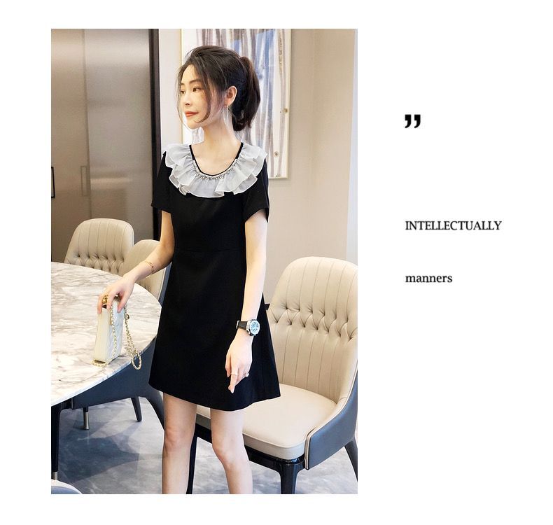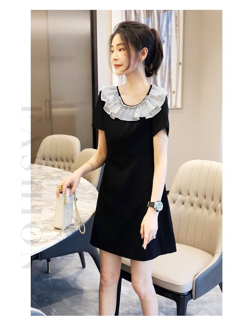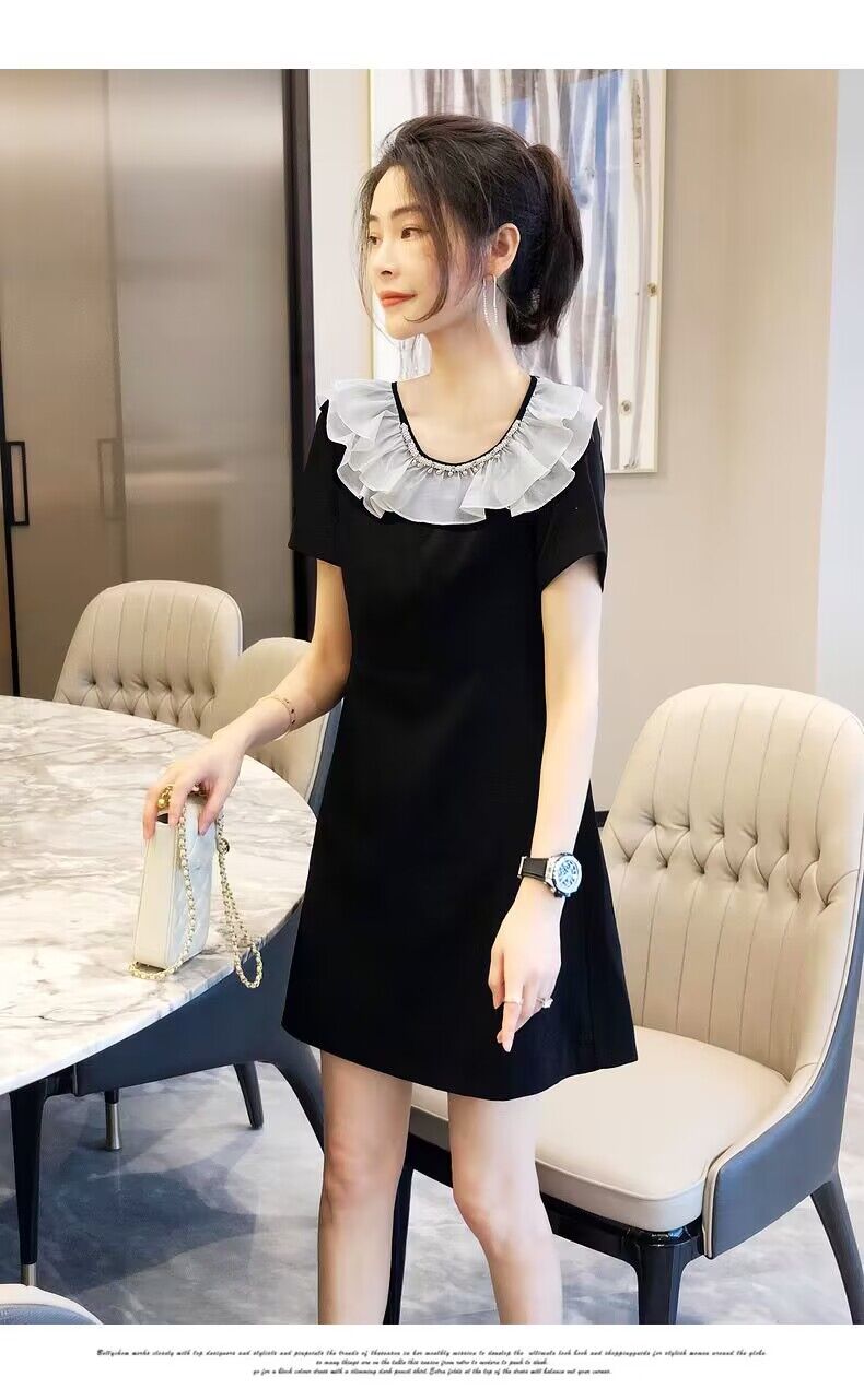 RM12320#荷叶边黑色连衣裙女小个子微胖显瘦气质裙子夏季2023年新款欧洲站