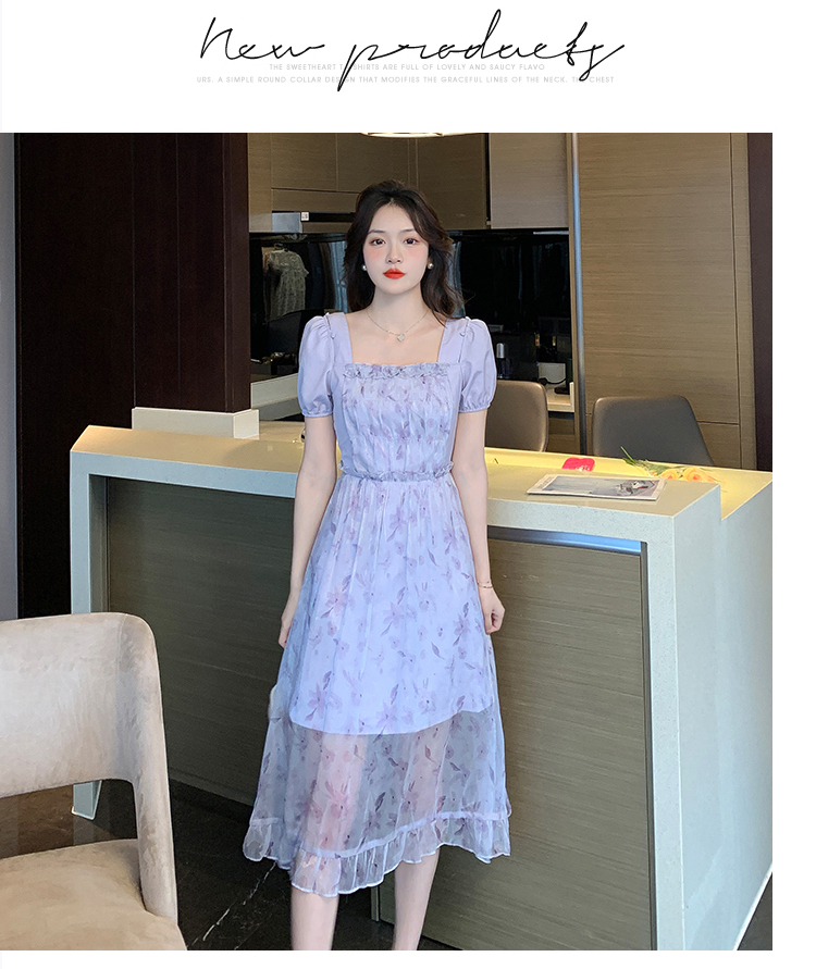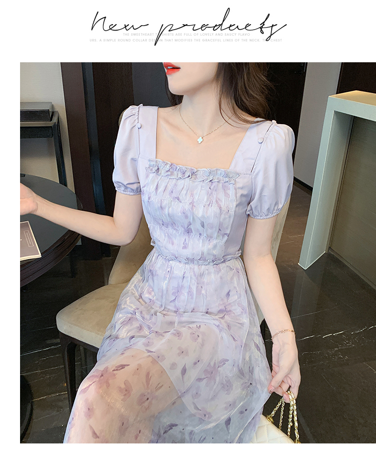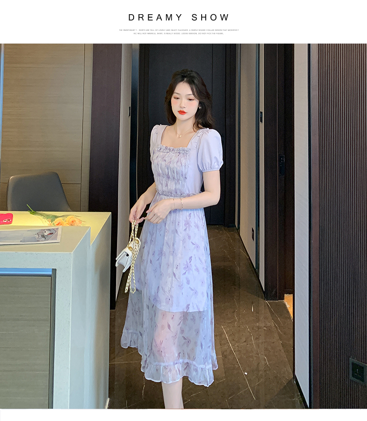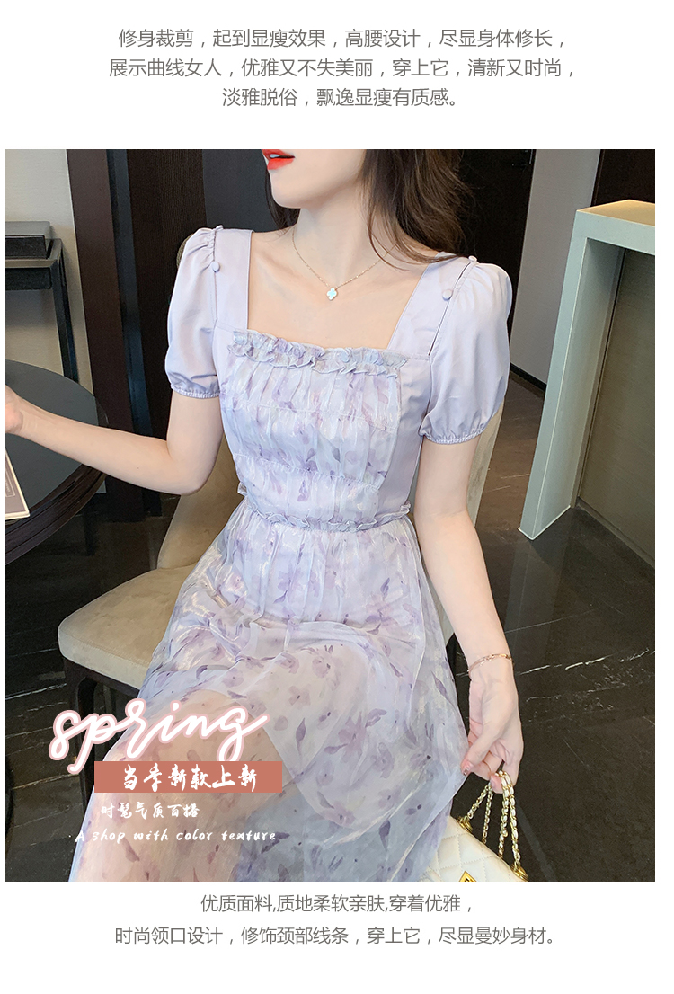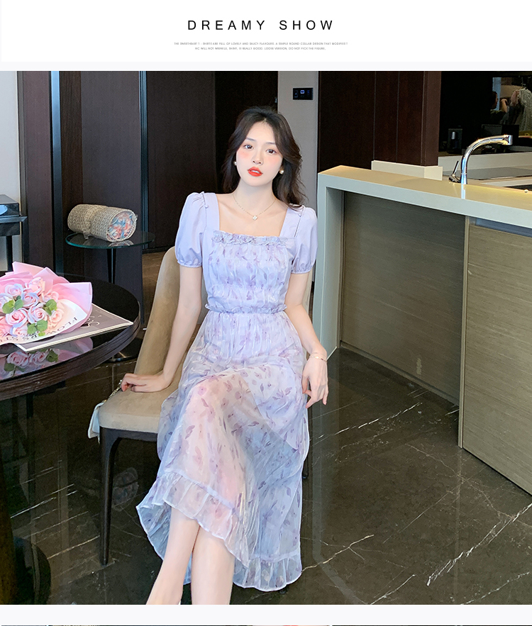 RM12326#夏新款淑女复古浪漫别致甜美通透花瓣印花连衣裙短袖方领
