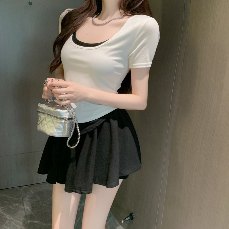 RM12431#U领显瘦假两件T恤上衣+垂感宽松显瘦裤裙套装