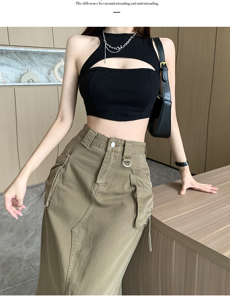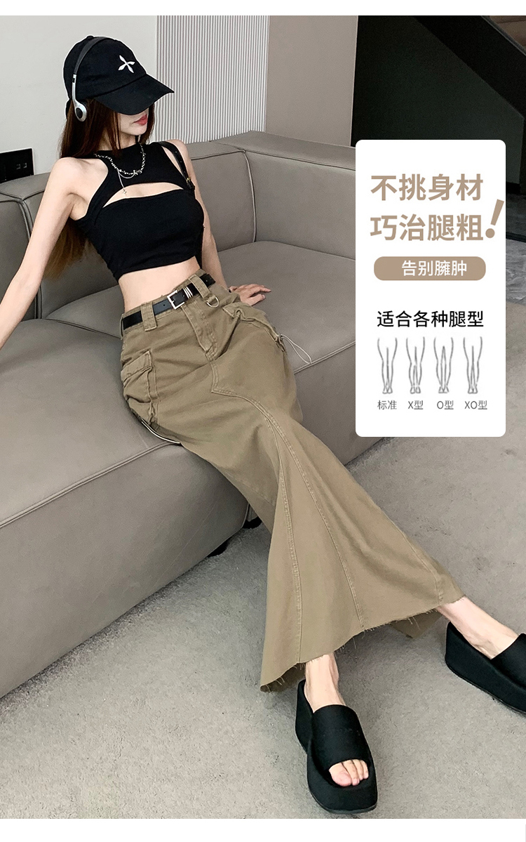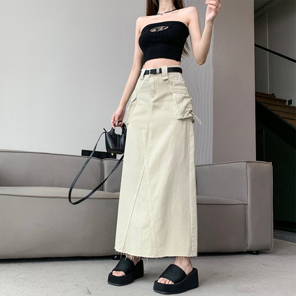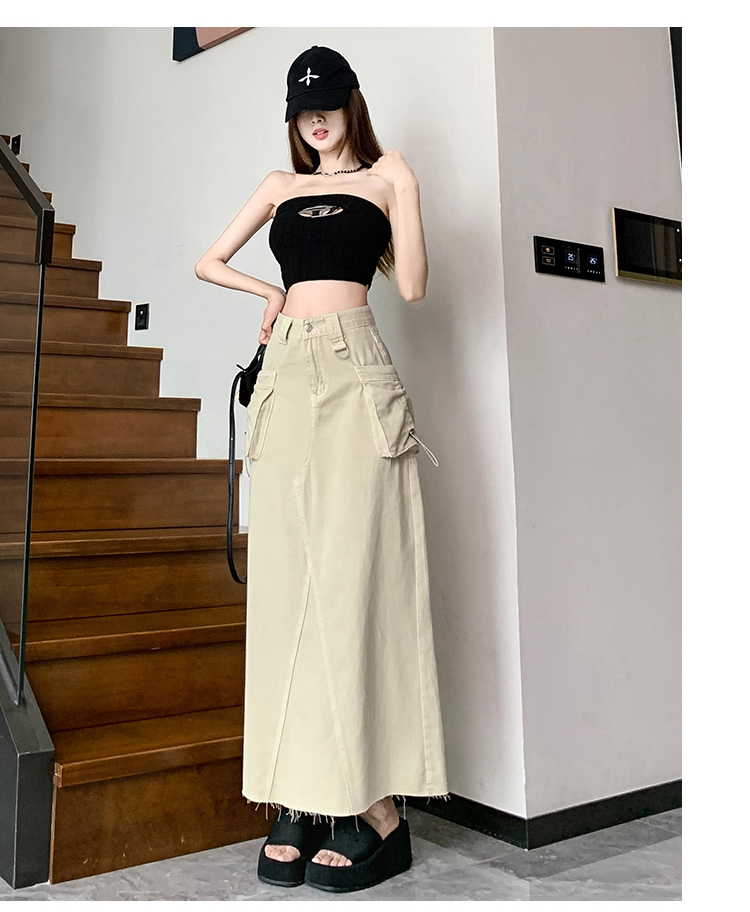 RM12504#复古美式设计感小众抽绳口袋工装半身裙夏季新款开叉长裙