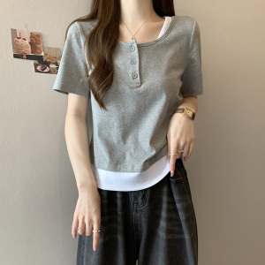RM12837#夏装新款胖mm时尚简约气质撞色拼接T恤短袖上衣潮