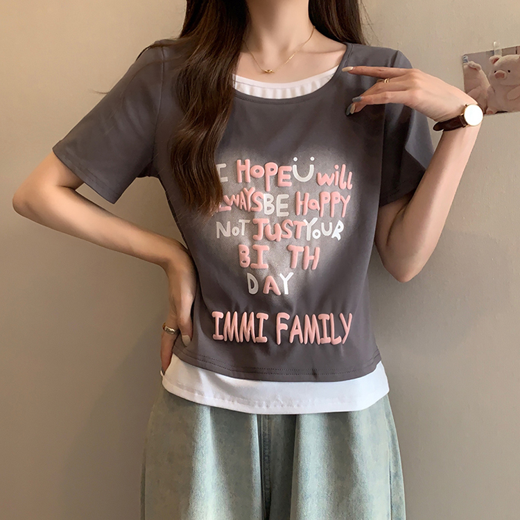 RM12840#夏装新款胖mm假两件拼接爱心字母印花显瘦短袖上衣T恤潮