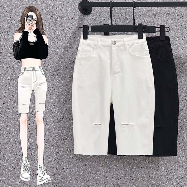 RM13000#夏季新款水洗棉胖MM弹力高腰显瘦破洞五分裤休闲裤