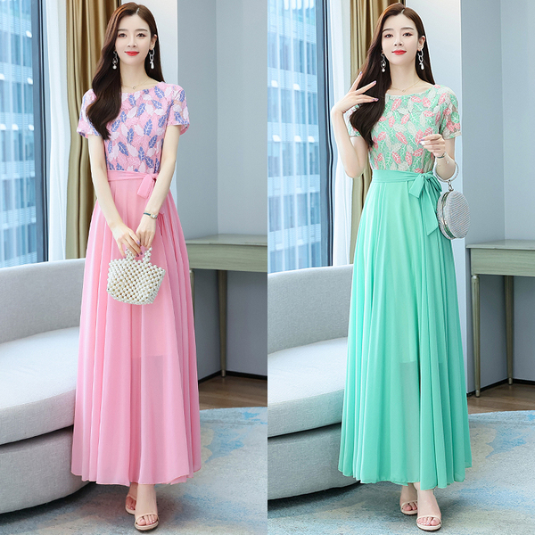 RY1538蕾丝拼接雪纺连衣裙2021短袖气质时尚飘逸长裙收腰显瘦大摆裙子潮