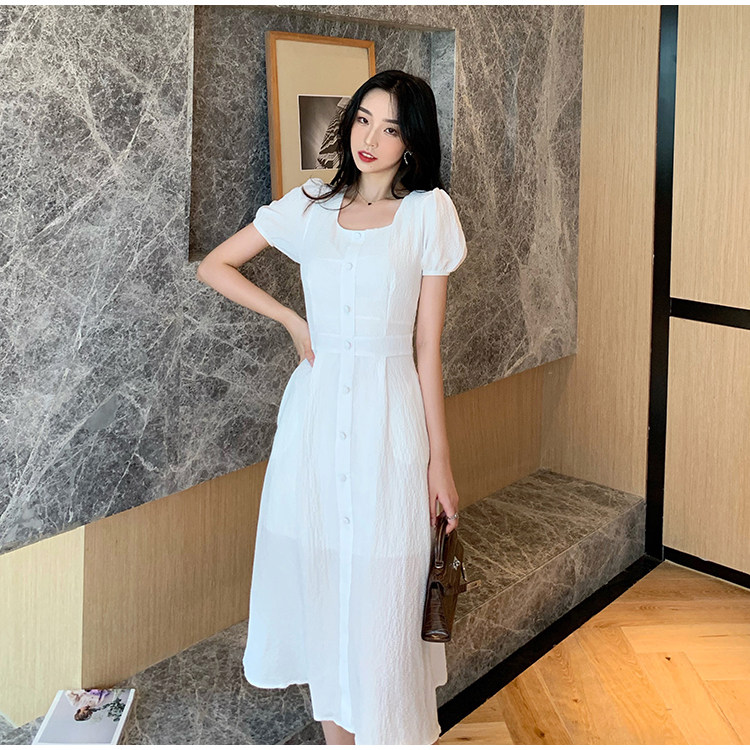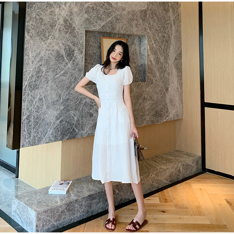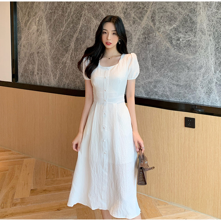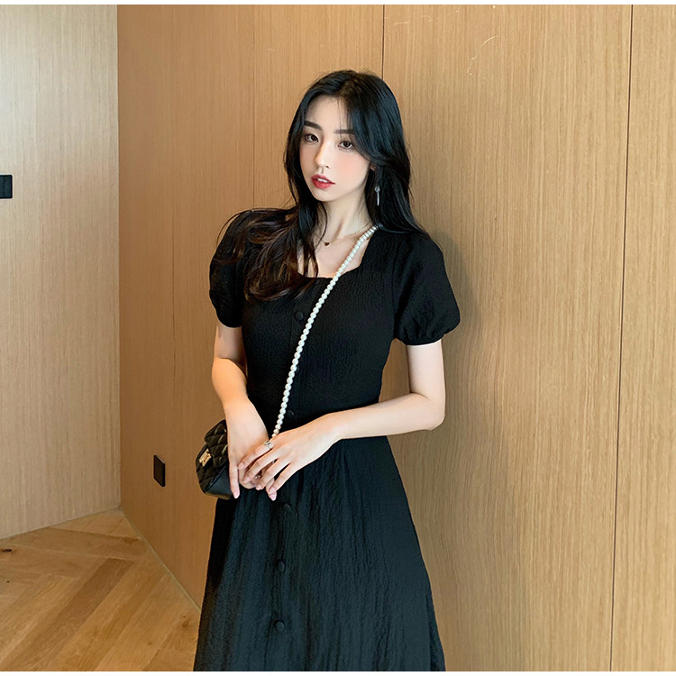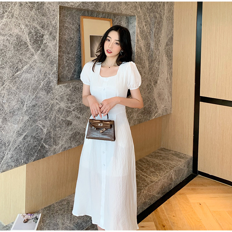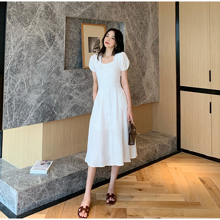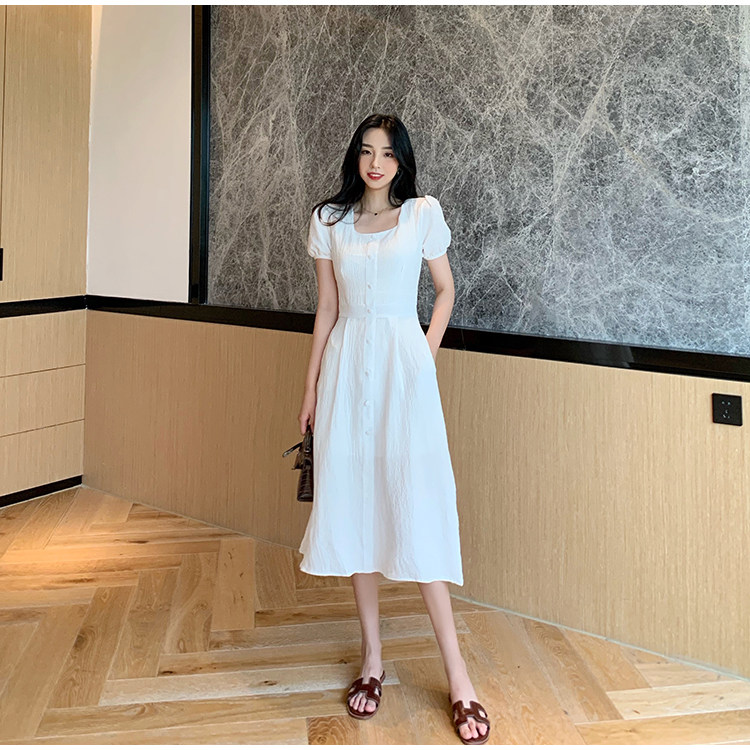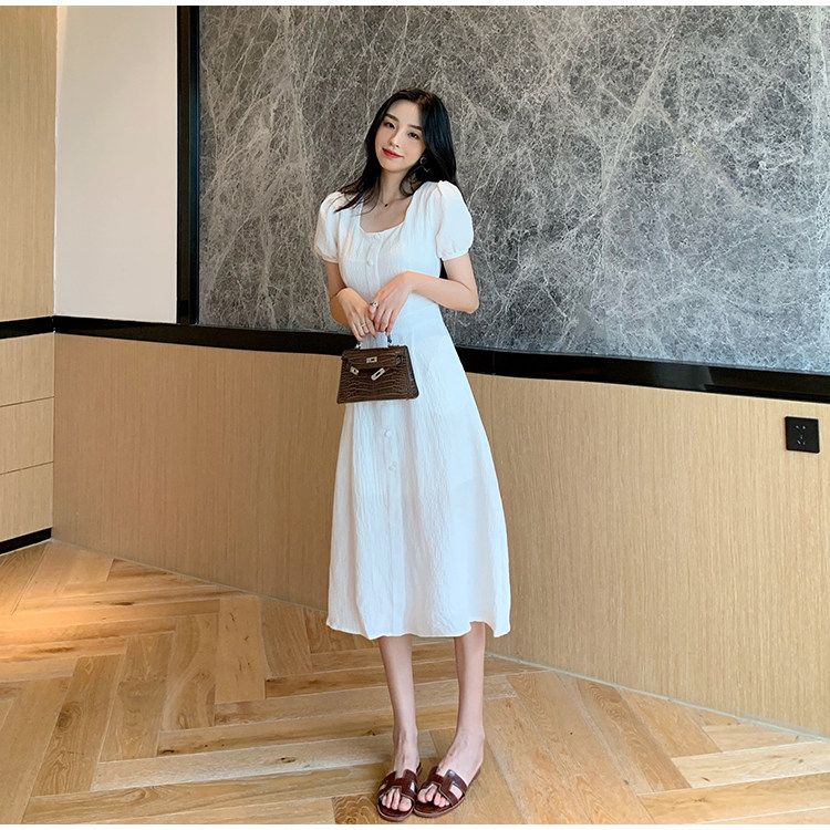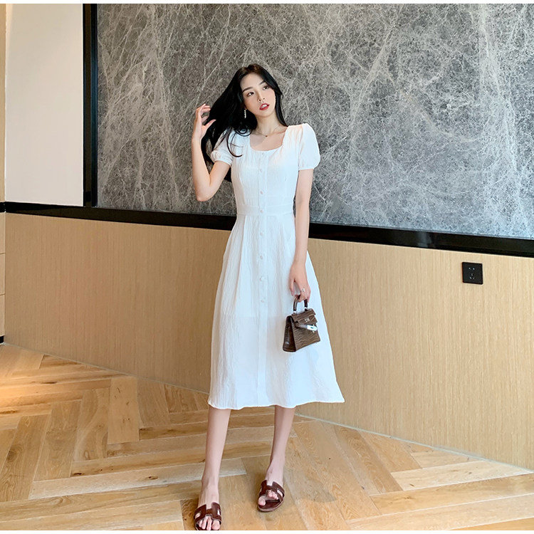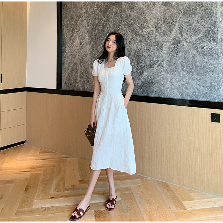 RM13143#韩版方领泡泡袖收腰显瘦仙女裙法式小众中长款连衣裙