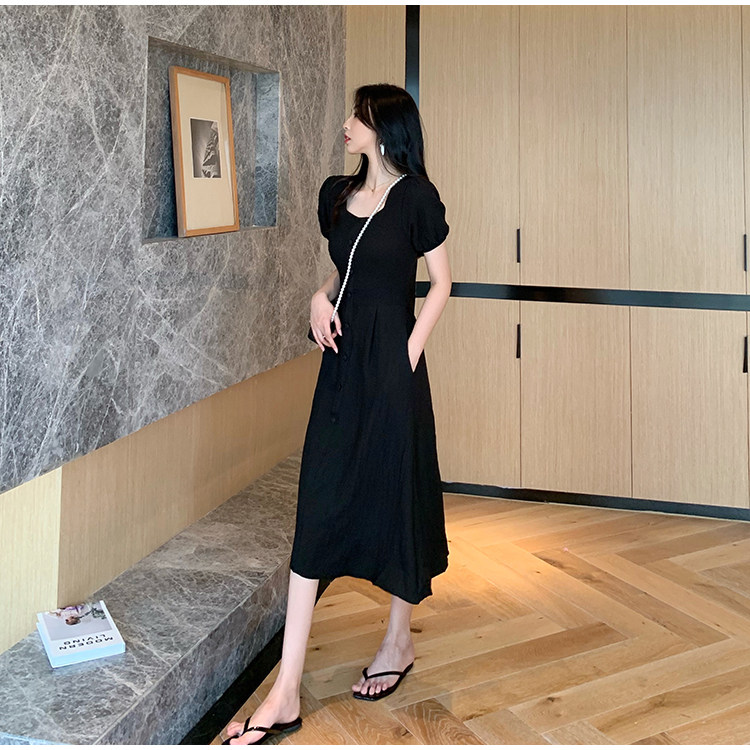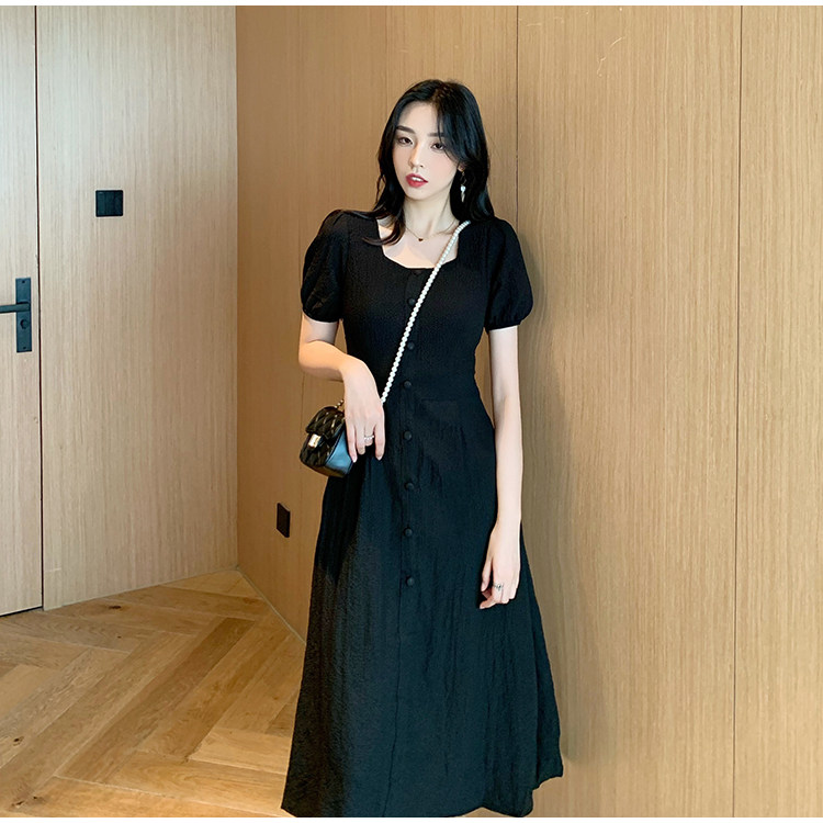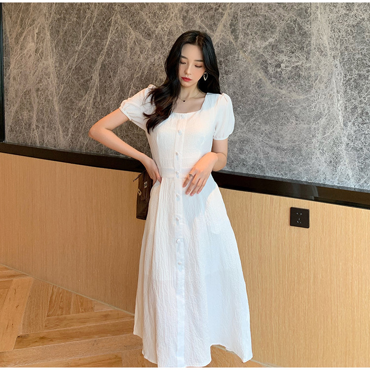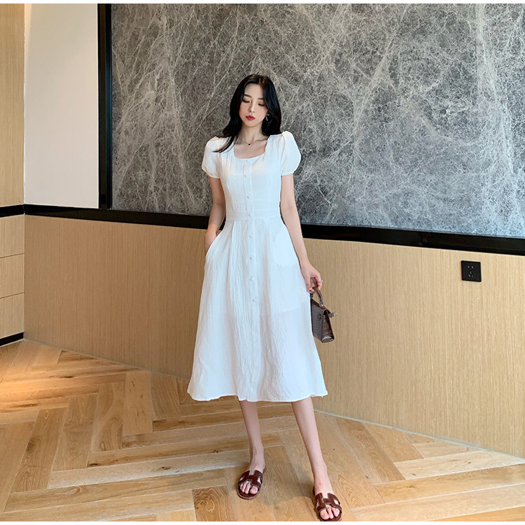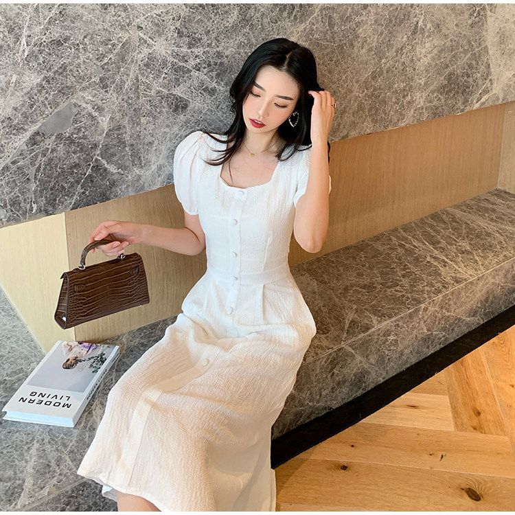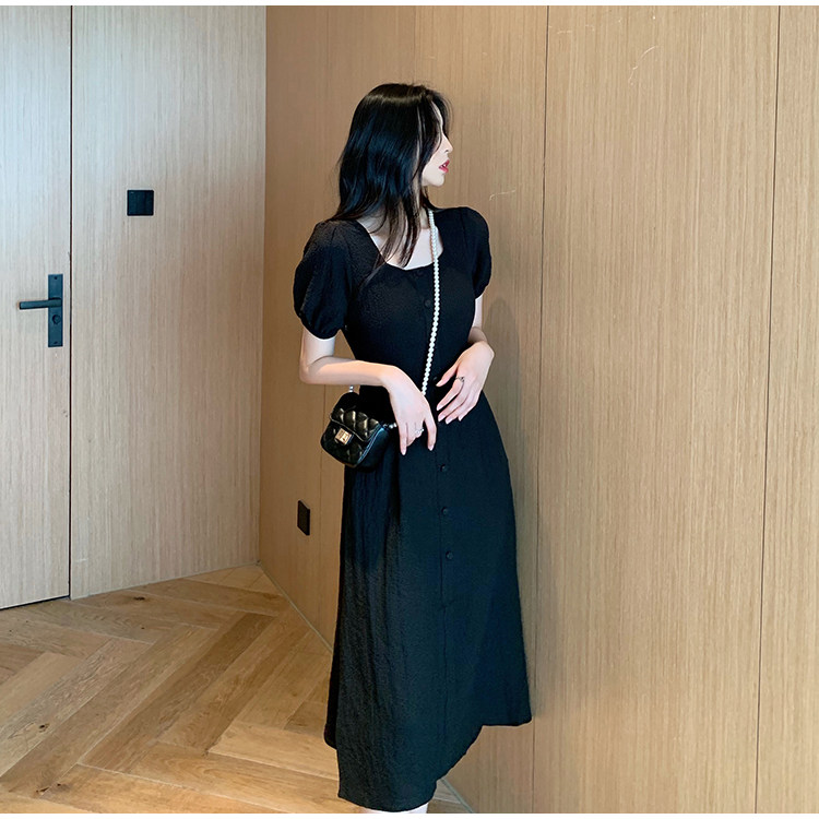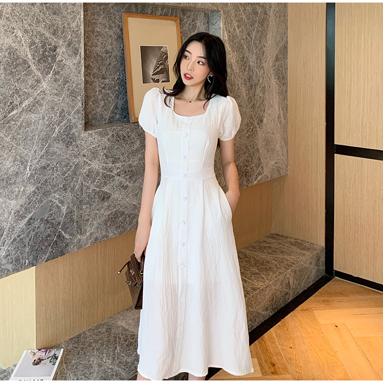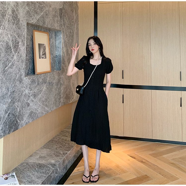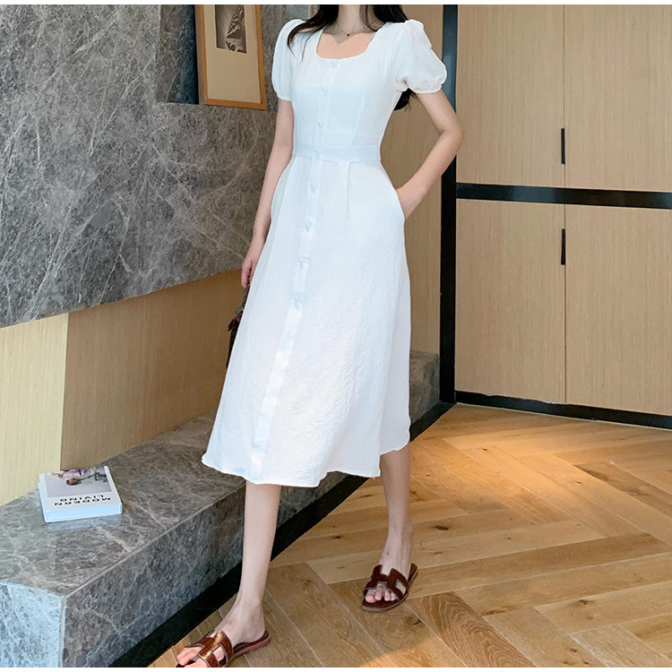 RM13143#韩版方领泡泡袖收腰显瘦仙女裙法式小众中长款连衣裙