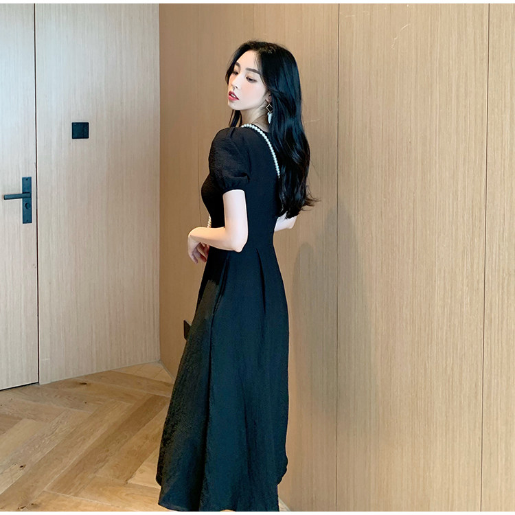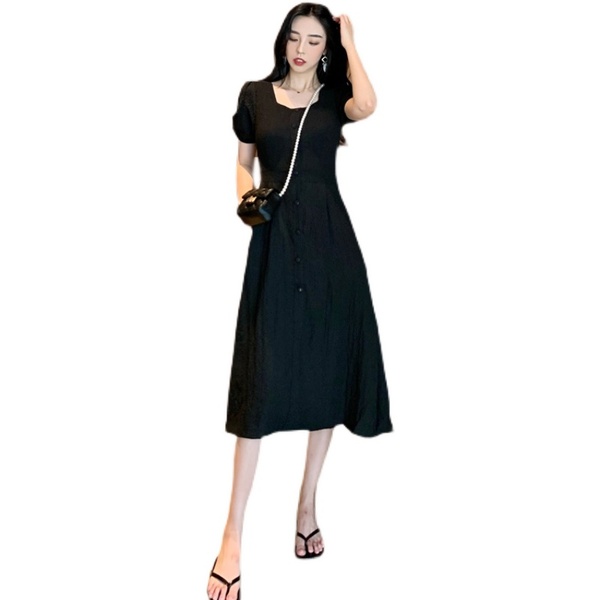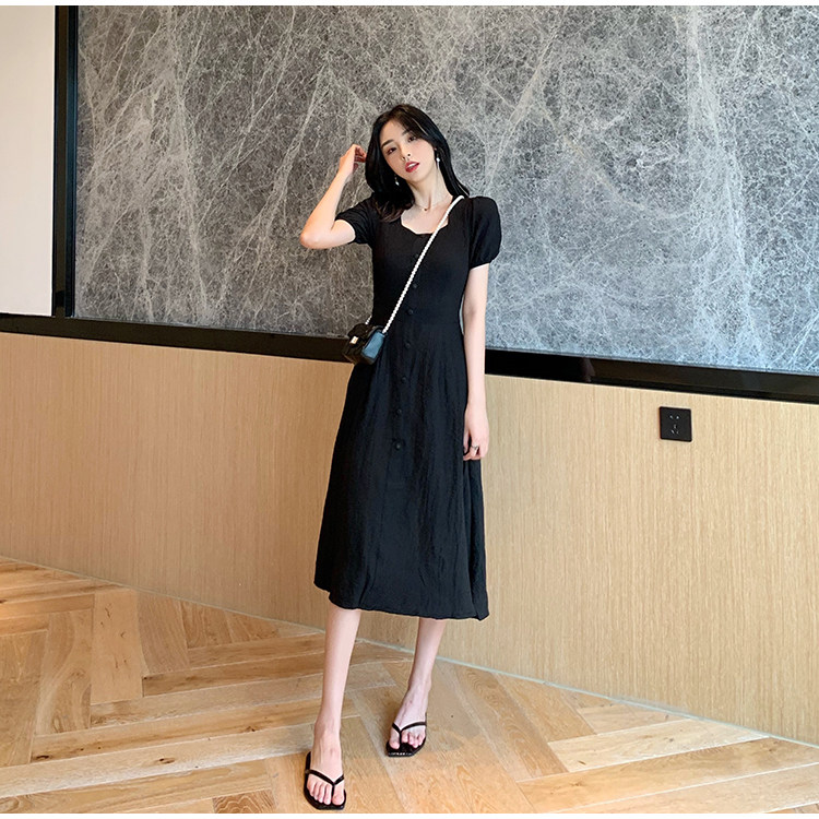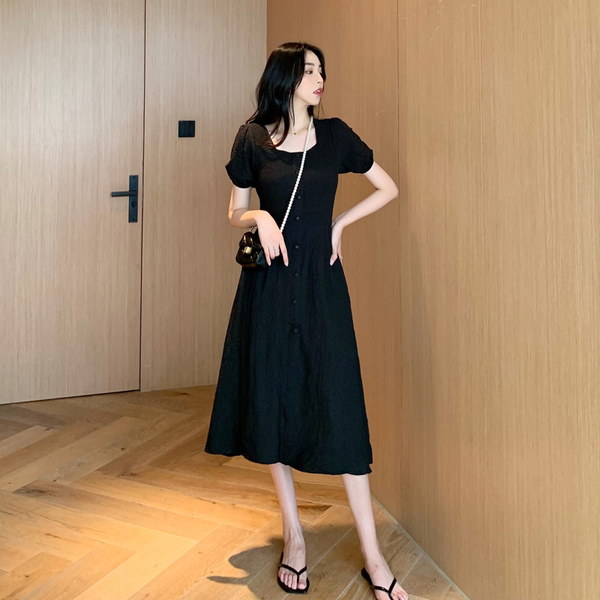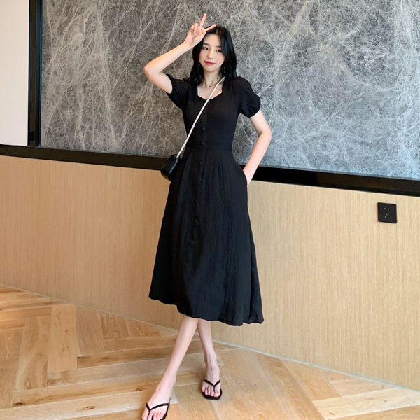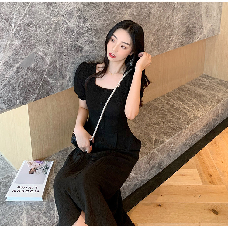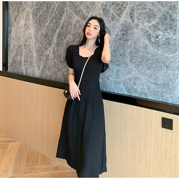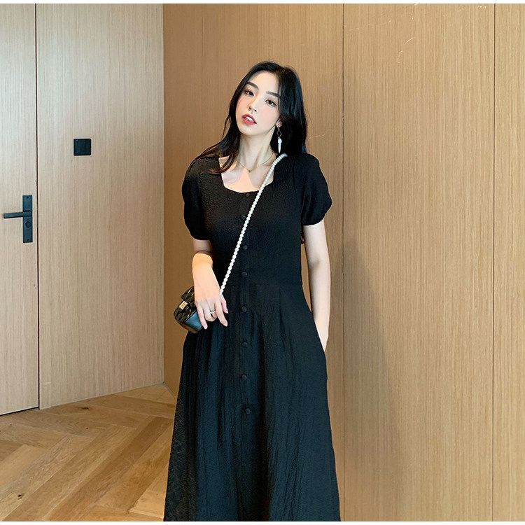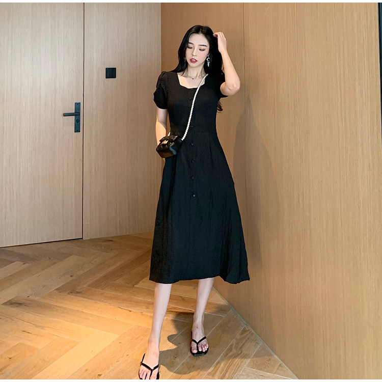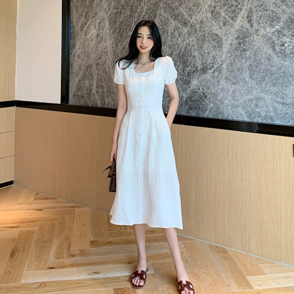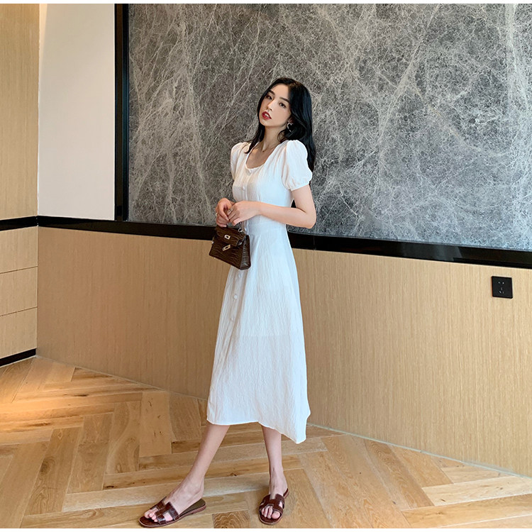 RM13143#韩版方领泡泡袖收腰显瘦仙女裙法式小众中长款连衣裙