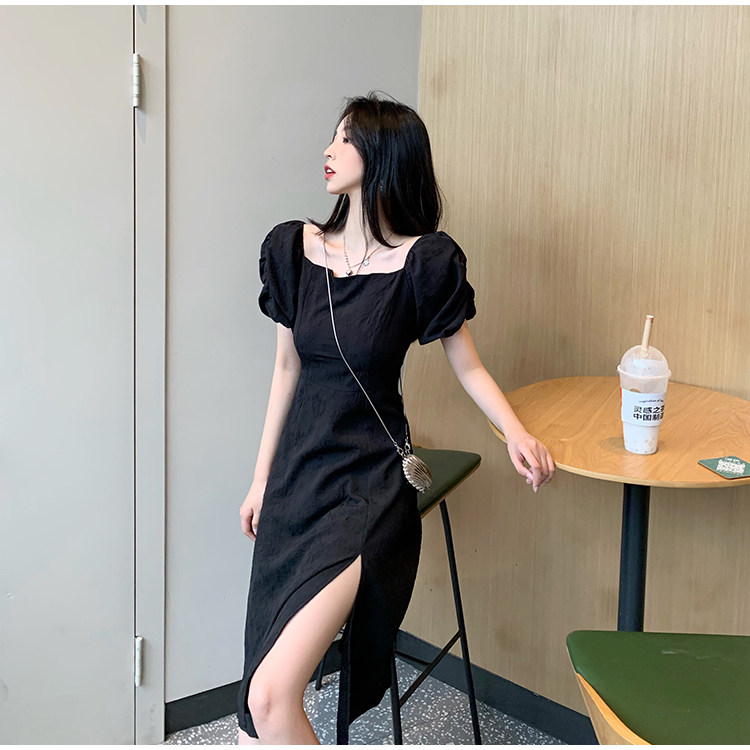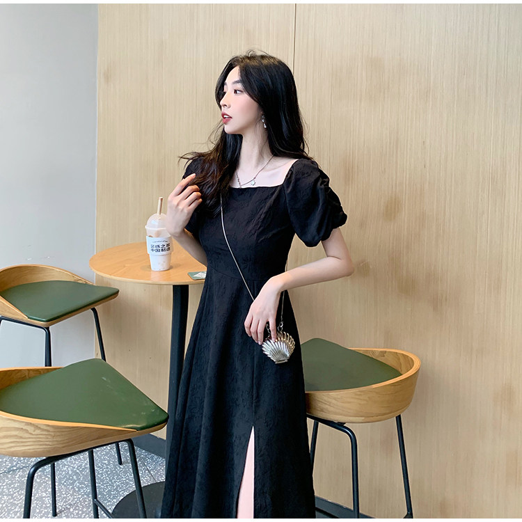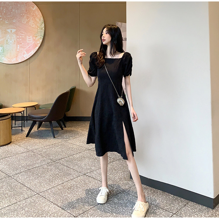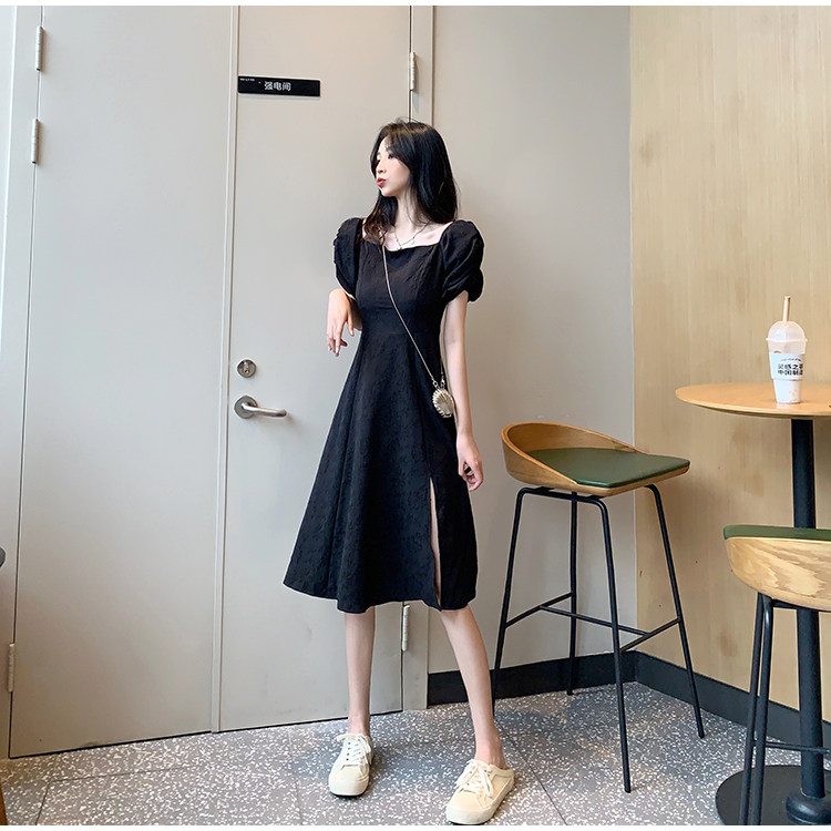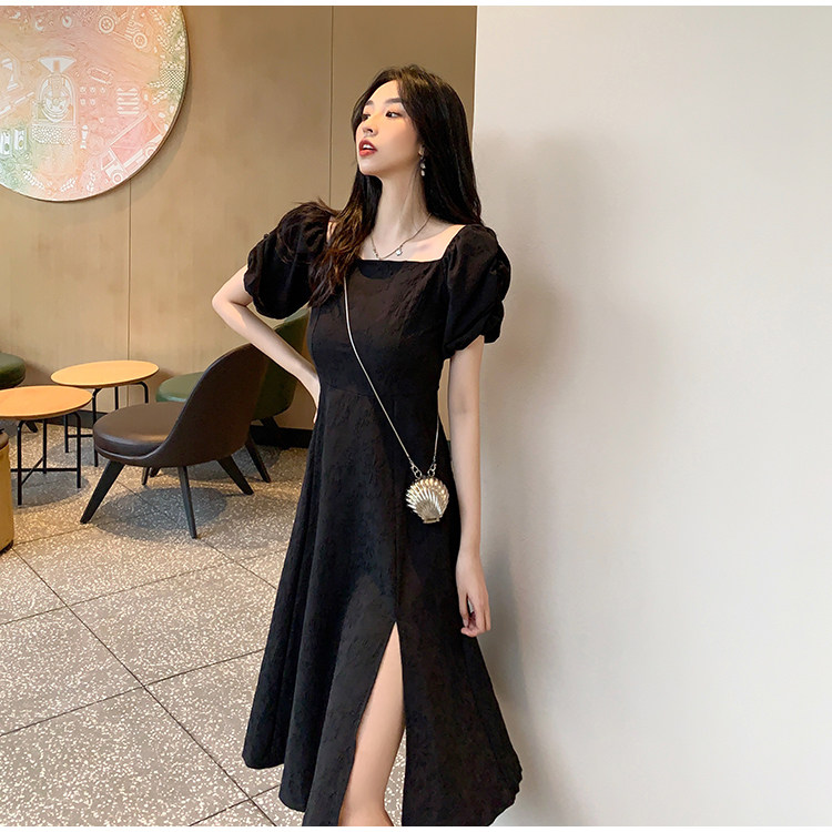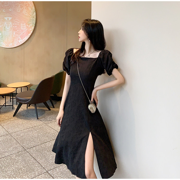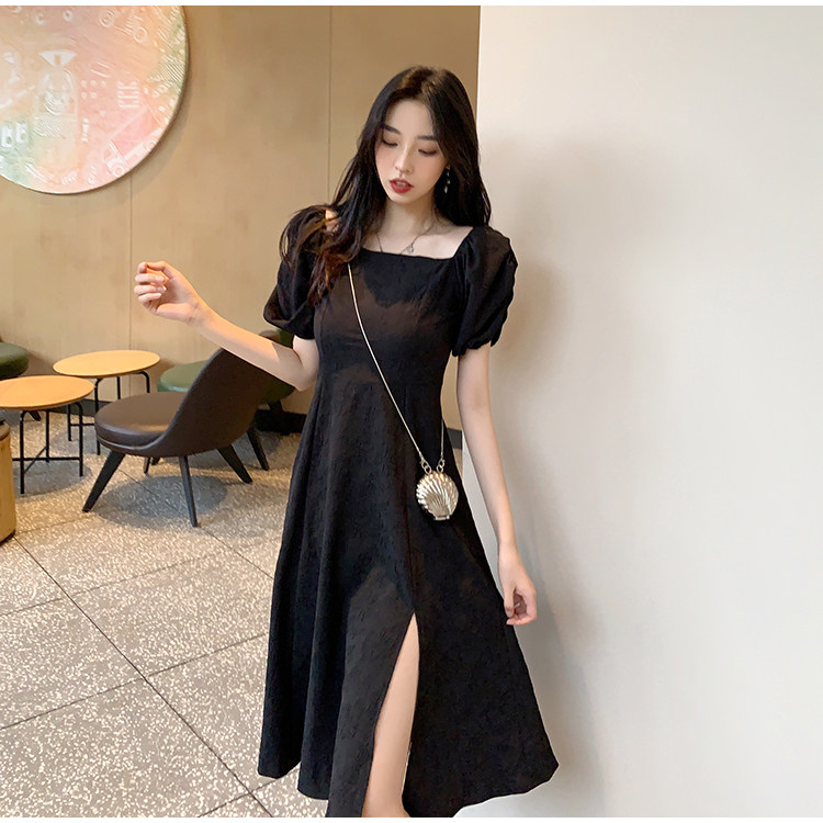 RM13144#法式小众心机方领泡泡袖小黑裙女夏赫本风开叉连衣裙