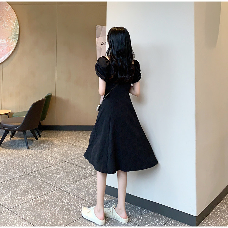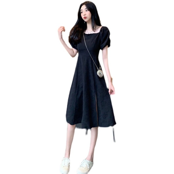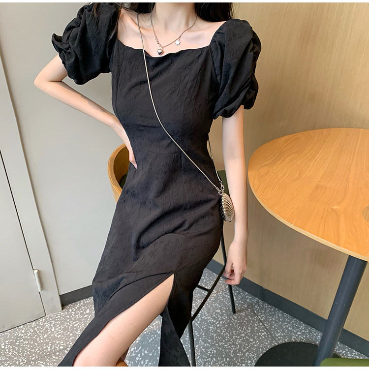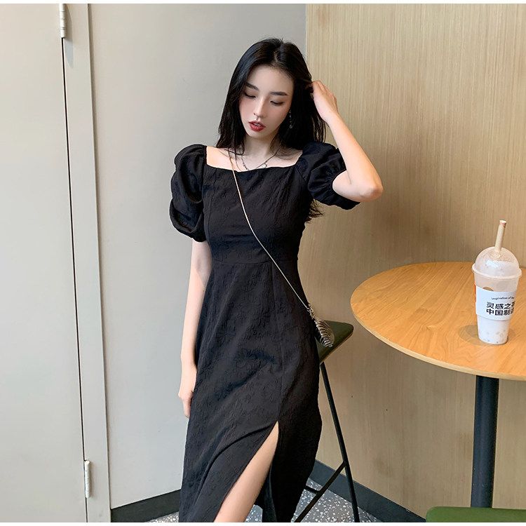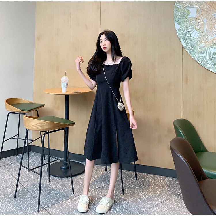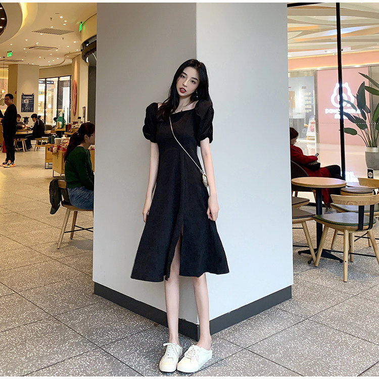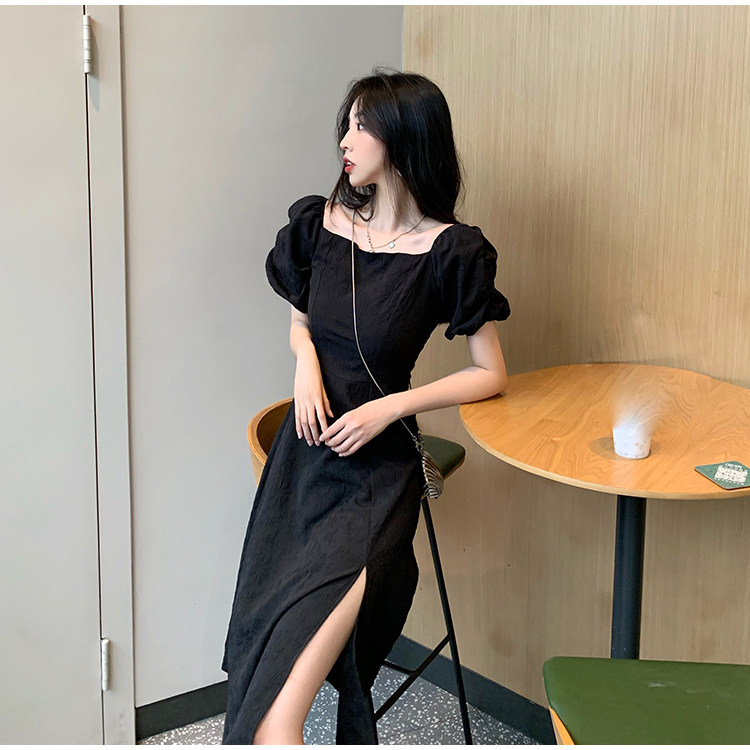 RM13144#法式小众心机方领泡泡袖小黑裙女夏赫本风开叉连衣裙