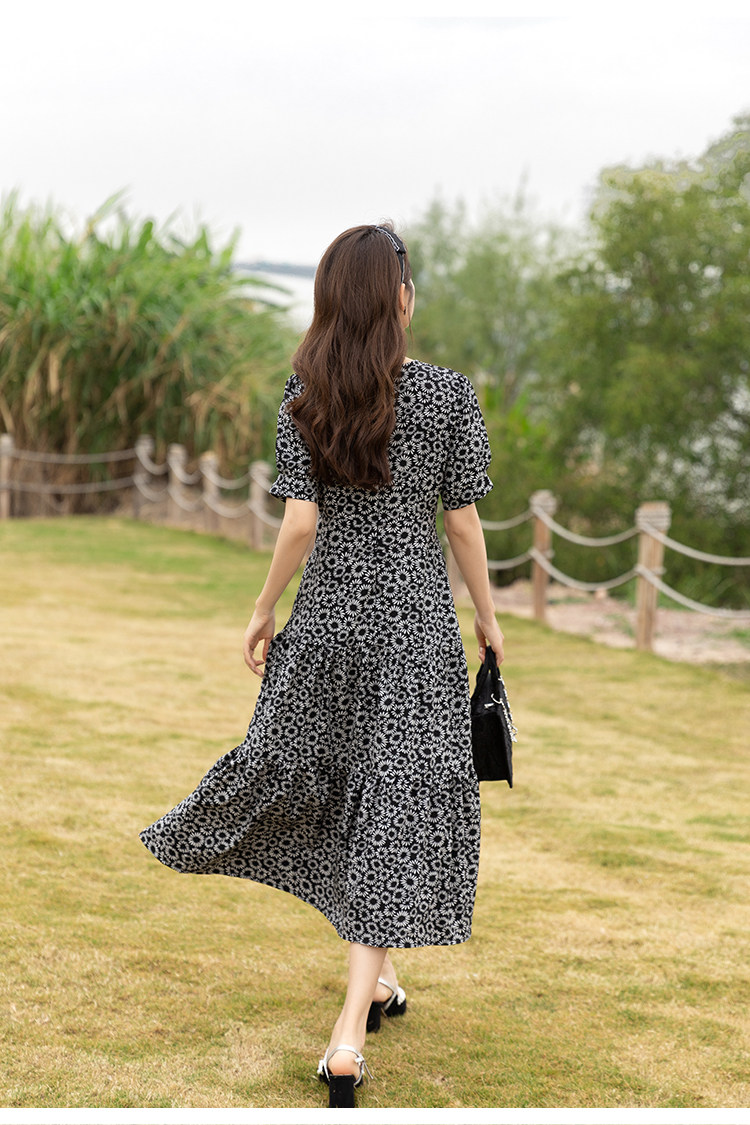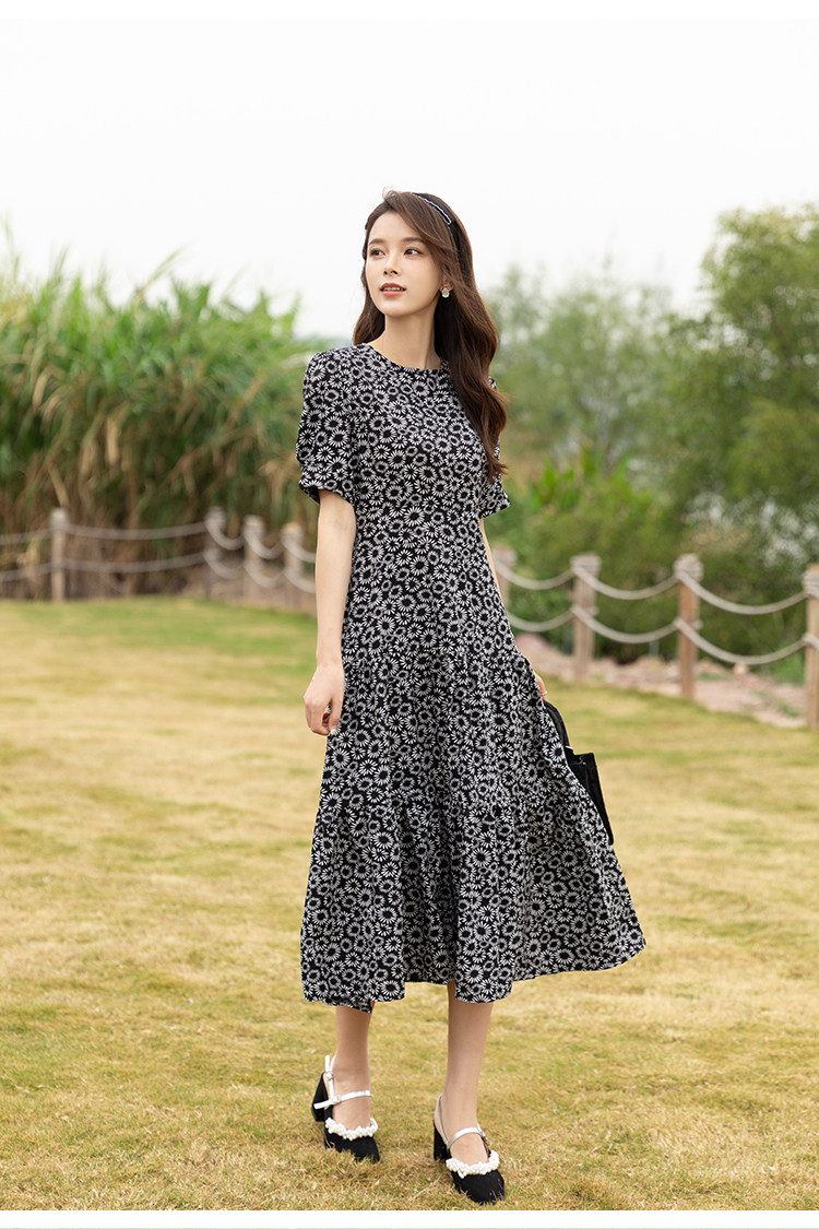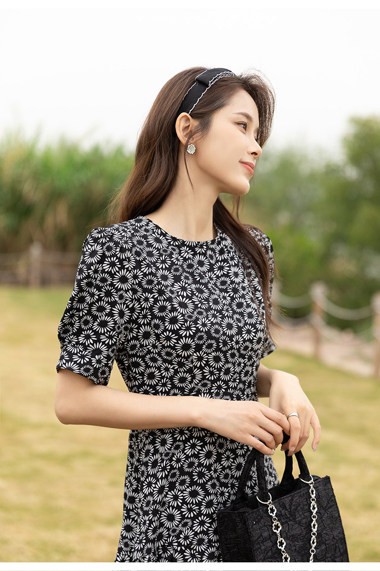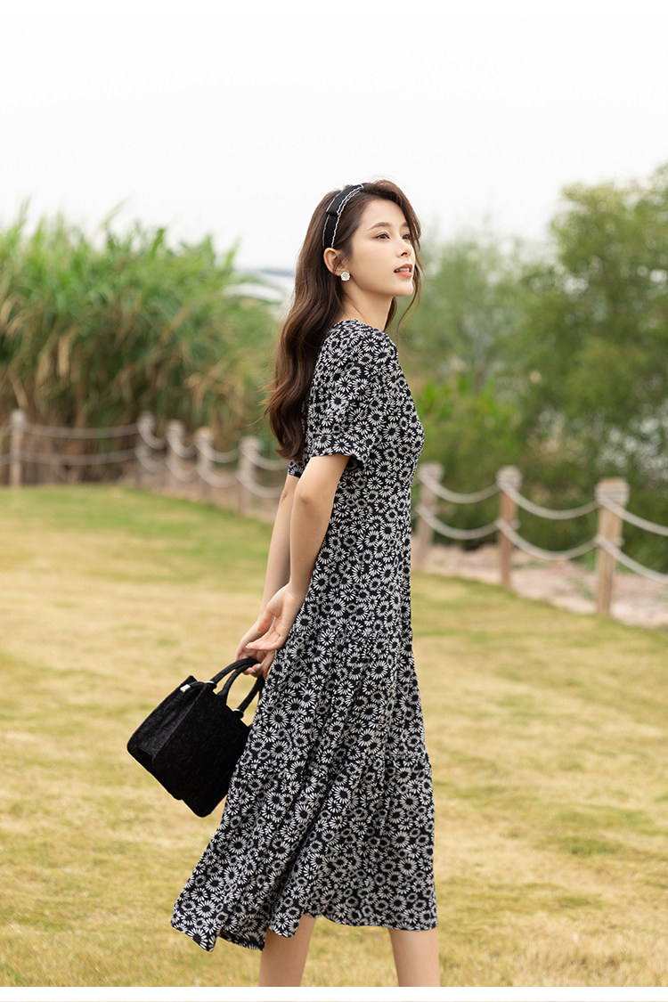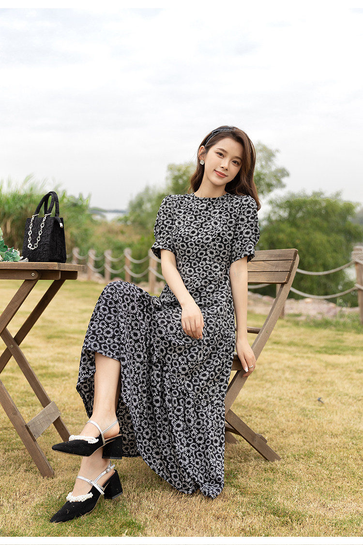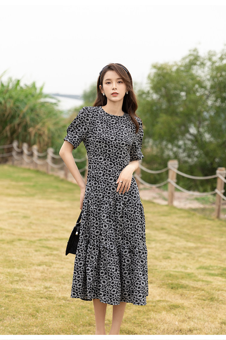 RM13148#小雏菊法式复古碎花连衣裙女收腰显瘦气质轻熟风小黑裙