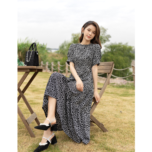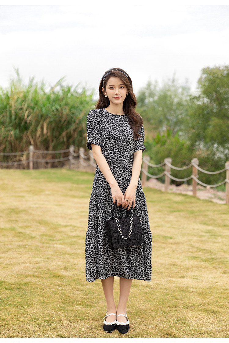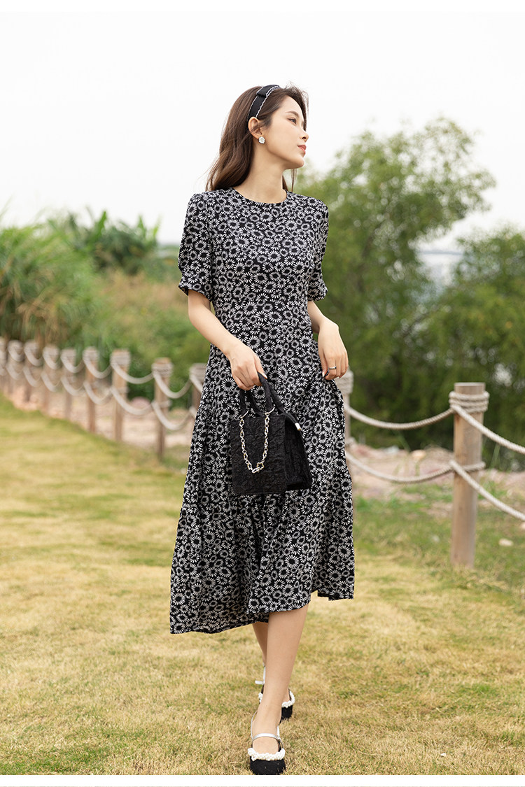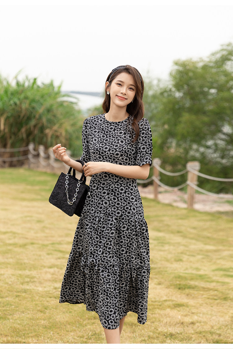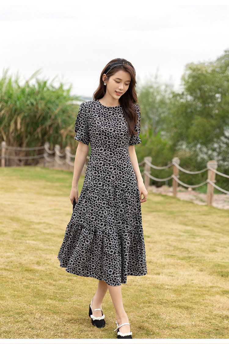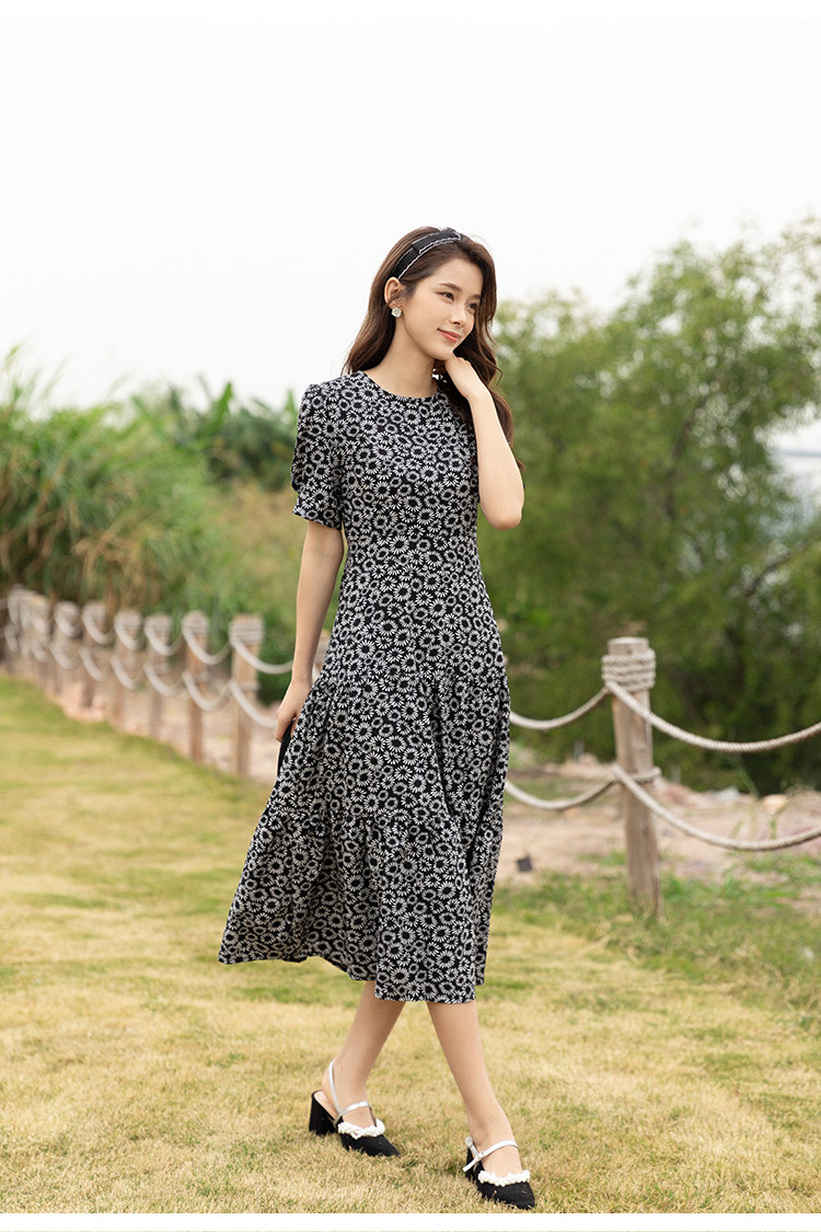 RM13148#小雏菊法式复古碎花连衣裙女收腰显瘦气质轻熟风小黑裙