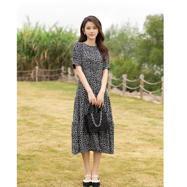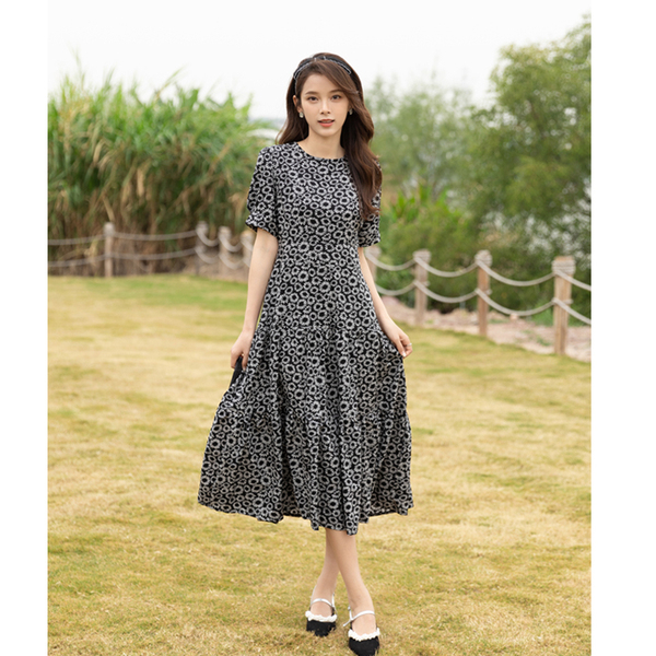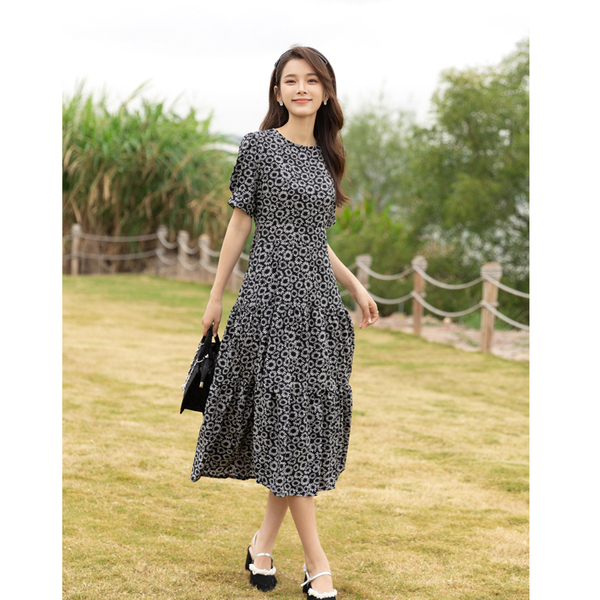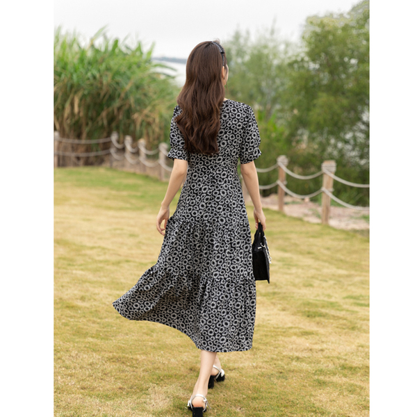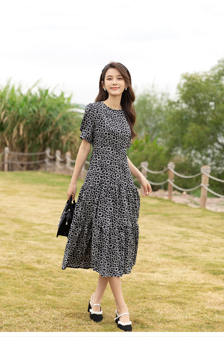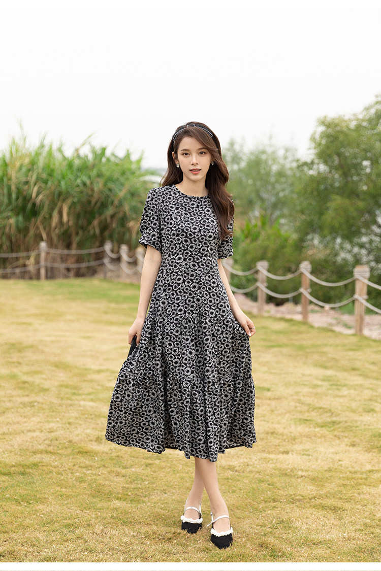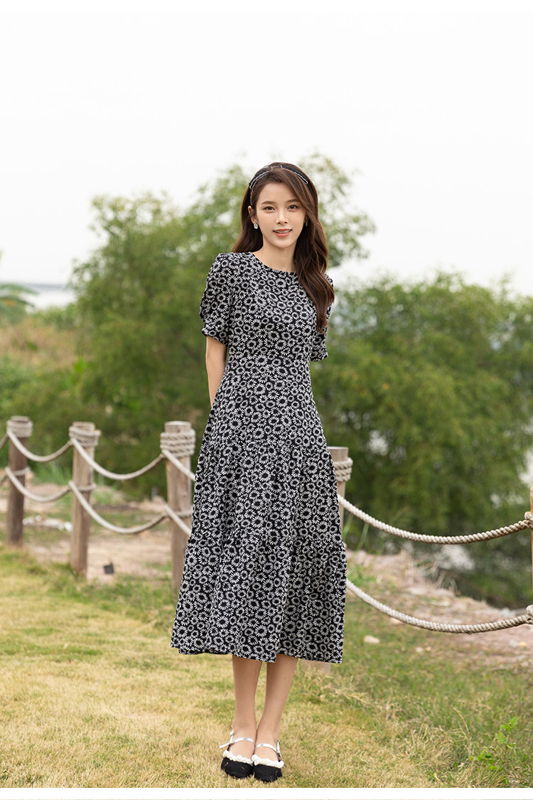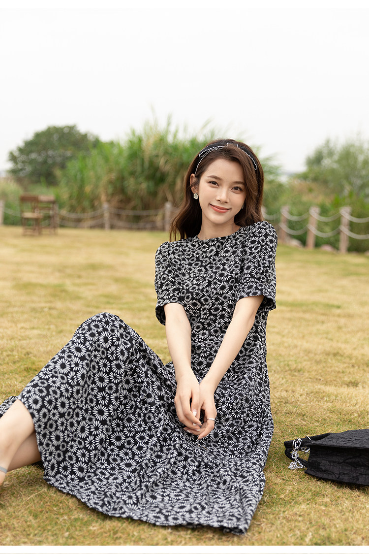 RM13148#小雏菊法式复古碎花连衣裙女收腰显瘦气质轻熟风小黑裙
