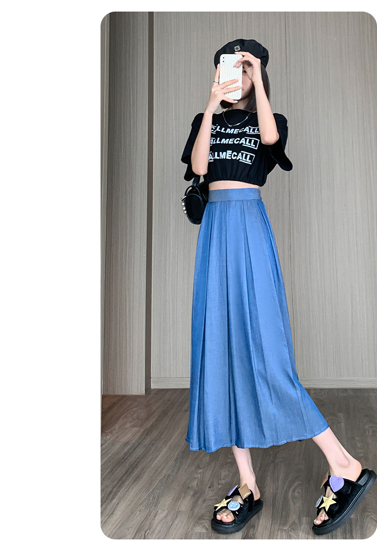 RM13388#复古垂感超薄天丝牛仔半身裙女夏季显瘦中长款休闲a字百褶裙