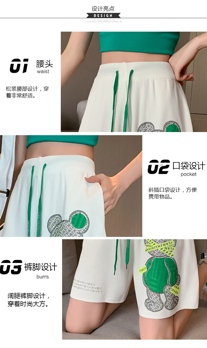 RM13420#韩版宽松黑色针织松紧腰小熊烫钻五分裤休闲显瘦阔腿短裤女夏装