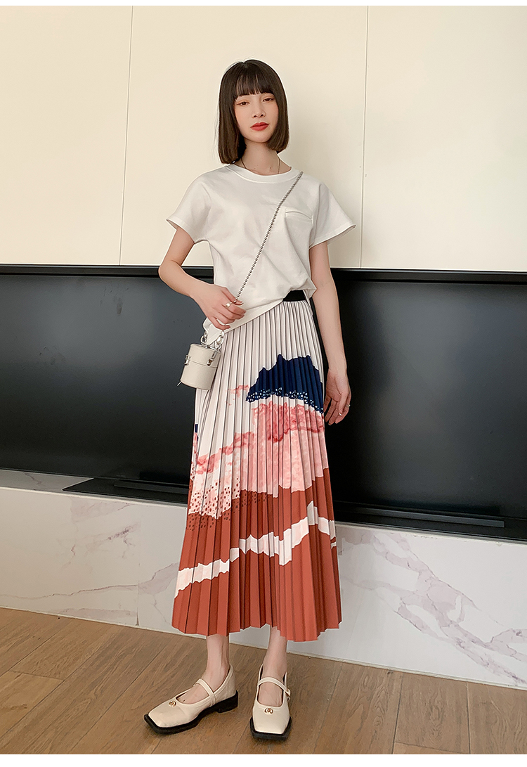 RM13423#春夏新款高腰显瘦遮胯水墨画百褶半身裙女设计感小众长休闲裙
