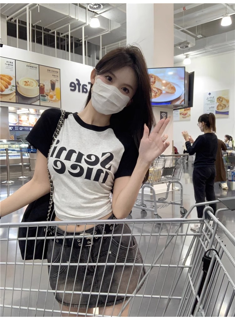 RM13488#美式复古抽绳插肩短袖t恤女夏季夏设计感小众正肩短款小个子上衣