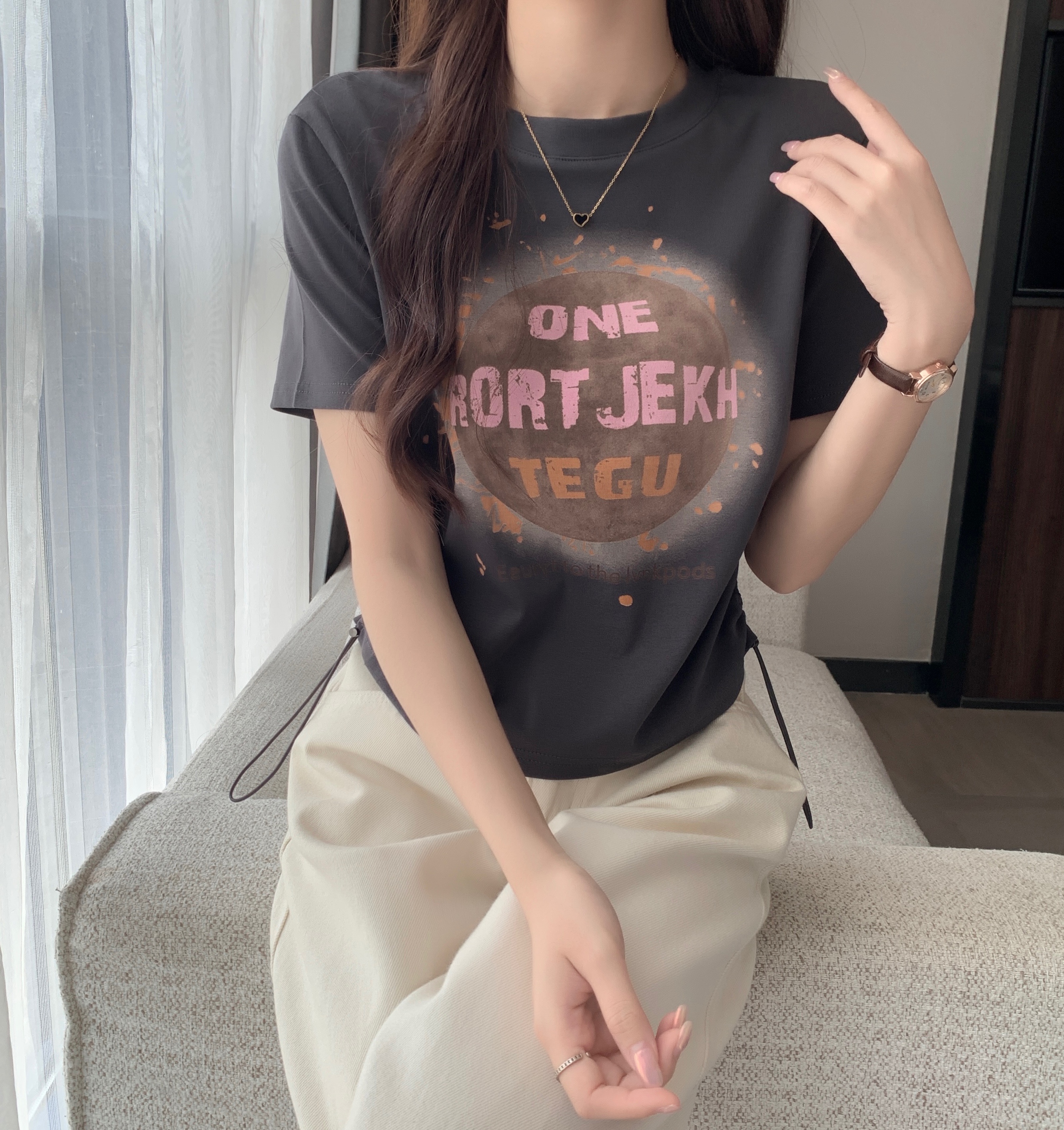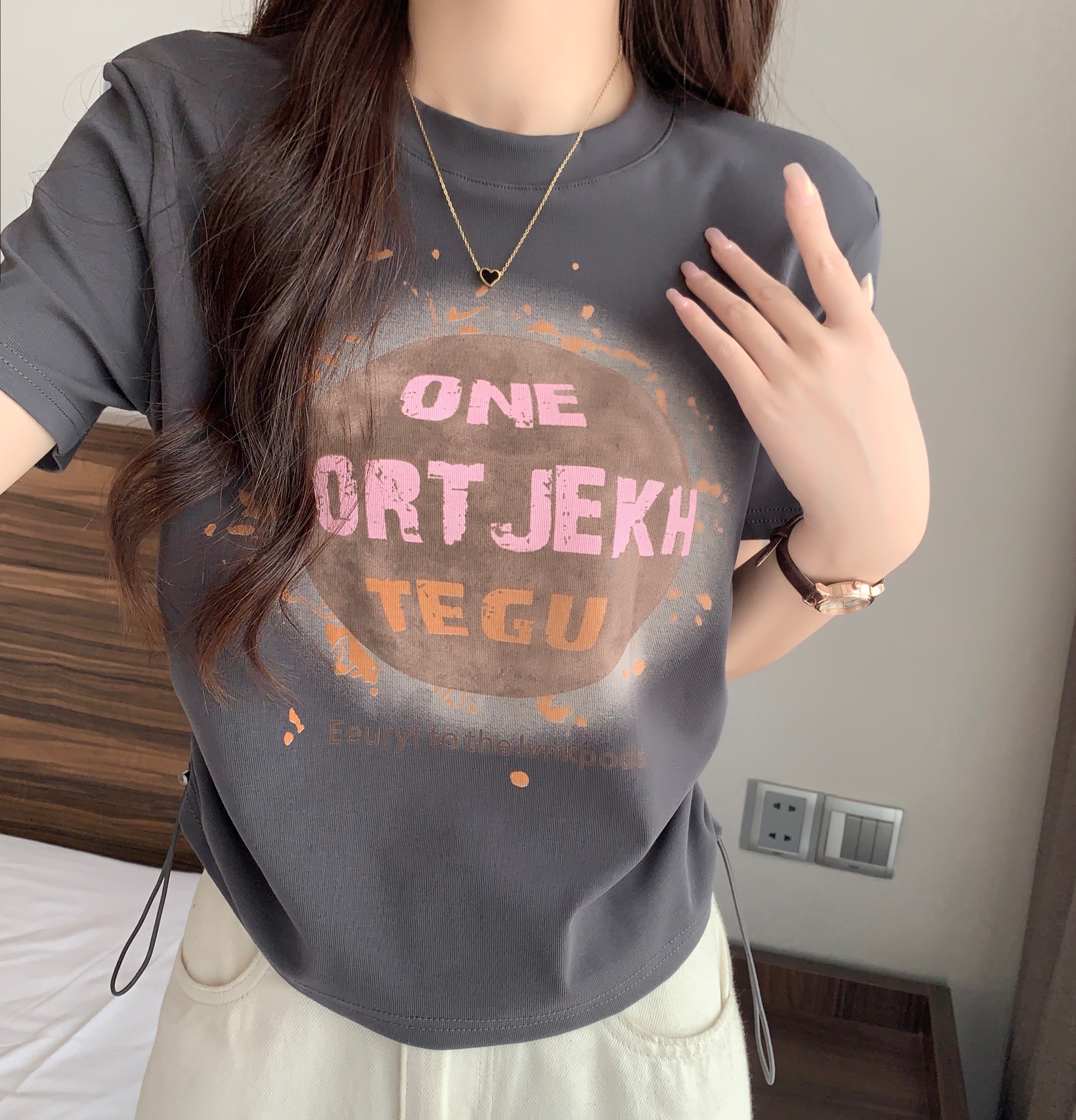 RM13489#大码~美式彩色字母印花短袖t恤女抽绳褶皱圆领上衣