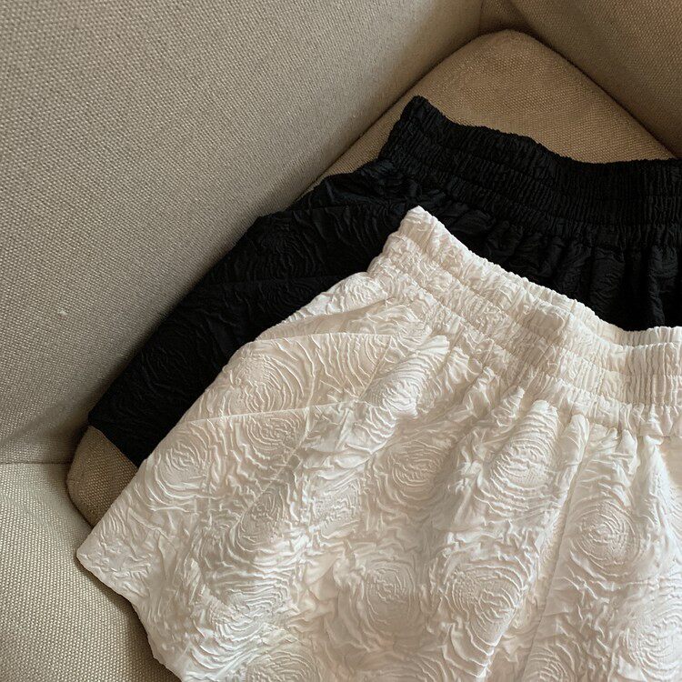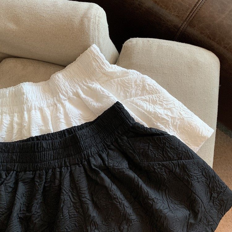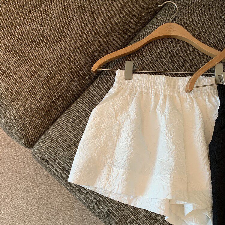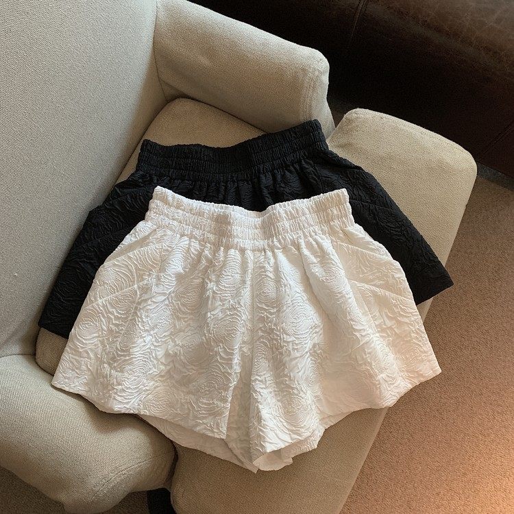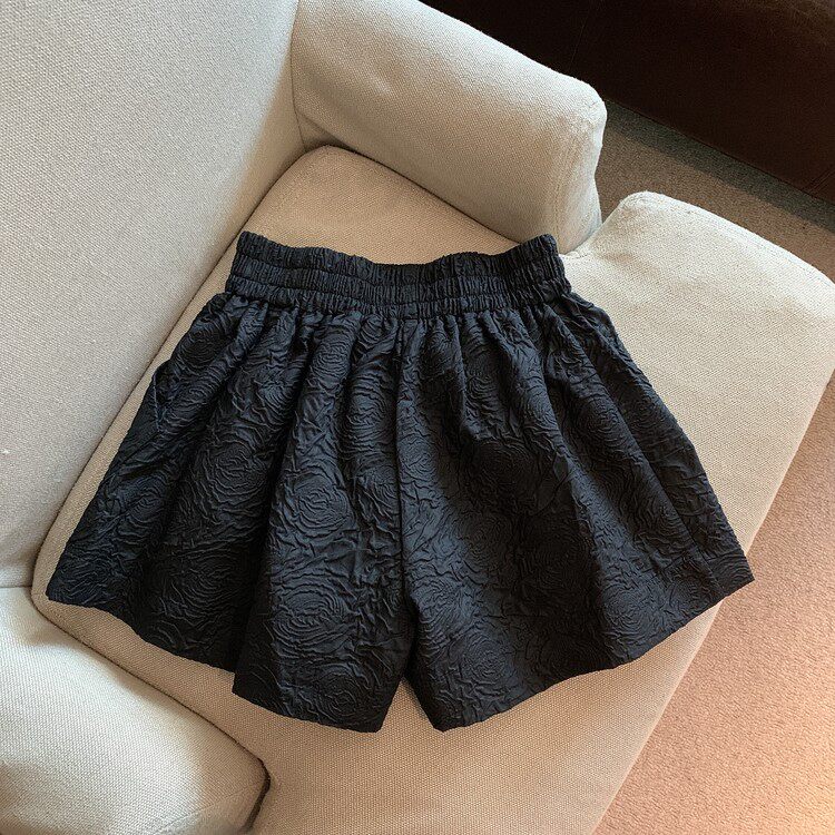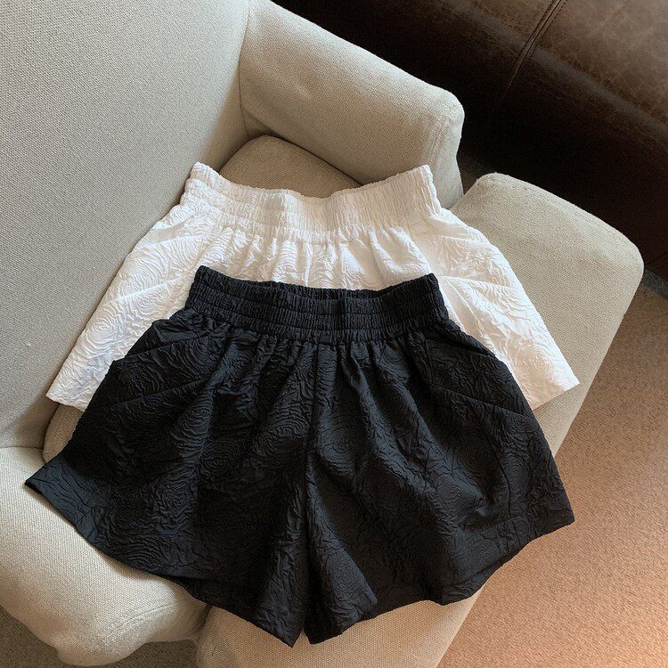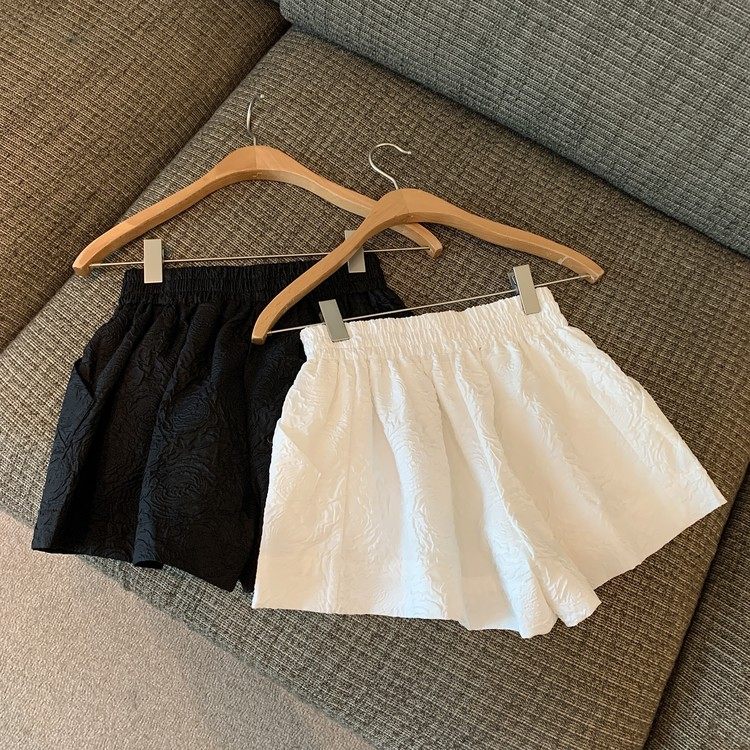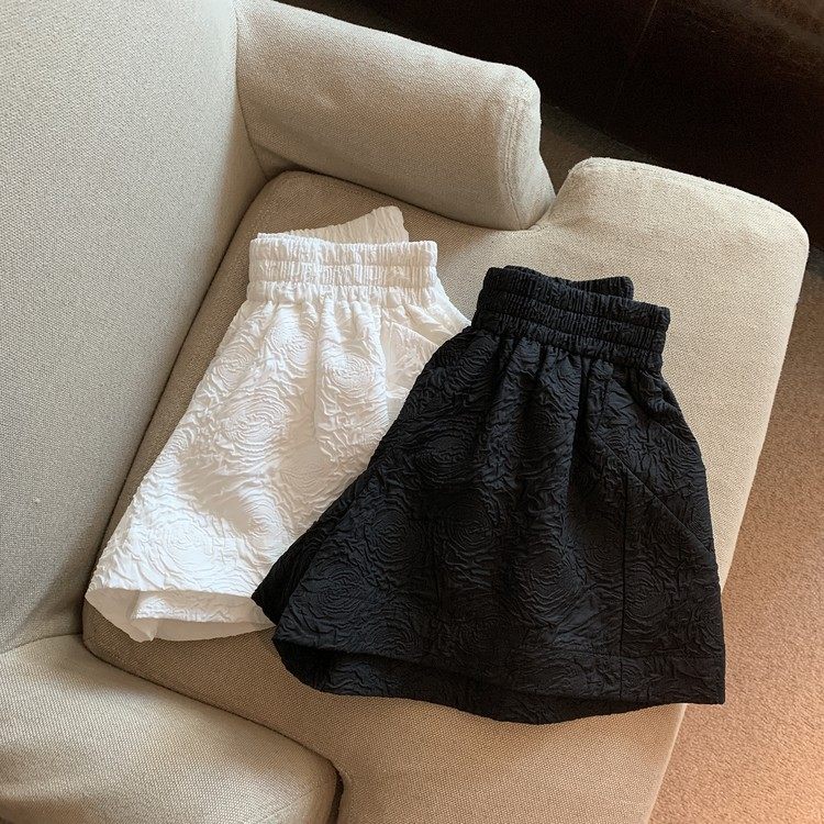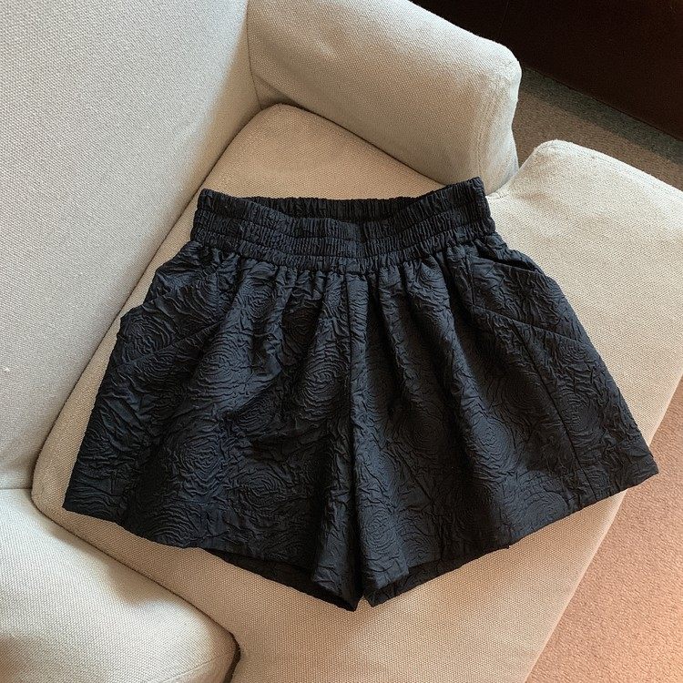 RM13528#夏季百搭小香风皱褶压花松紧腰阔腿纯色短裤