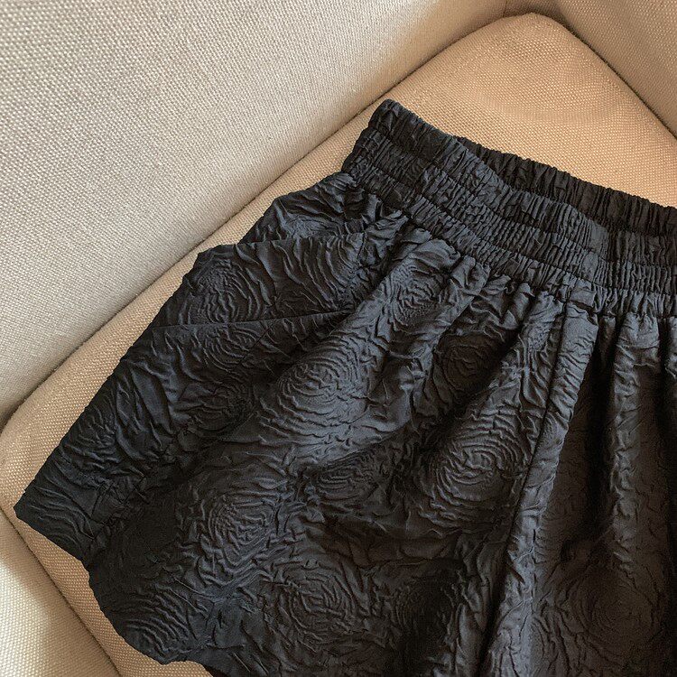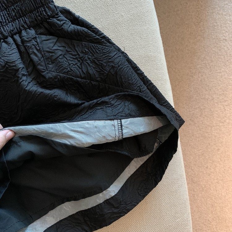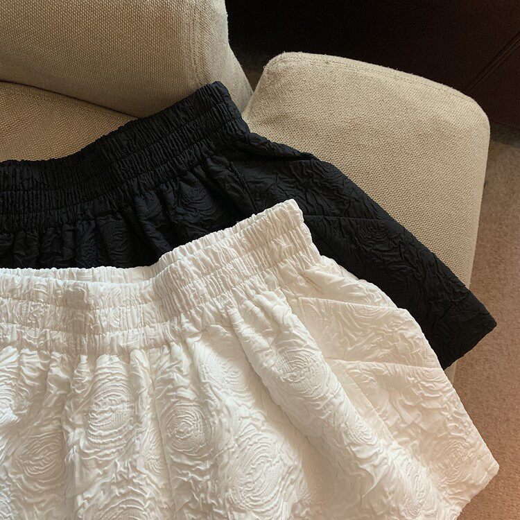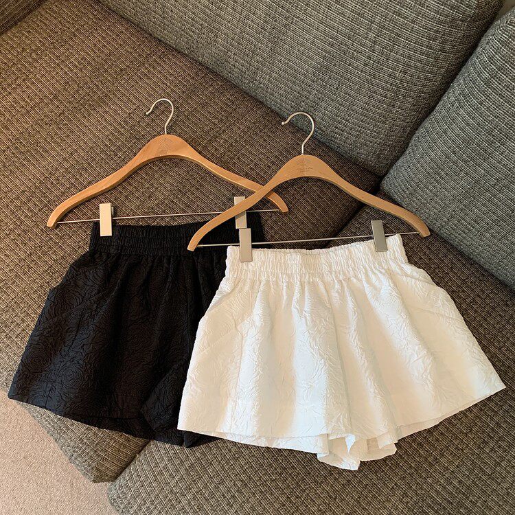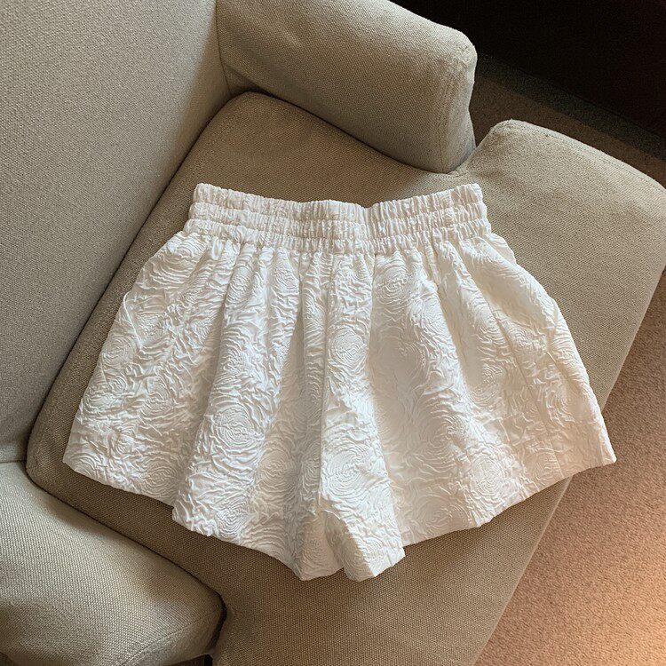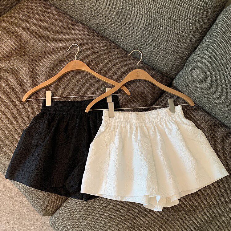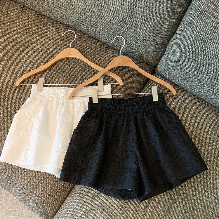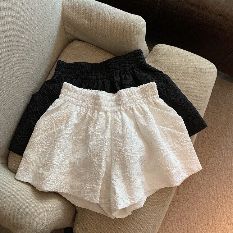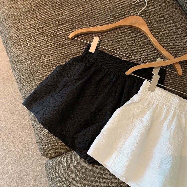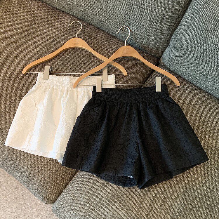 RM13528#夏季百搭小香风皱褶压花松紧腰阔腿纯色短裤