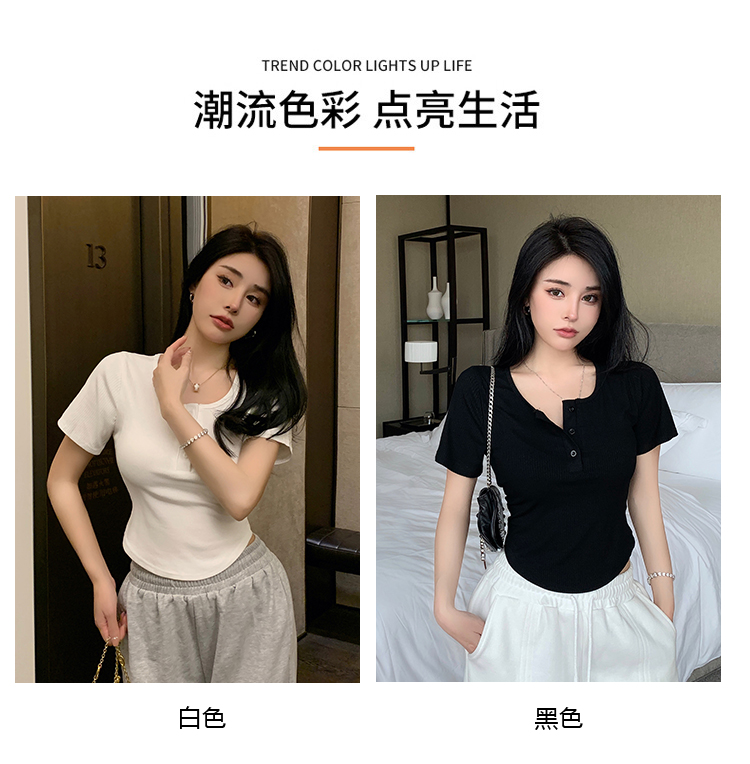 首页 > 女装批发-夏款 > T恤 > RM13543#白色纽扣短袖打底衫春夏韩版2023新款修身显瘦百搭短款女ins