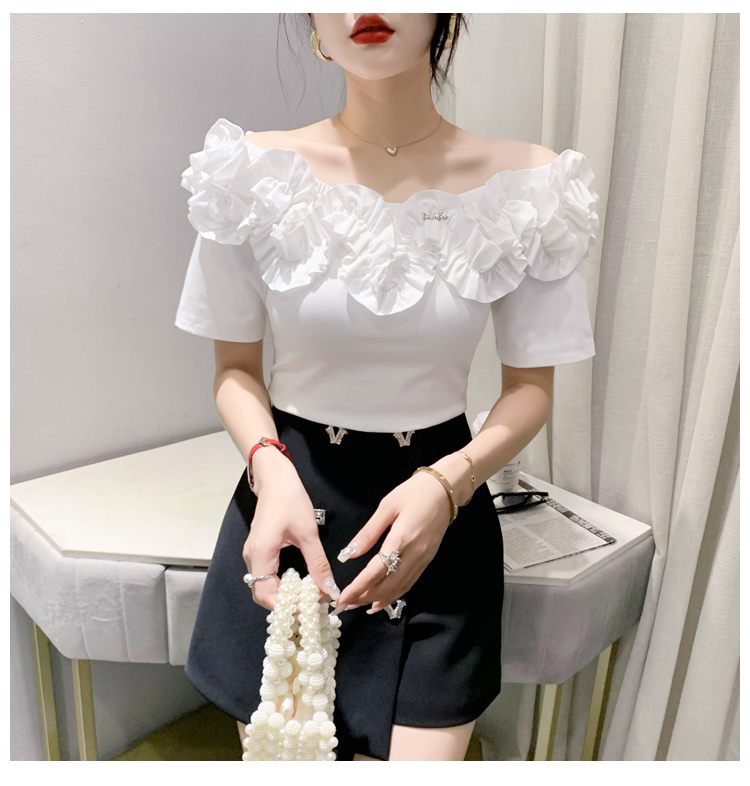 RM13621#夏季新款高级感露肩锁骨一字肩洋气纯色短袖设计感小衫上衣女