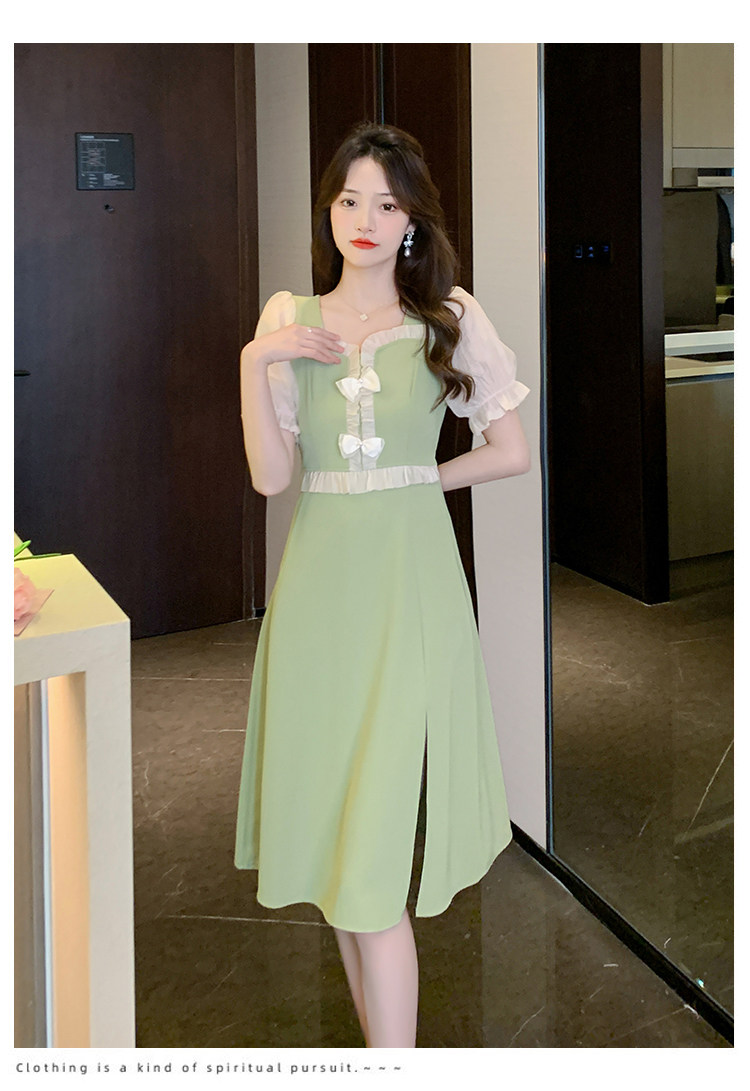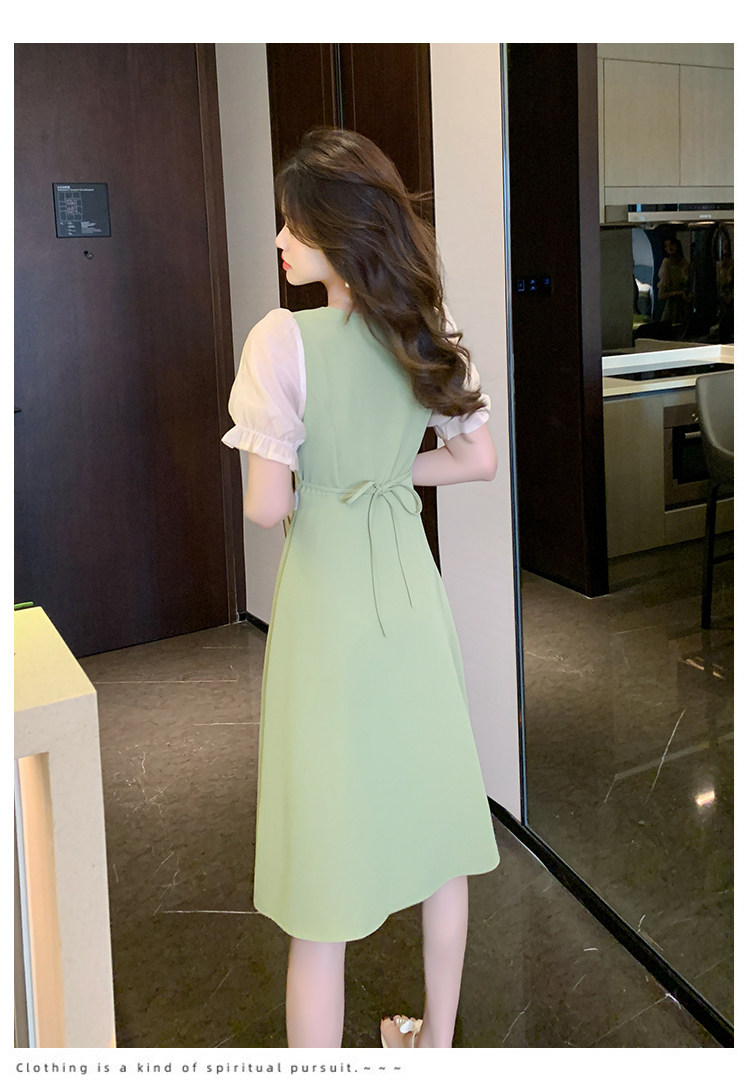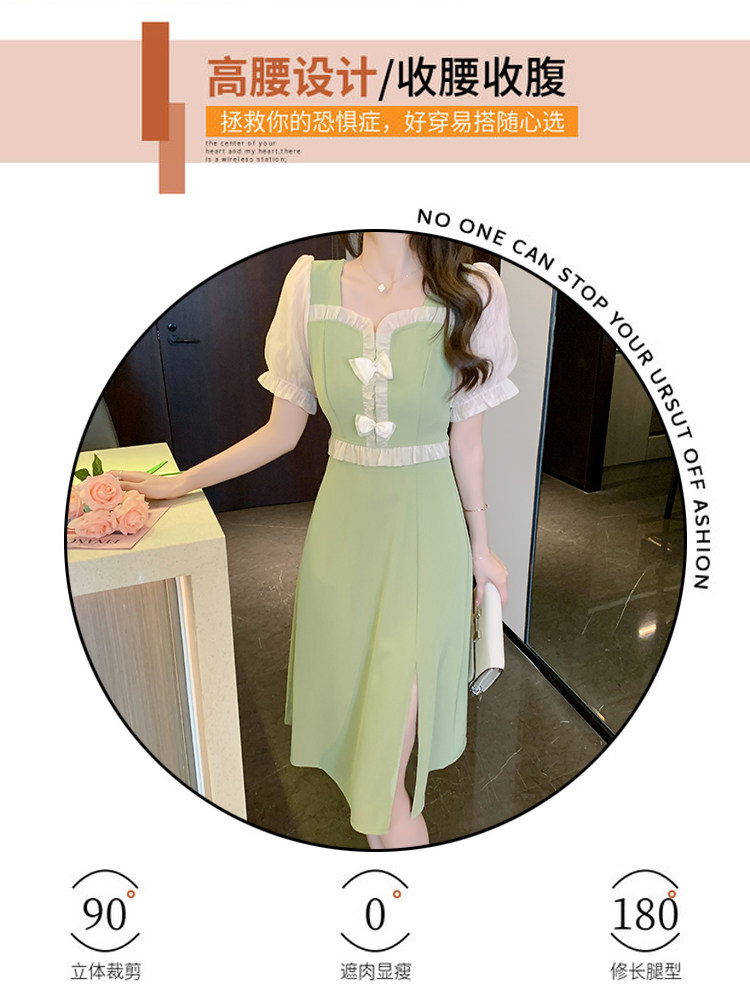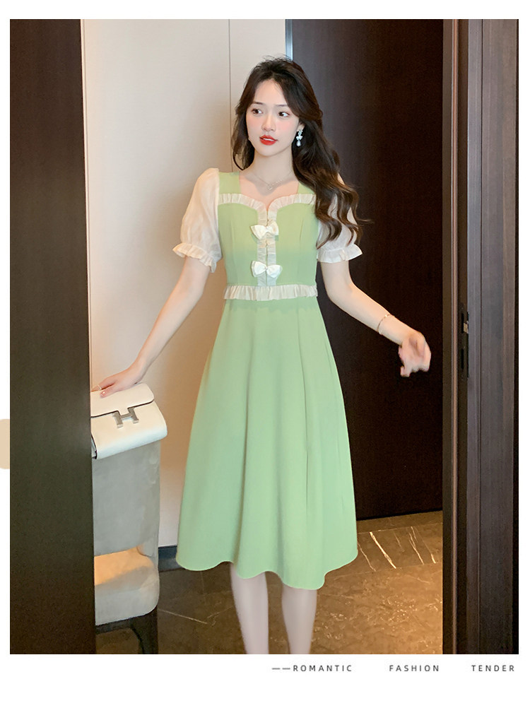 RM13629#夏季新款法式温柔风方领蝴蝶结拼接假两件套连衣裙