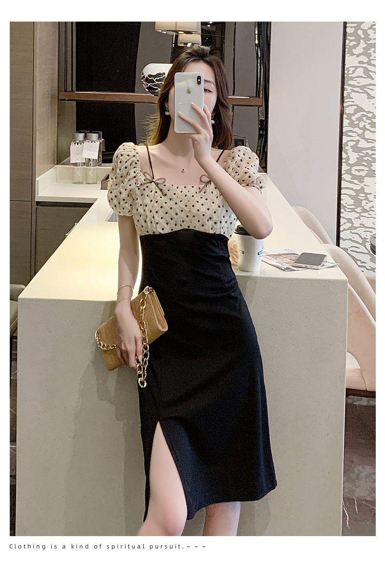 RM13632#新款法式露肩波点拼接假两件套高级感收腰开叉长款连衣裙