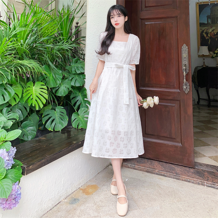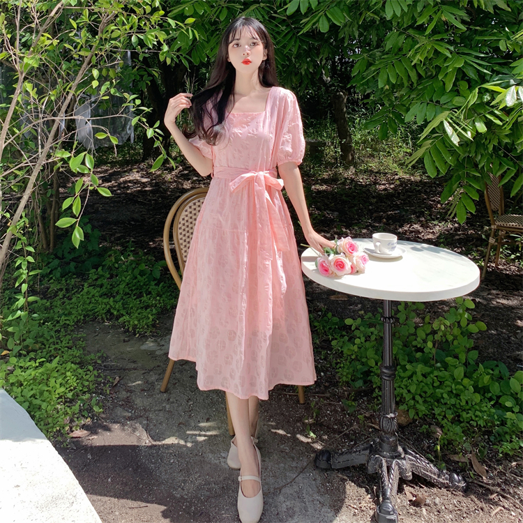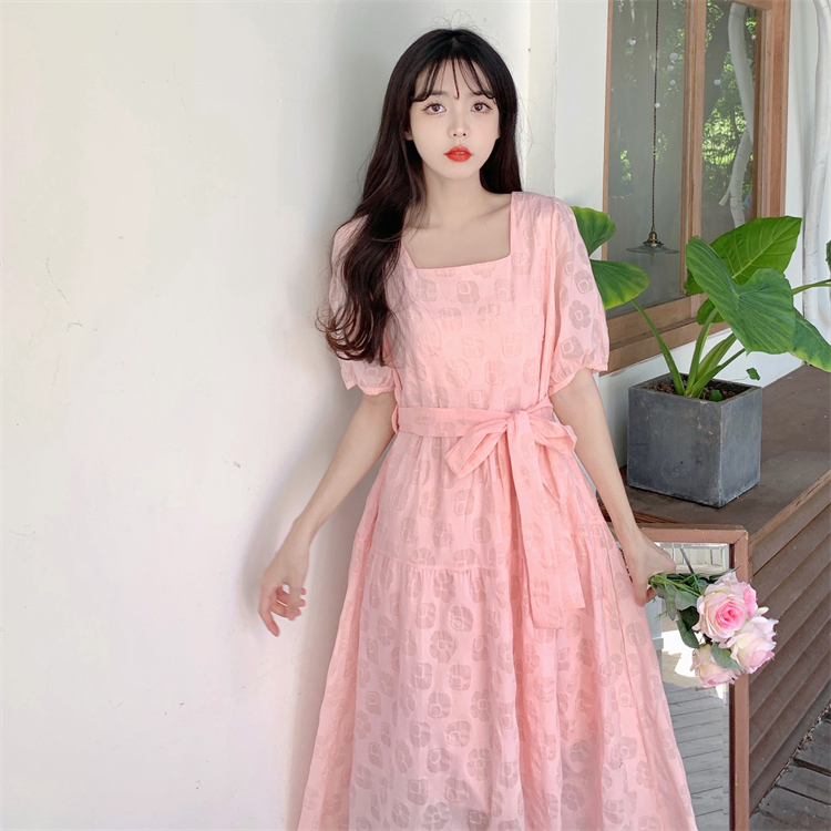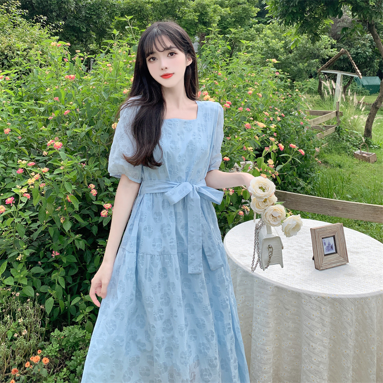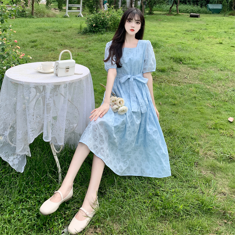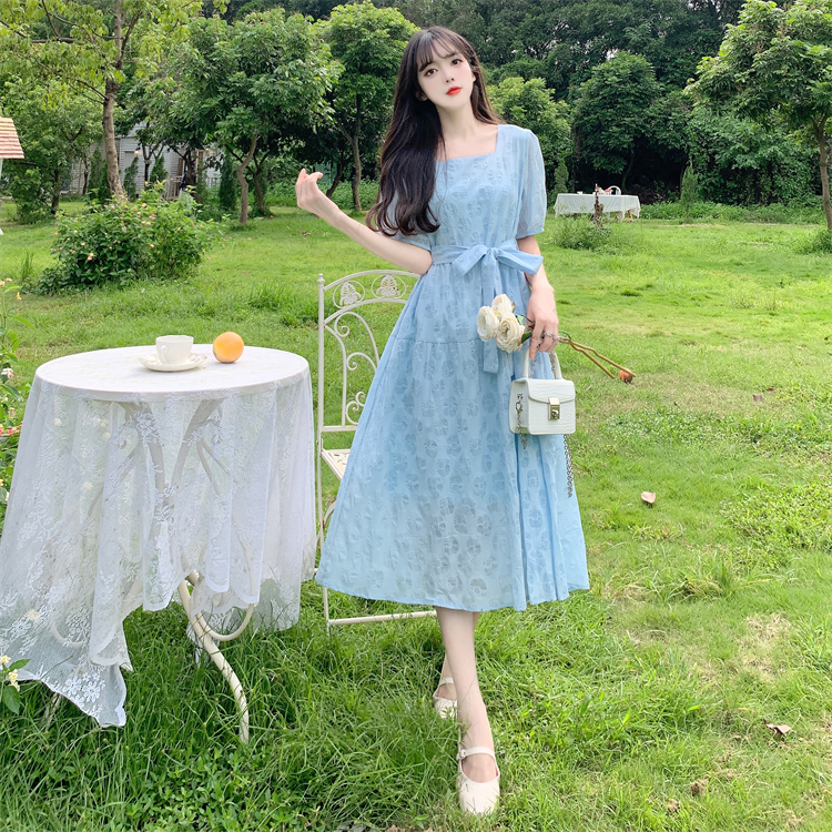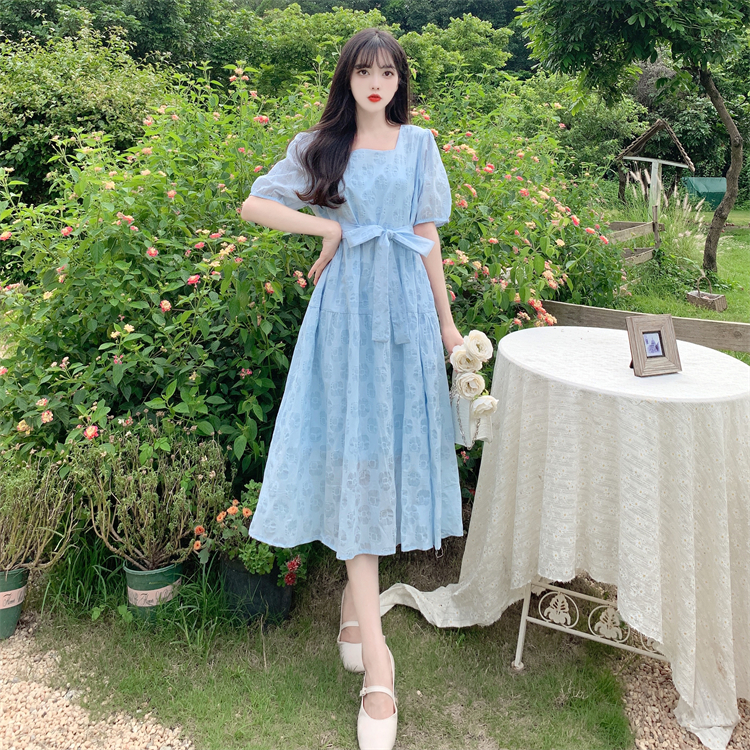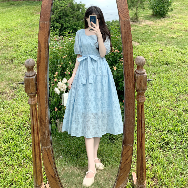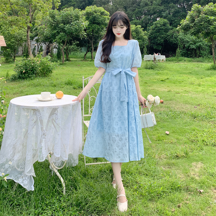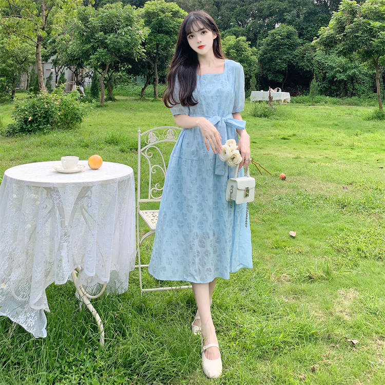 RM13688#大码女装夏小众设计高级感法式方领泡泡袖气质收腰系带a字连衣裙