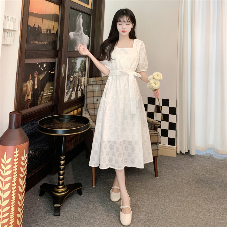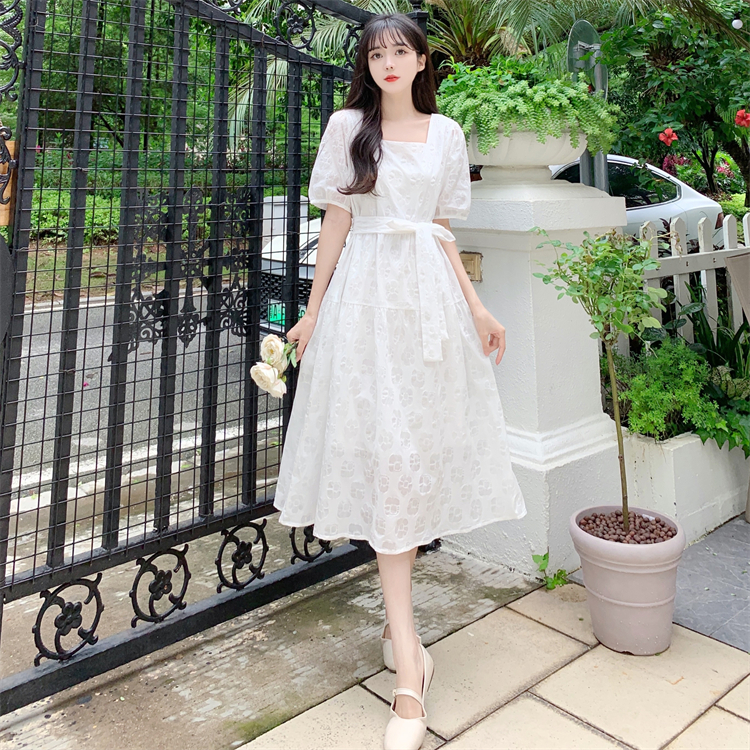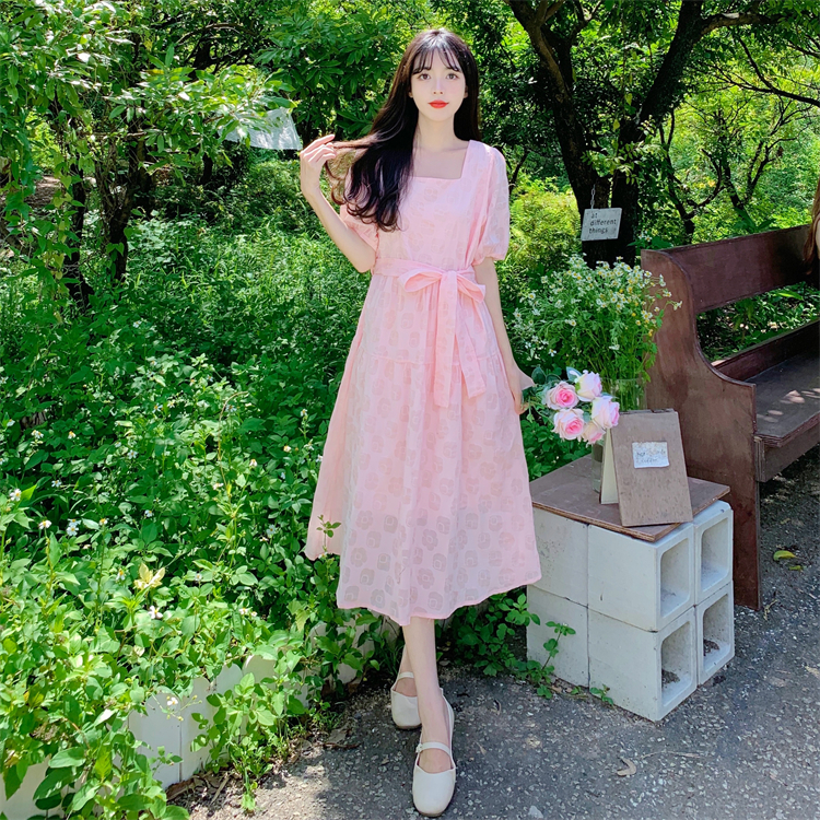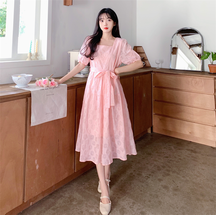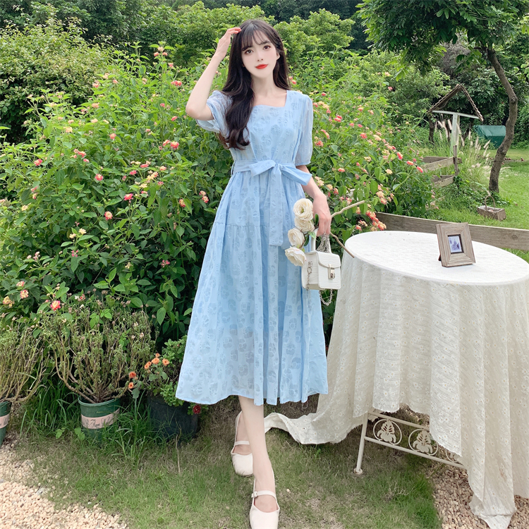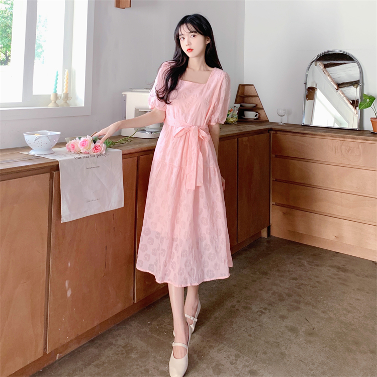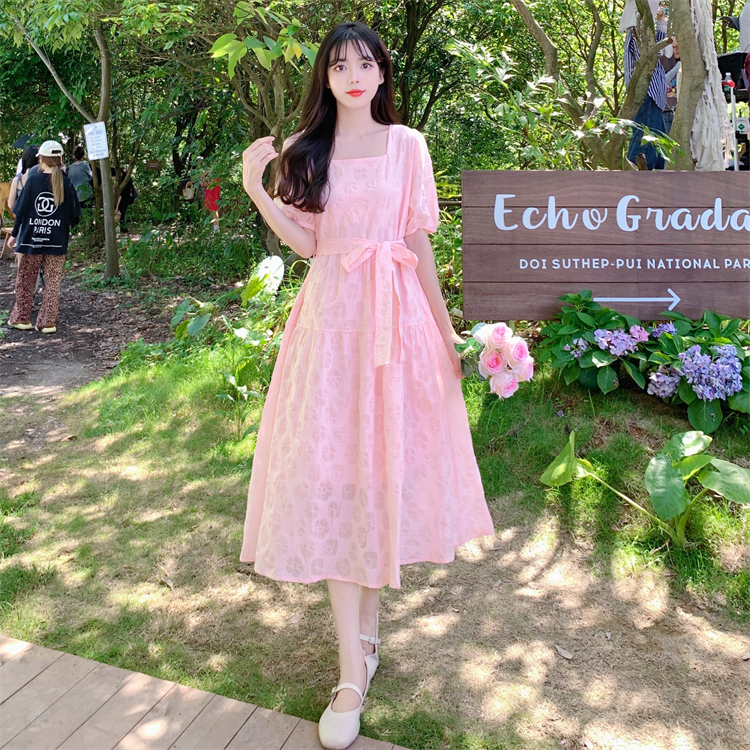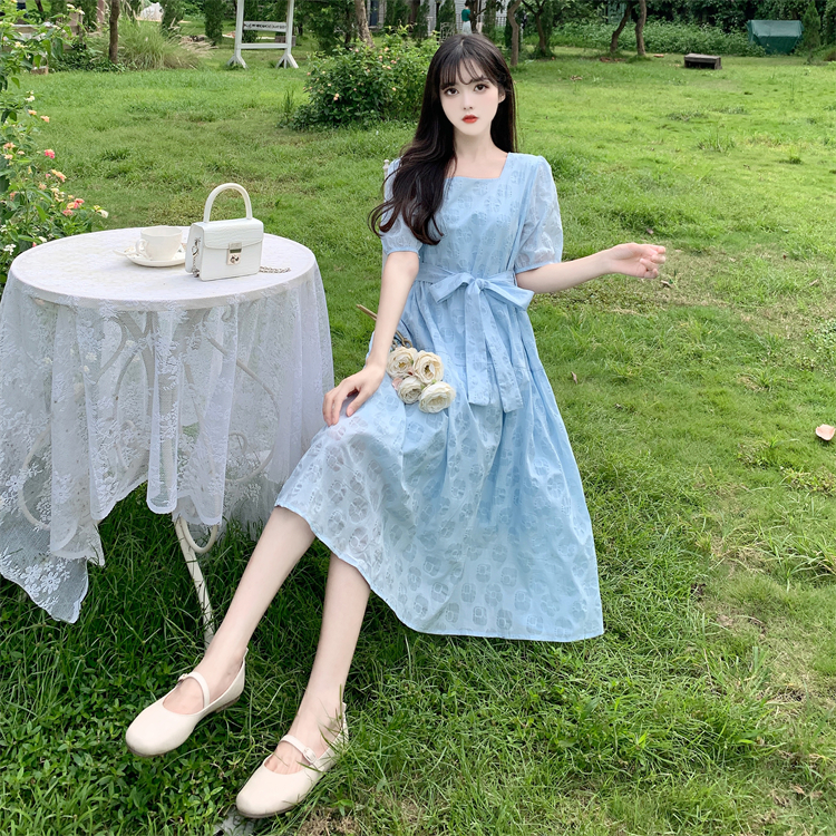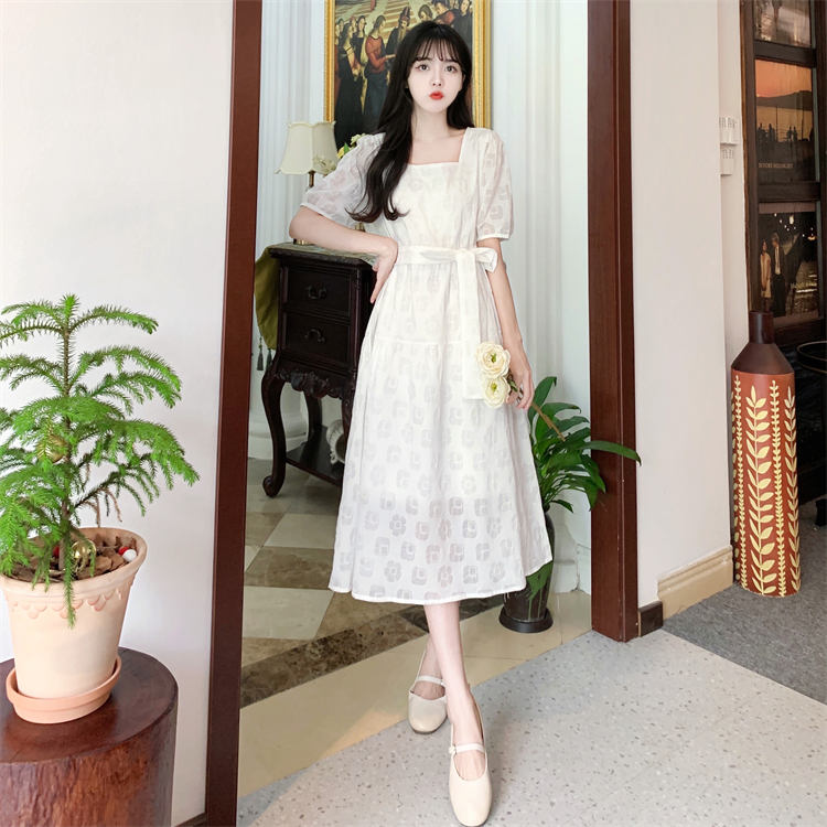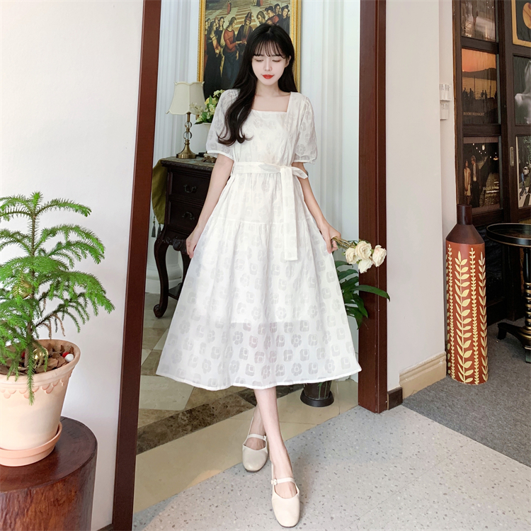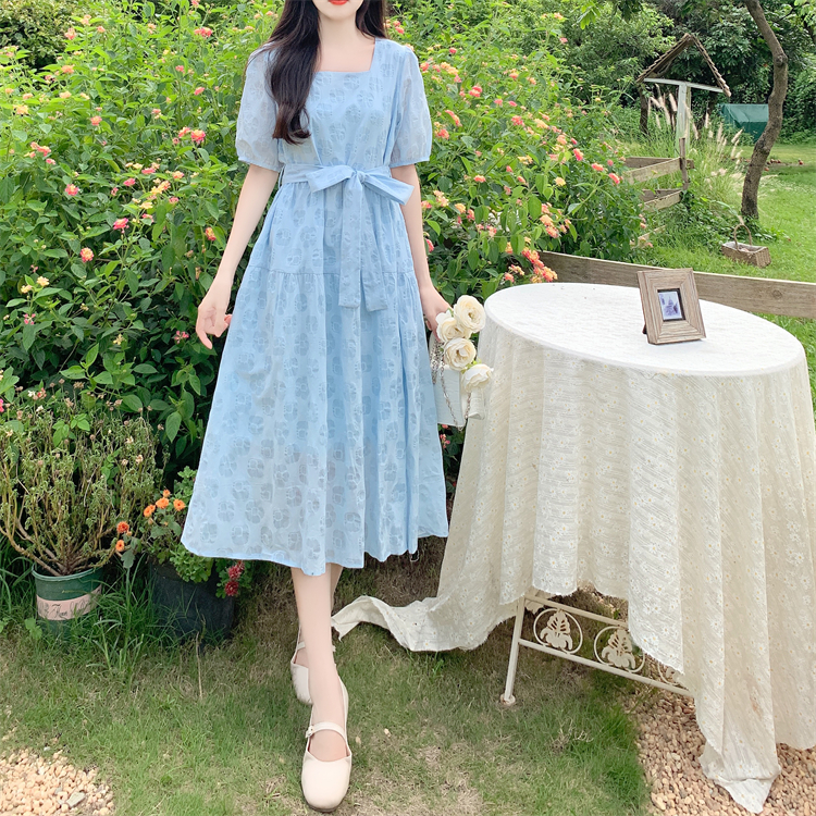 RM13688#大码女装夏小众设计高级感法式方领泡泡袖气质收腰系带a字连衣裙